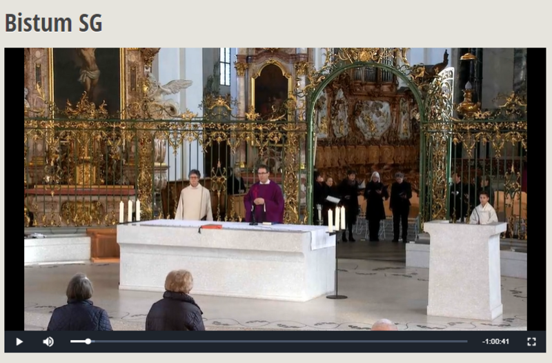 Die Dompfarrei überträgt mindestens bis Ostern jeweils einen Sonntagsgottesdienst aus der Kathedrale per live stream in Bild und Ton auf bistumsg-live.ch. Die Übertragung ist speziell für Menschen gedacht, die durch Vorerkrankungen und Alter stärker gefährdet sind durch das Corona-Virus oder für Bewohnerinnen und Bewohner in Alters- und Pflegeheimen.