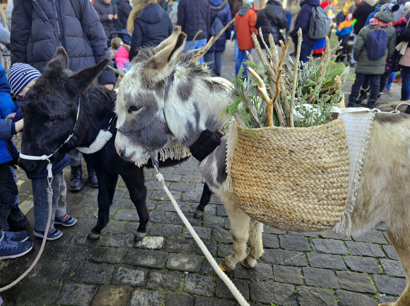 Die St.Galler Innenstadt verwandelte sich am Sonntag zu einer Kinderwagen-City. Selten sind an einem kalten, aber trockenen Tag so viele Familien in der südlichen Altstadt unterwegs gewesen. Grund für die zahlreichen Besuchenden war das Freilichtspiel Weihnachtsreise, das dieses Jahr bereits zum siebten Mal an drei verschiedenen Standorten durchgeführt wurde. Auf der Marktgasse sprach ein erzürnter Herodes böse Befehle aus, auf dem Grüningerplatz rasteten Hirten, und auf der Klosterwiese sorgten sich Maria und Josef um ihren neu geborenen Sohn. Für die Kinder waren aber vor allem die Tiere das besondere Highlight. Bei den Hirten etwa standen sie Schlange, um eines der vier Zwergesel zu streicheln. Auch fünf Schafe konnten bestaunt werden. Die Tiere wiederum genossen sichtlich die Aufmerksamkeit der Kinder. Etwas anders verhielt es sich bei zwei anderen vierbeinigen Protagonisten. Ein Dromedar und ein Trampeltier stachen aus der Menschenmasse heraus und machten mit ihrem coolen und ruhigen Blick vor allem den Erwachsenen Eindruck.
