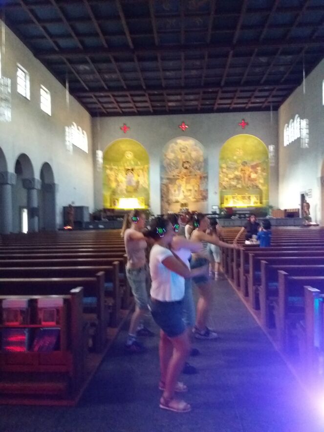 Rund 50 Jugendliche trafen sich in der Dreifaltigkeitskirche Heiligkreuz um den Start der Sommerferien zu feiern. Bei der Silent Disco erhält jede Person einen Kopfhörer auf dem sie direkt zwischen drei Playlists auswählen kann. An den farbigen Lichtern an den Kopfhörern ist zu sehen wer auf welcher Playlist ist, so sieht man wer zum gleichen Lied tanzt wie man selbst.