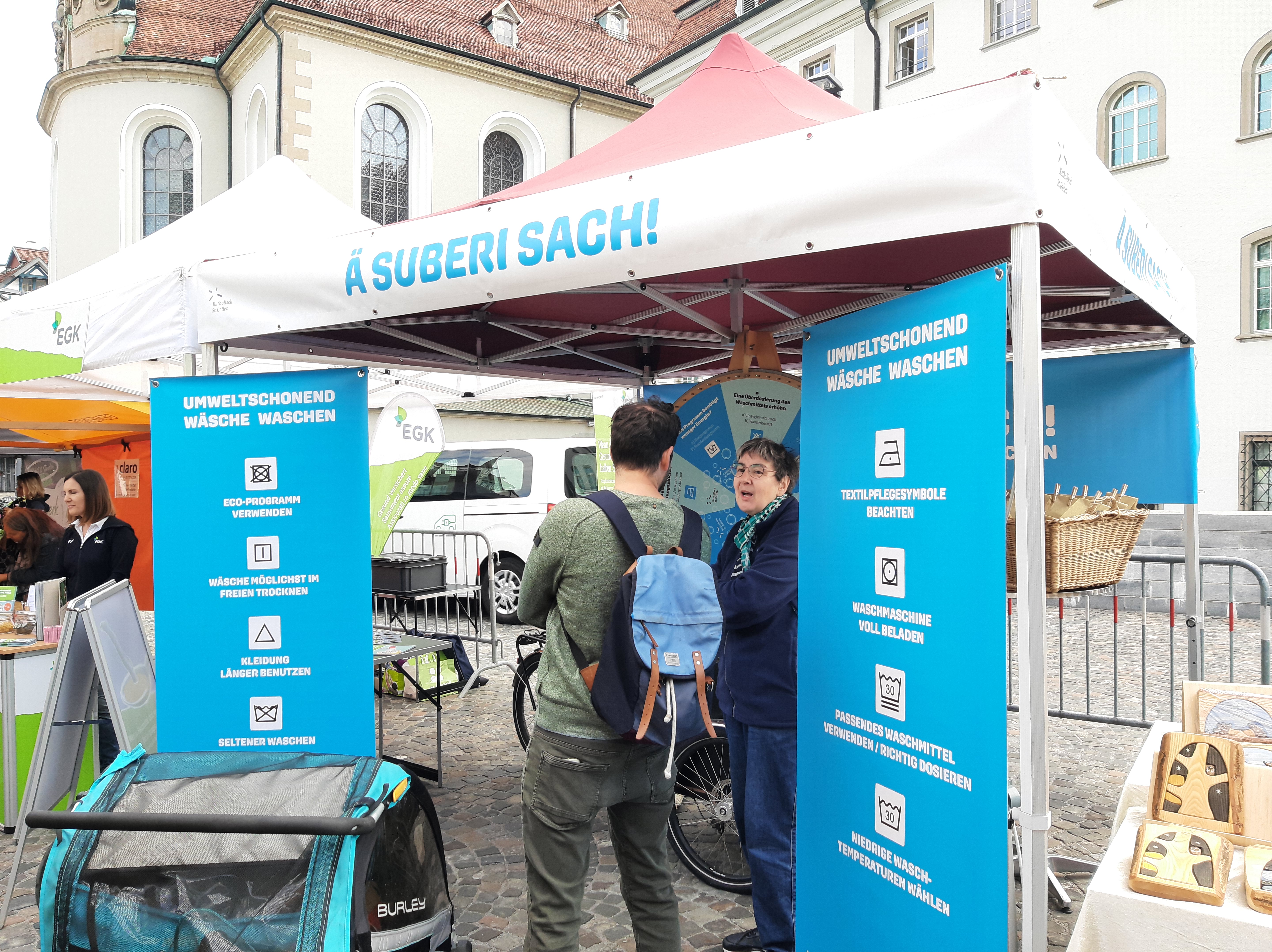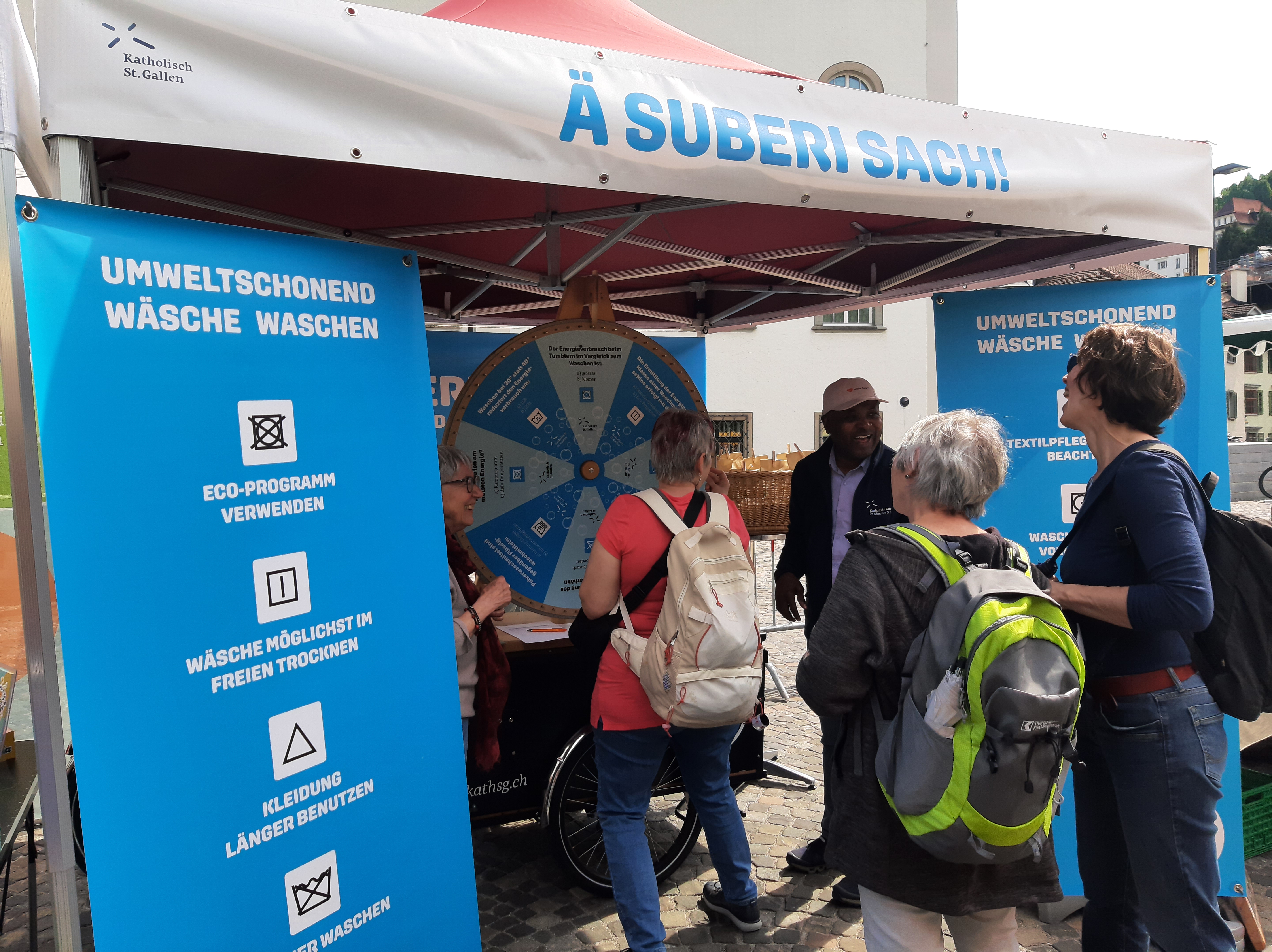 Am diesjährigen Ökomarkt drehte sich am rege besuchten Infostand der Cityseelsorge alles ums umweltschonende Waschen. Die Standbesuchenden erhielten einfach umsetzbare Tipps, wie sie das Wäsche waschen umweltschonender gestalten können. Fragen wie warum das Eco-Programm trotz längerer Laufzeit umweltschonender ist oder was die Vorzüge von Pulver- gegenüber Flüssigwaschmittel sind, führten zu angeregten Diskussionen mit oftmals vielen Aha-Effekten. Beim Glücksrad konnten die Besuchenden ihr Wissen testen und im Gespräch vertiefen. Eine eigens für diesen Anlass erarbeitete Broschüre wurde den Besuchenden, zusammen mit einer Fleckenseife, als Geschenk überreicht.