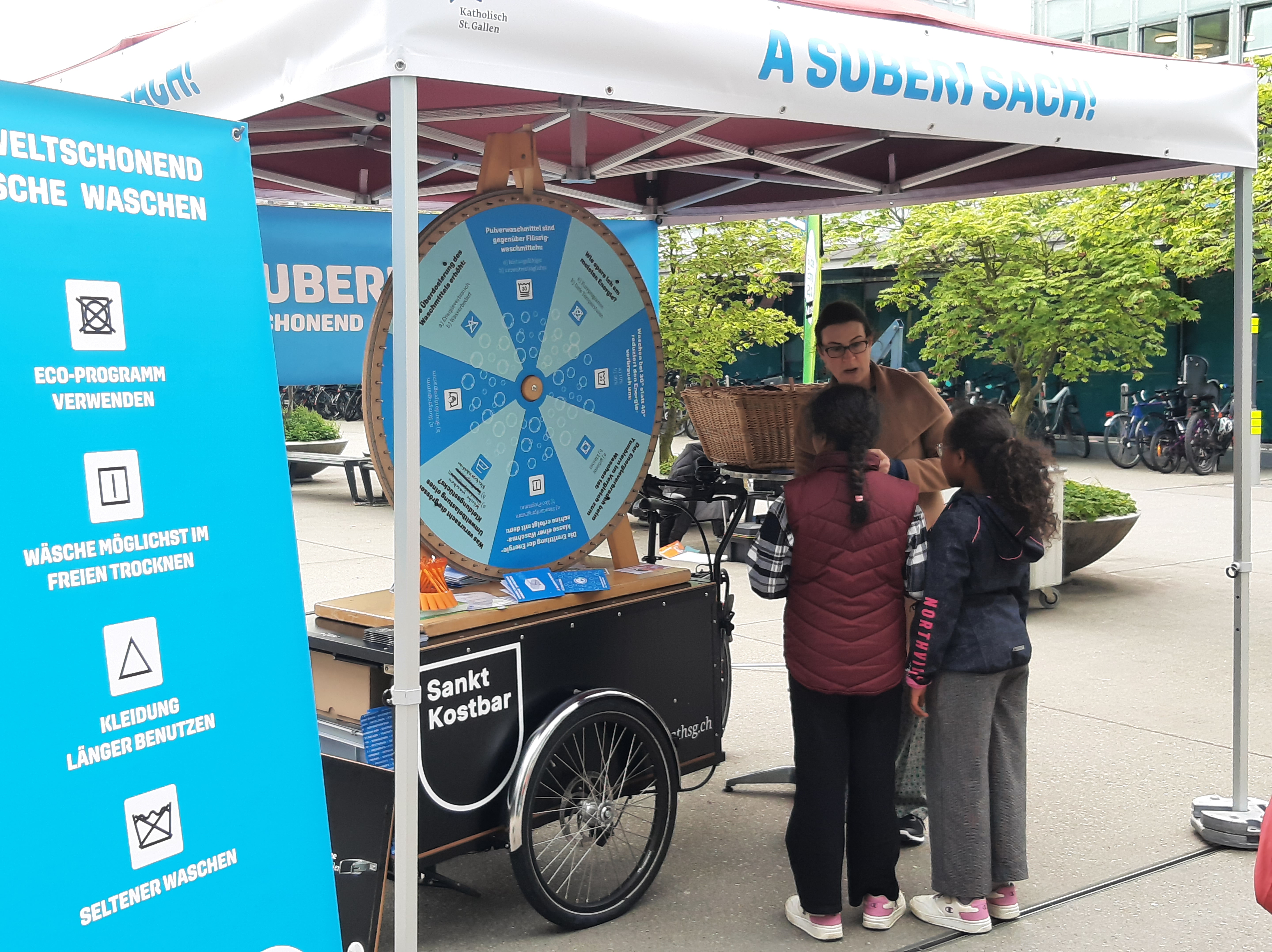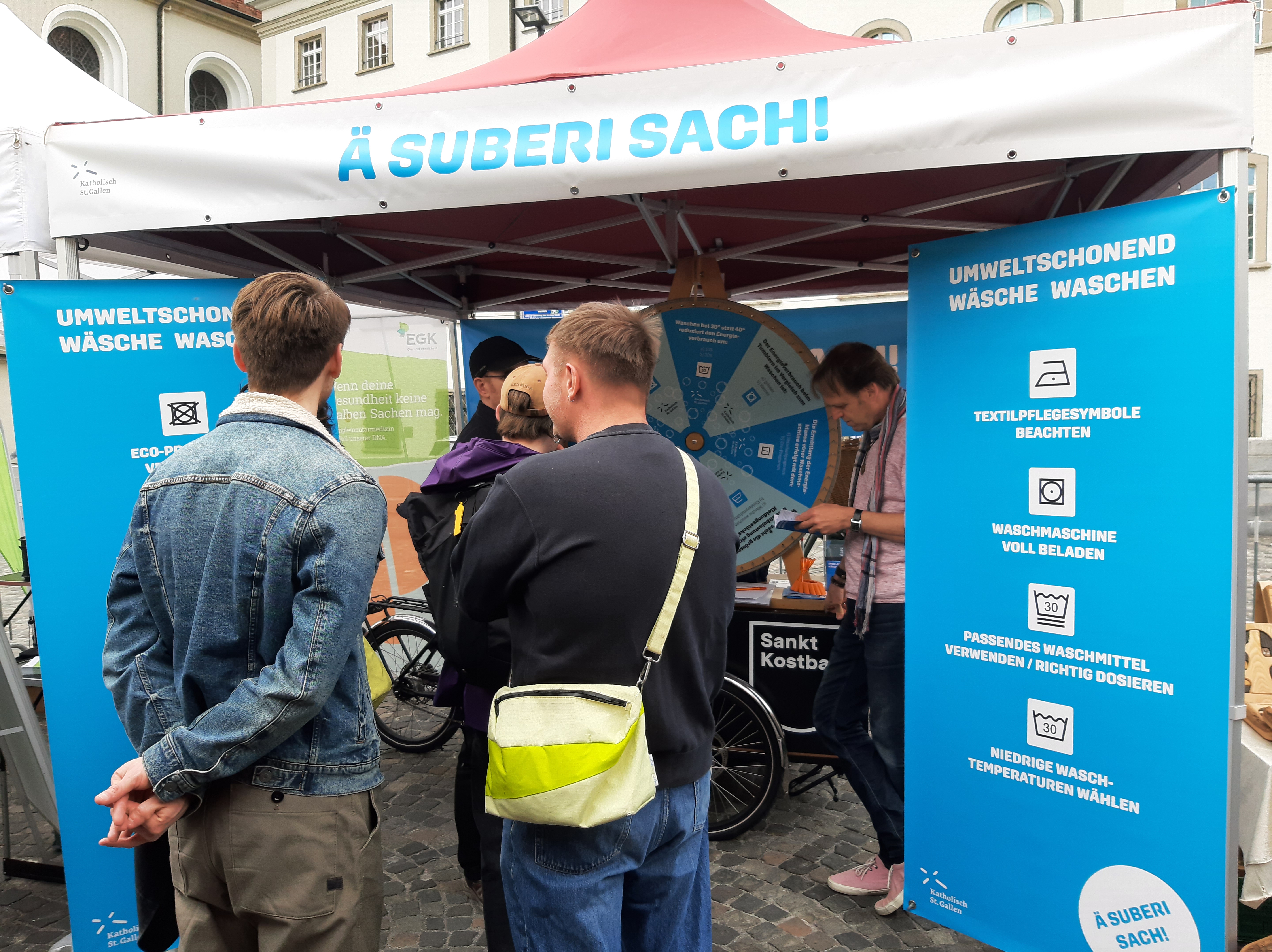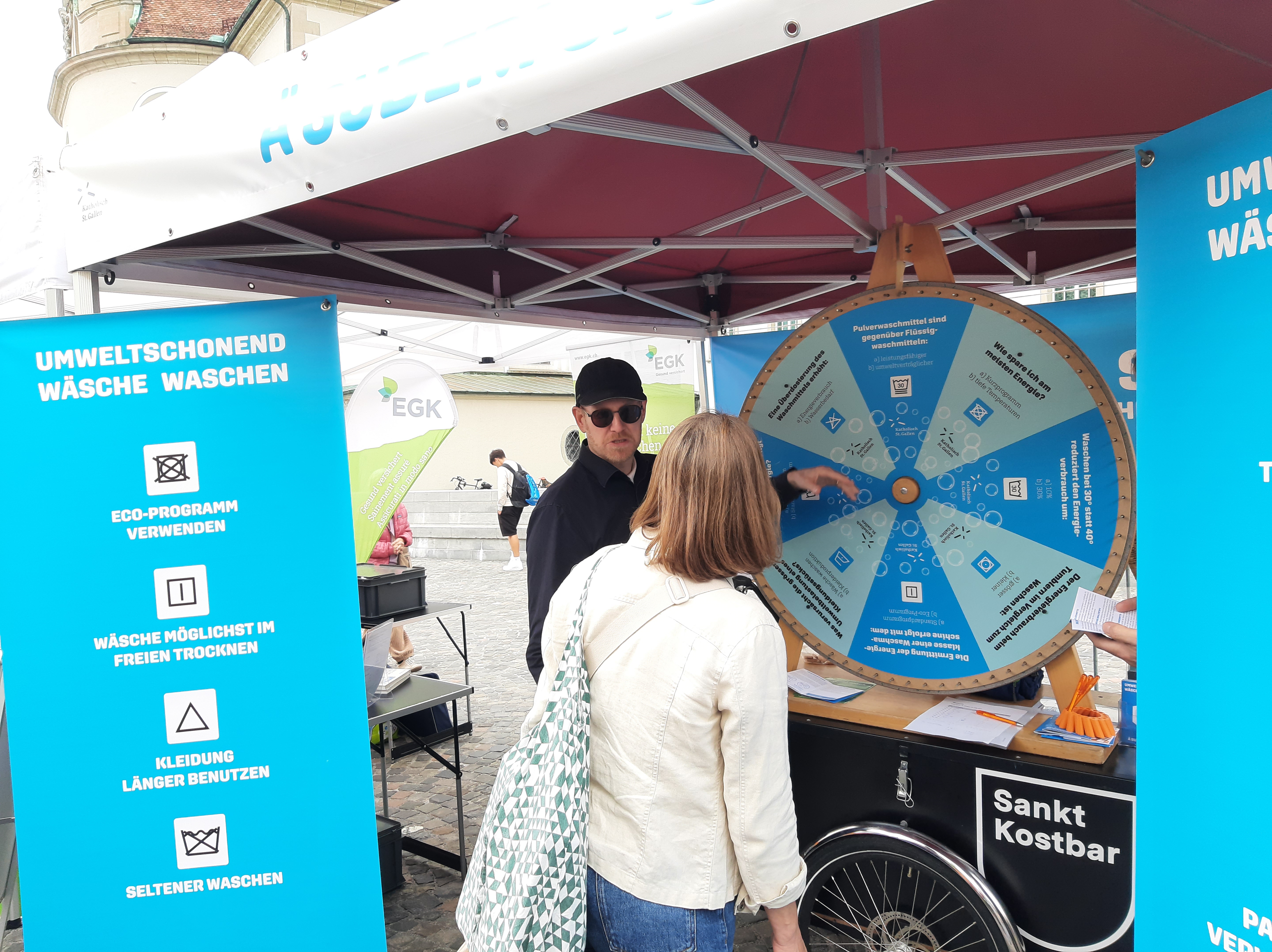 Dieses Jahr hat die Cityseelsorge erstmals an den Green Days mit einer Standaktion teilgenommen. Passend zum Motto der Green Days vermittelten wir praktische Tipps, wie sich beim Wäsche Waschen viel Energie sparen lässt, und dies bei gleichbleibender Wäscheleistung! Beim Glücksrad konnten die Besuchenden ihr Wissen testen und im Gespräch vertiefen. Spontan hat sich die mobile Velowaschanlage aus Gossau dazugesellt. Für einen Tag stand der Vadianplatz somit ganz im Zeichen der energiesparenden Hygiene von Mensch und Zweirad.