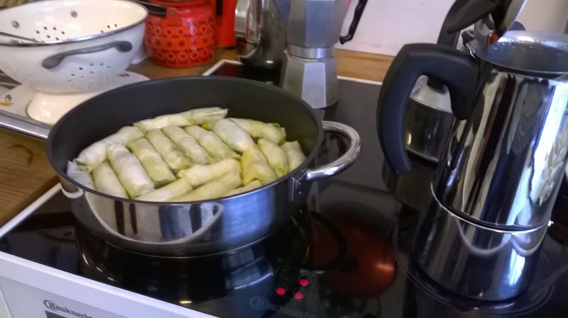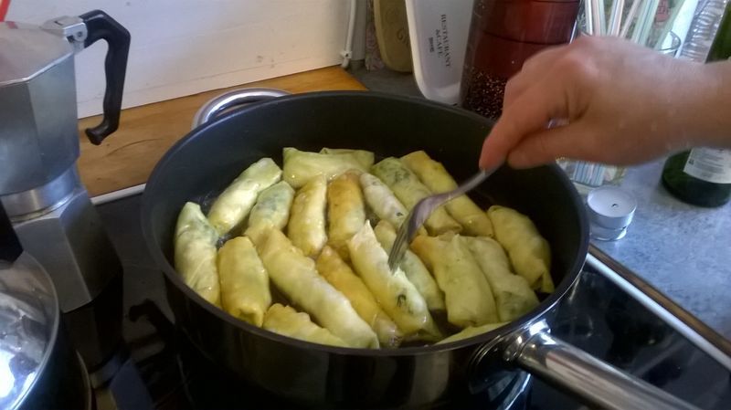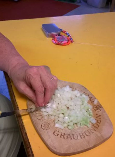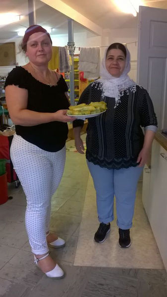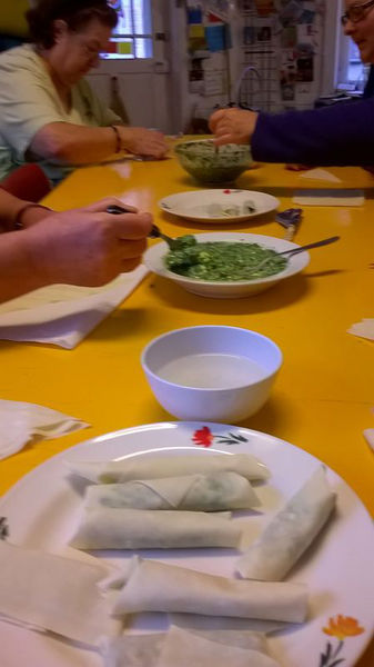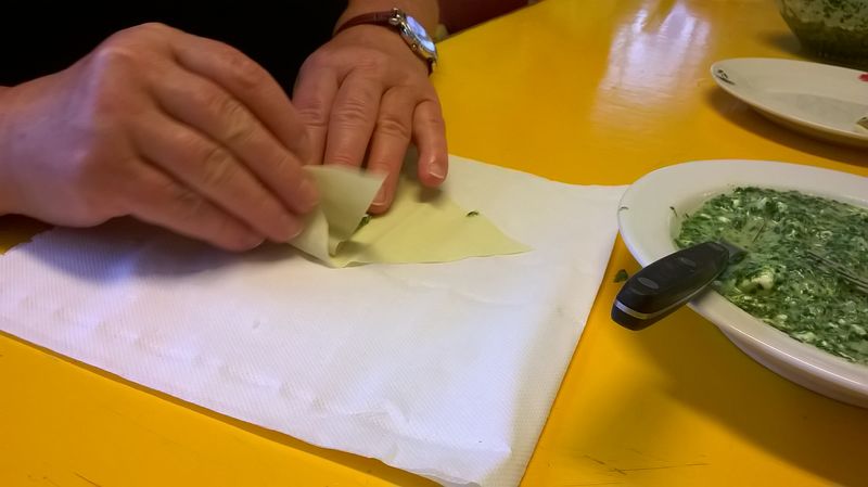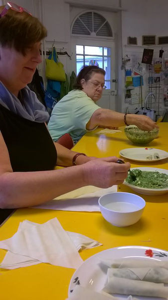 Die Frauen von FrauenLachen bereiten miteinander frittierte Teigtaschen mit Spinatfüllung zu