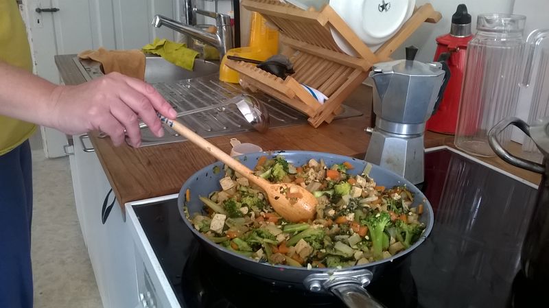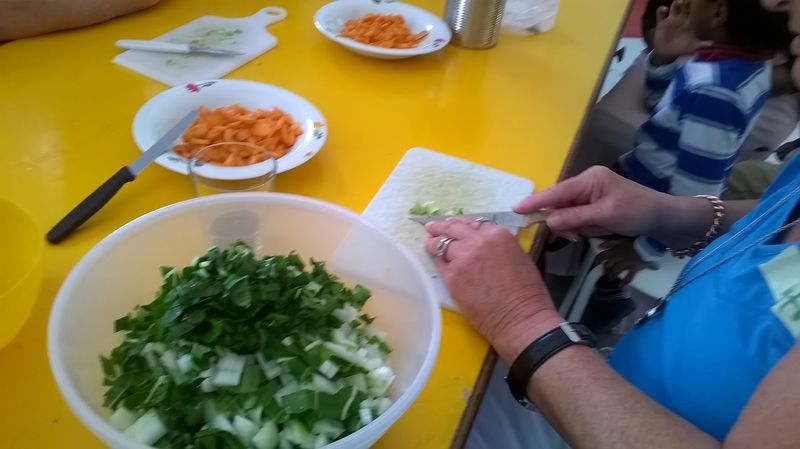 Die Frauen bereiten miteinander ein Gemüsegericht zu.