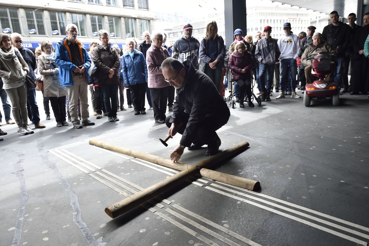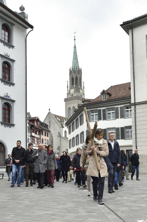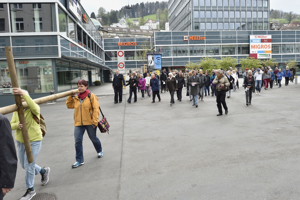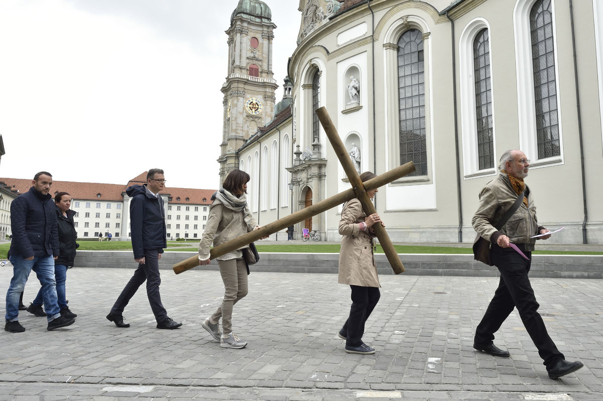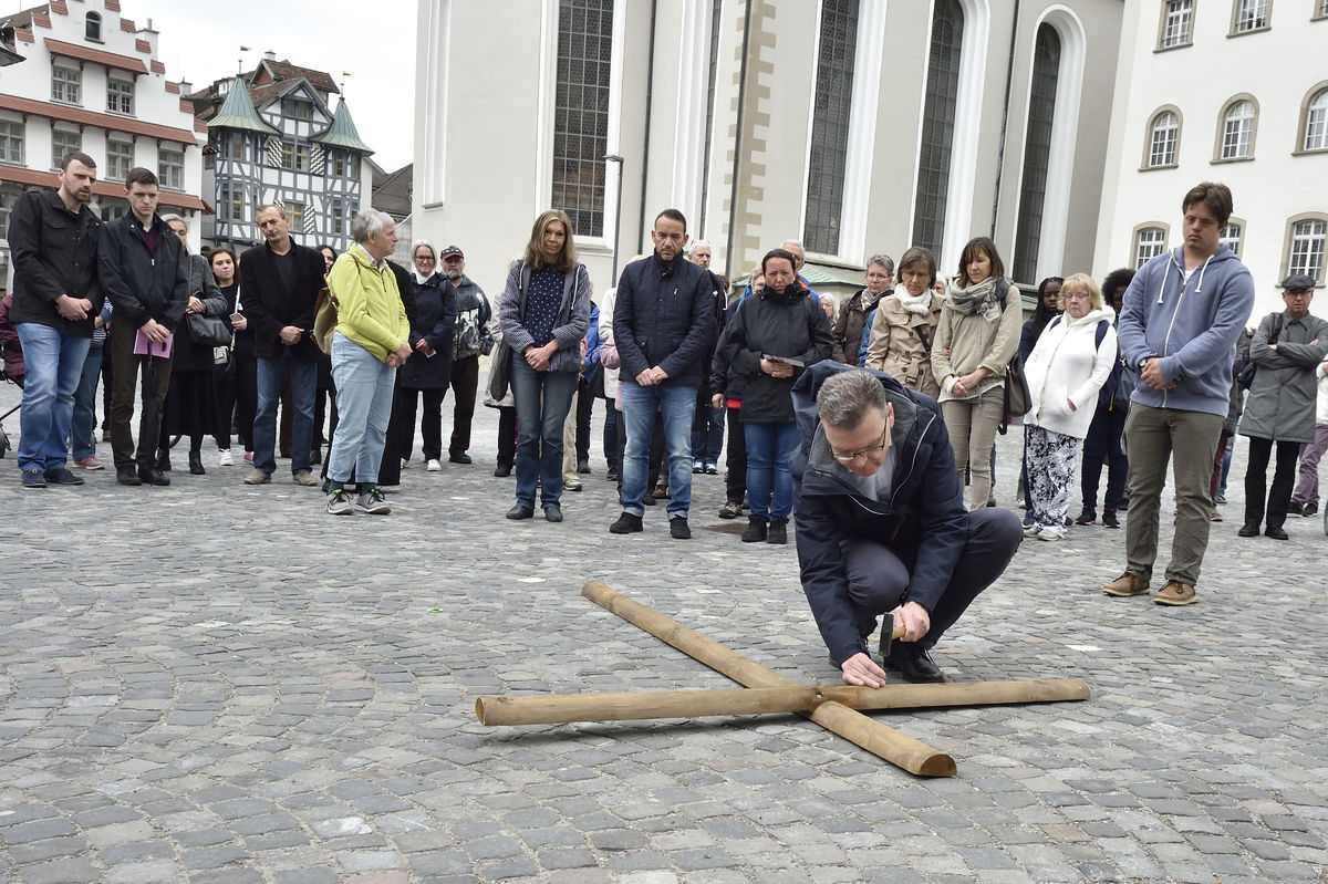 Der Kreuzweg der Gegenwart führt Menschen durch die Stadt St.Gallen, vorbei an aktuellen Orten des Leidens.