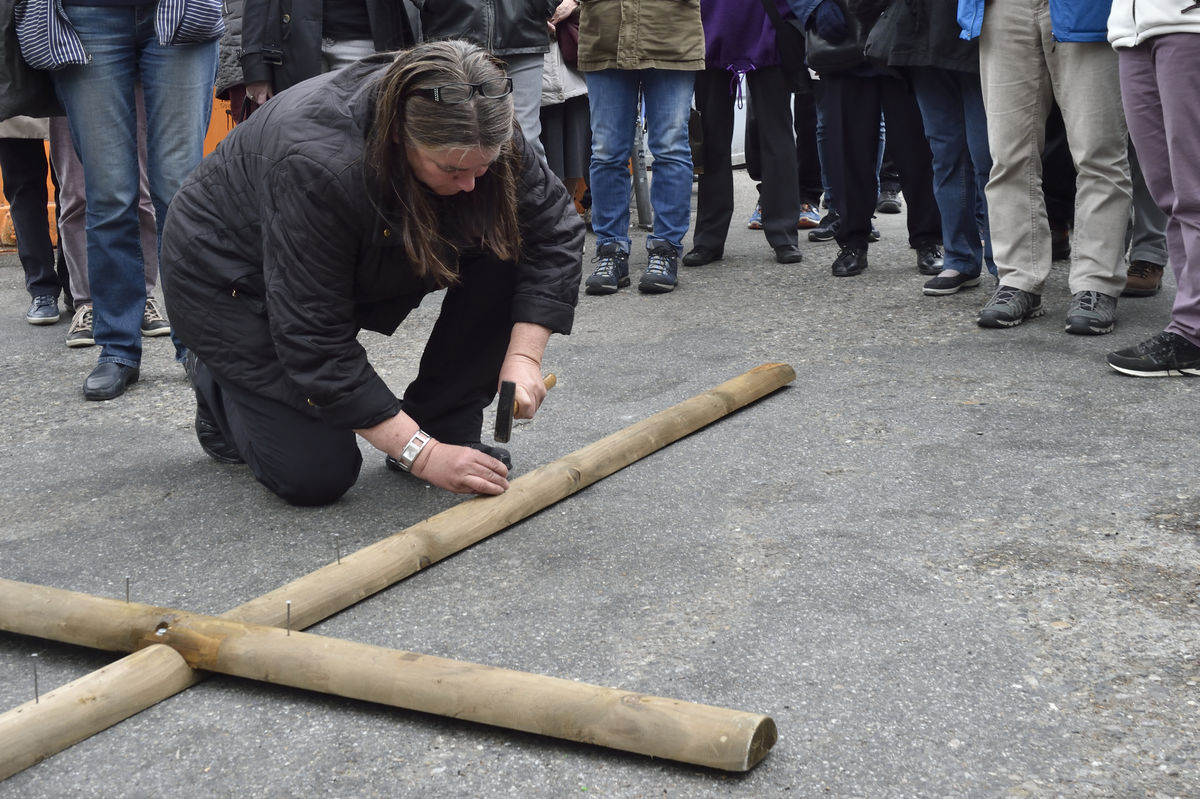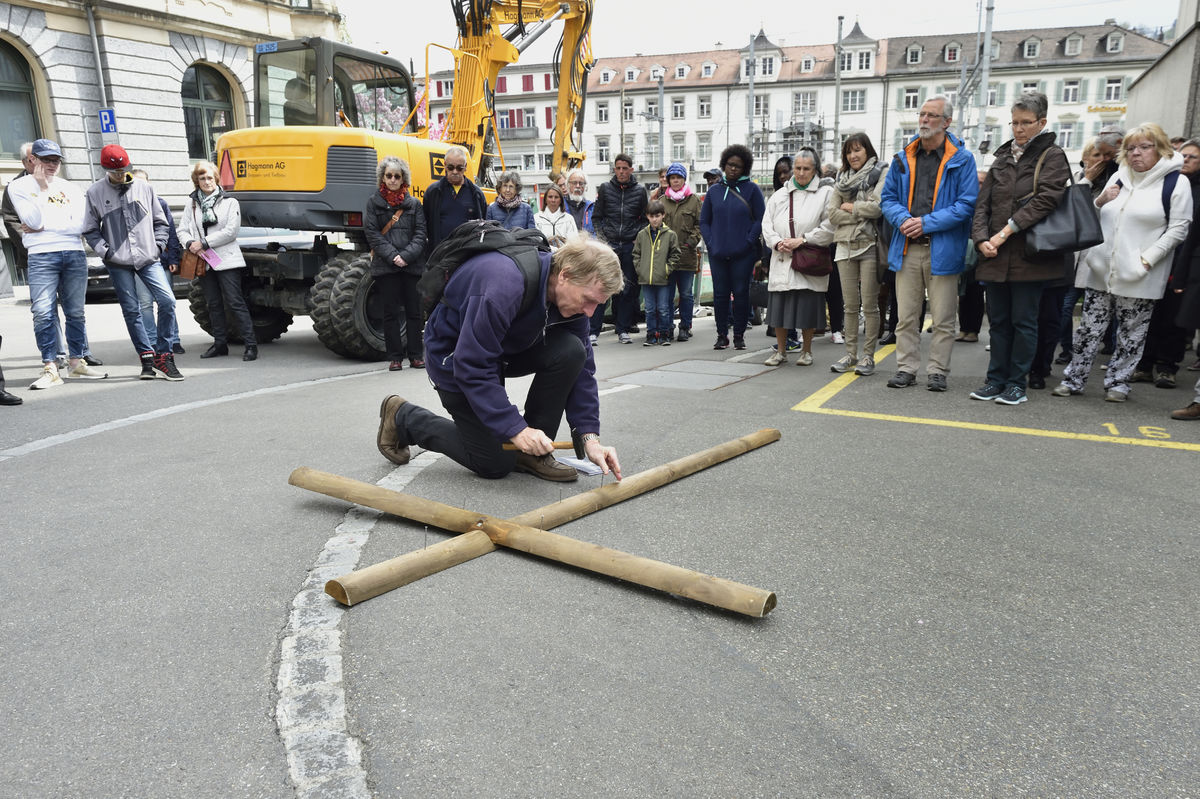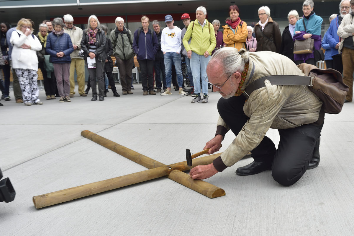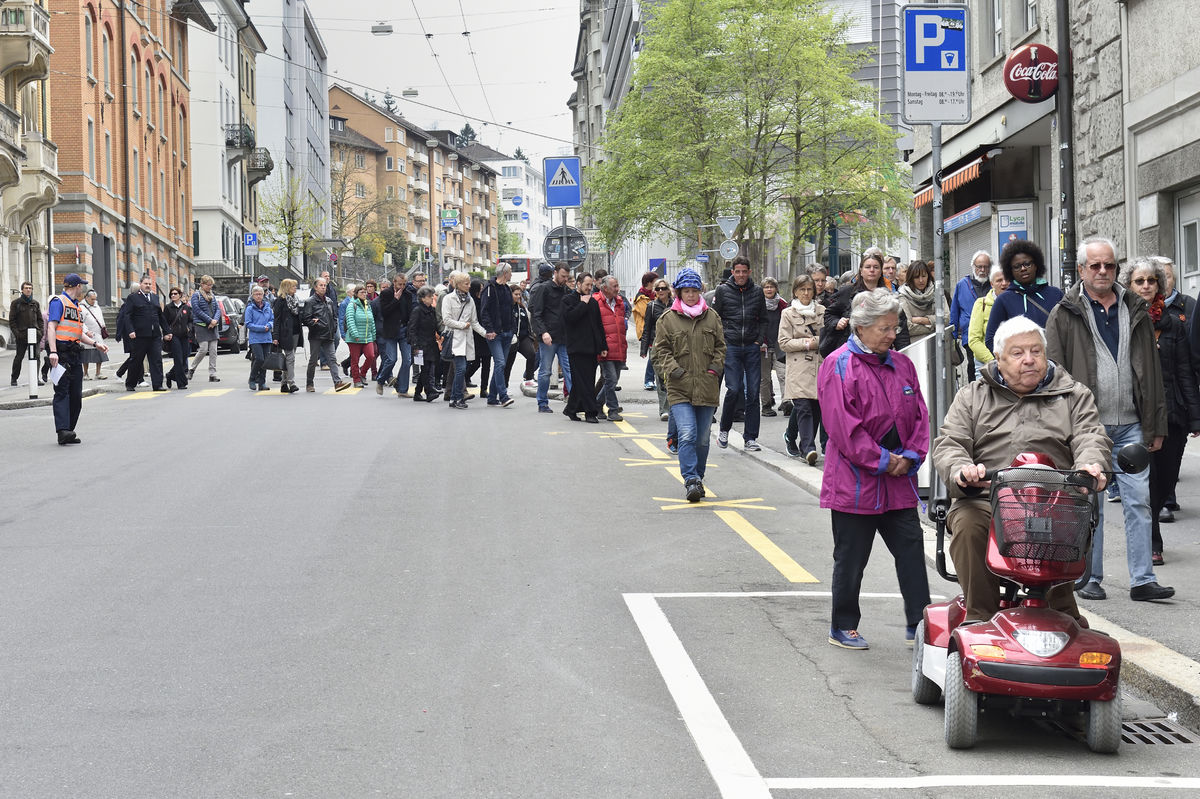 Der Kreuzweg der Gegenwart führt Menschen durch die Stadt St.Gallen, vorbei an aktuellen Orten des Leidens.