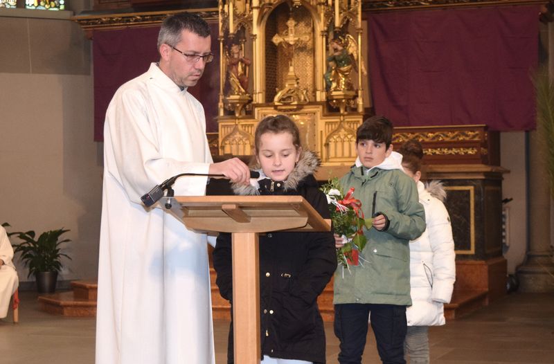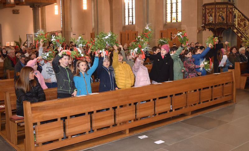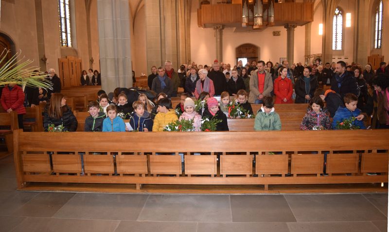 Im Familiengottesdienst an Palmsonntag wurde fröhlich gesungen und gejubelt! Erstkommunionkinder hatten zusammen mit ihren Eltern Palmsträusschen gebunden und diese zum Jubelruf im Gottesdienst geschwenkt. Mit Freude wurde dabei an die feierliche Ankunft Jesu in Jerusalem gedacht. Unterstützt wurden sie musikalisch von Trompete und Orgel.