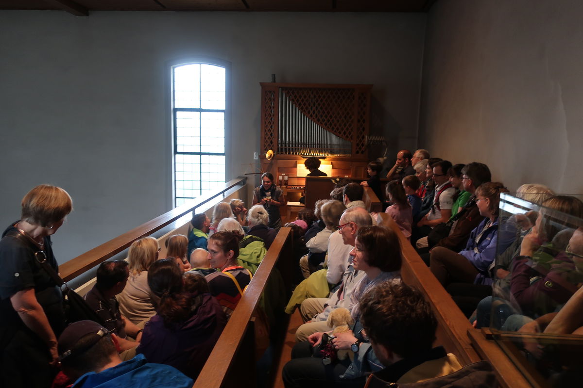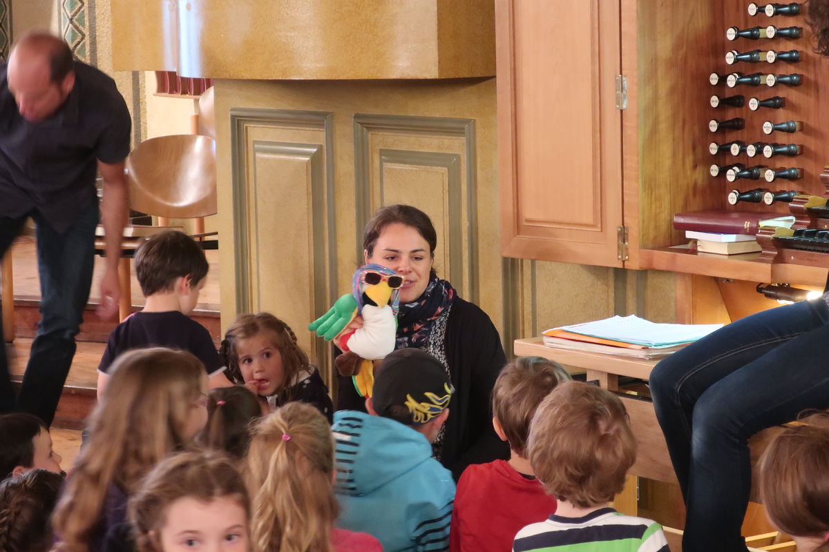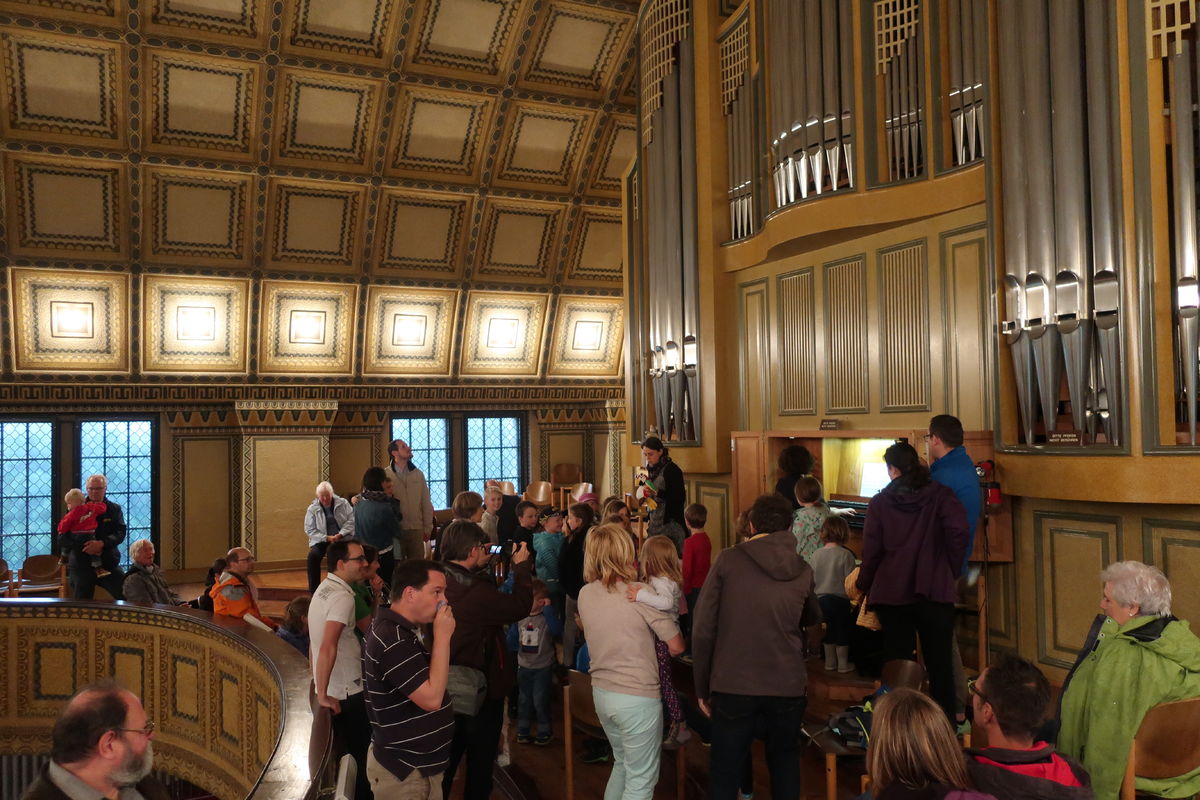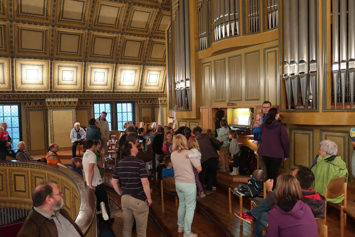 Am Pfingstmontag-Nachmittag haben sich rund 70 Erwachsene und Kinder auf den Weg gemacht, um drei Orgeln im St. Galler Osten zu erkunden. Maja Bösch hat uns die kleine Orgel der Wallfahrtskirche Heiligkreuz, die impossante Orgel der evangelischen Kirche Heiligkreuz und die grösste Orgel des Bodensee-Raums in der Kirche St. Maria Neudorf vorgestellt. Für Gross und Klein war etwas geboten. In der Wallfahrtskirche hat die Orgel ein kleines Mäuschen zum Sprechen gebracht. Die Orgel der evangelischen Kirche Heiligkreuz lies den Papagei abtanzen und in der Kirche St. Maria Neudorf hat die Grösse der Orgel uns den Atem geraubt und einen elefantösen Eindruck hinterlassen. Regina Sala hat gekonnt und beherzt die drei Tier-Begleiter zum Leben erweckt und dank der Kreativität von Christina Hegelbach konnten die Kinder durch's Basteln auch spielerisch in die Wunderwelt der Orgeln eintauchen. Abschliessend haben wir, dem Regen trotzend, den spannenden Tag bei Bratwurt und Vegiburger ausklingen lassen.