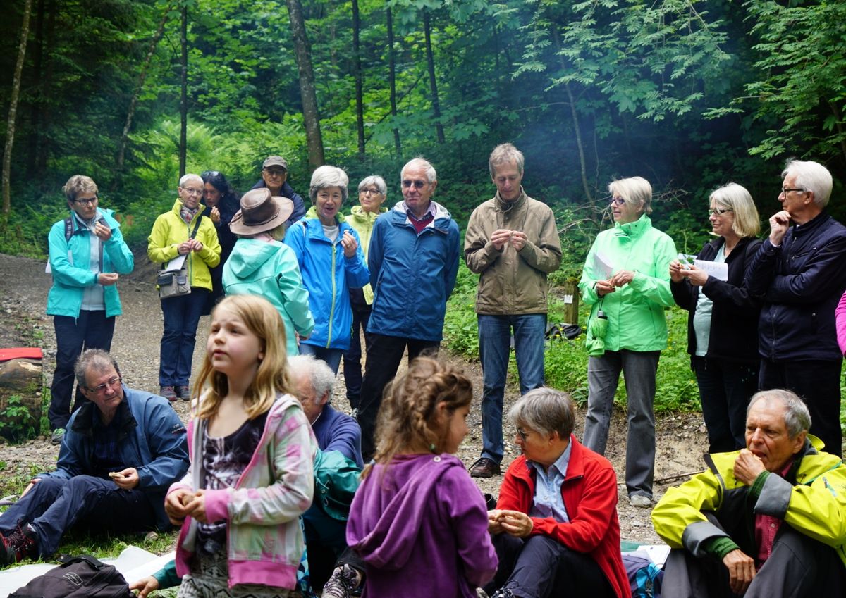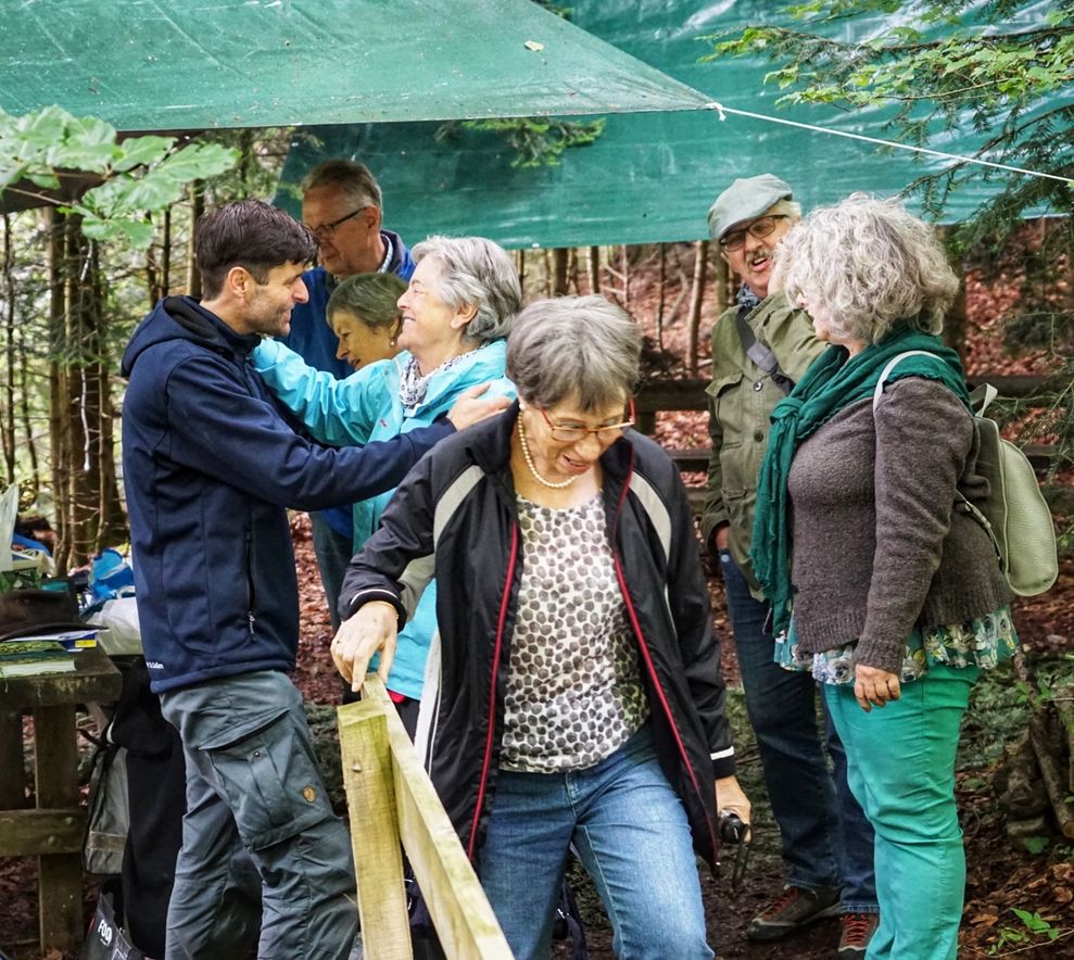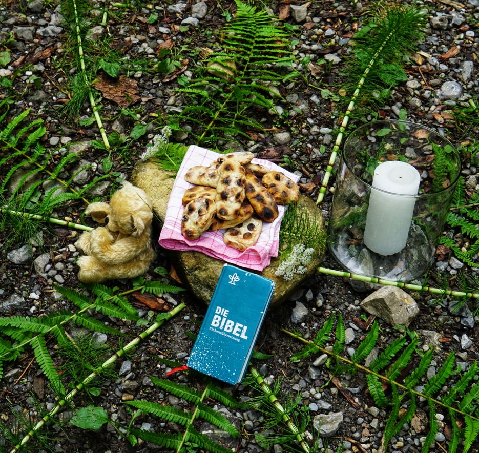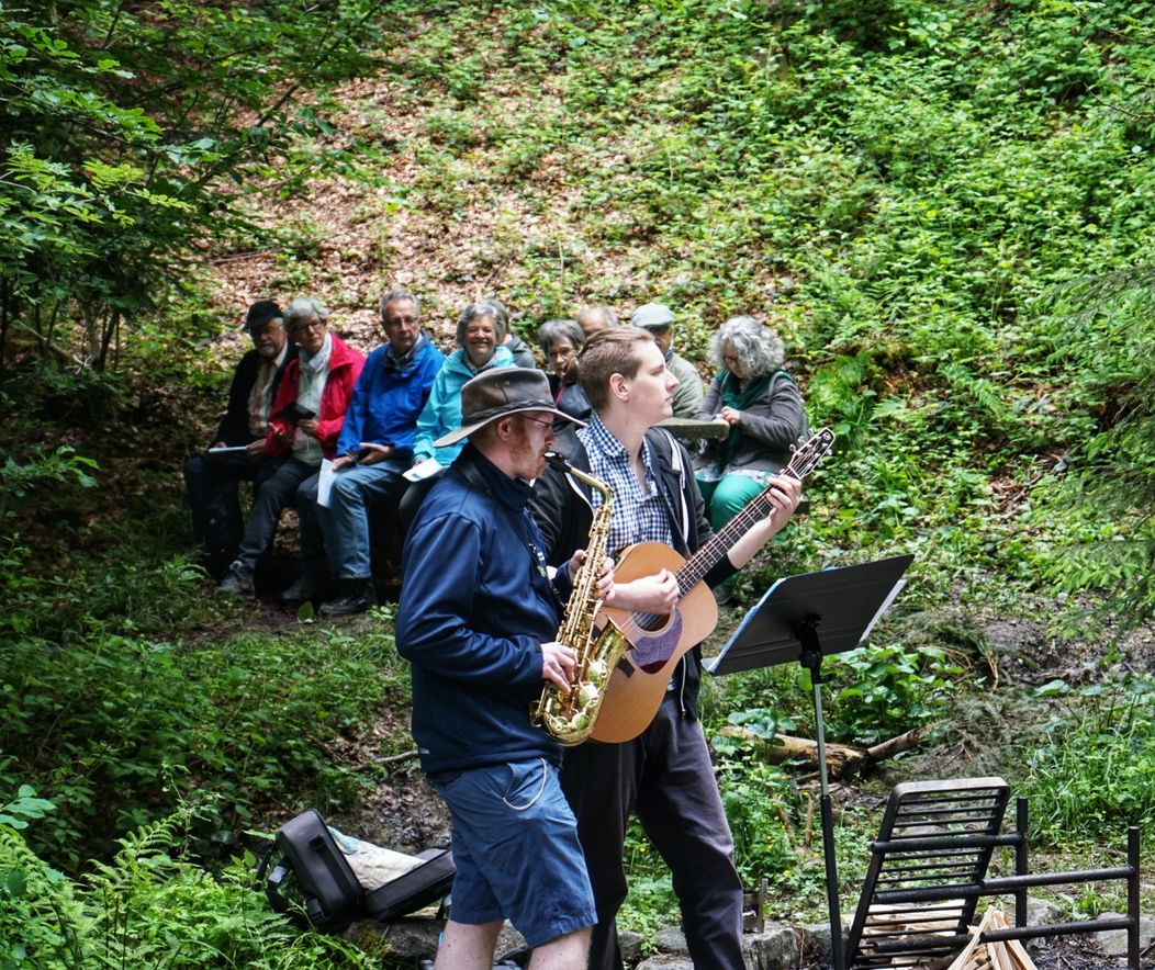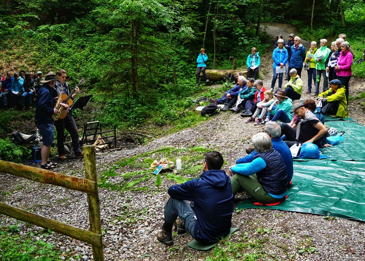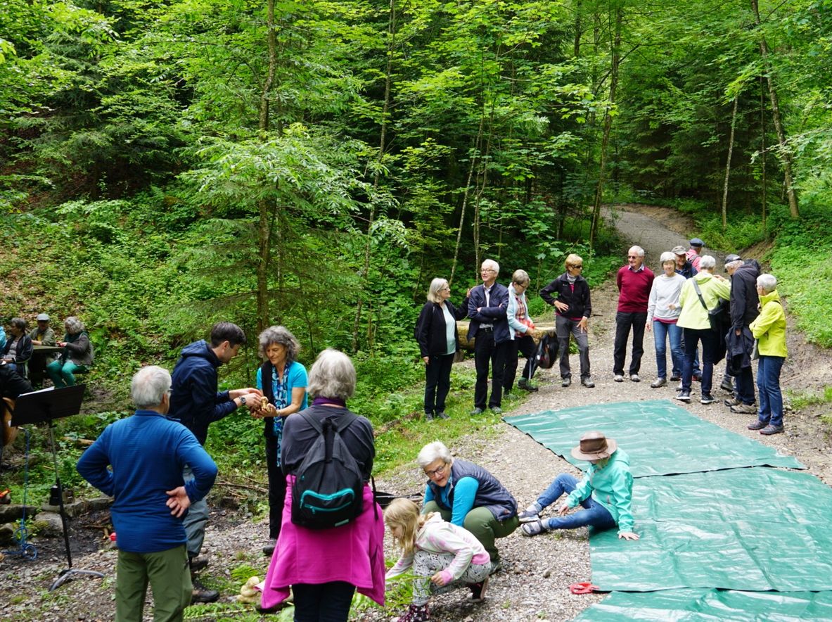 Neben der Stille und der Meditation begegnet er auch Menschen, führt ein Taufgespräch oder lädt zum Waldgottesdienst ein, wie es die Bilder zeigen.