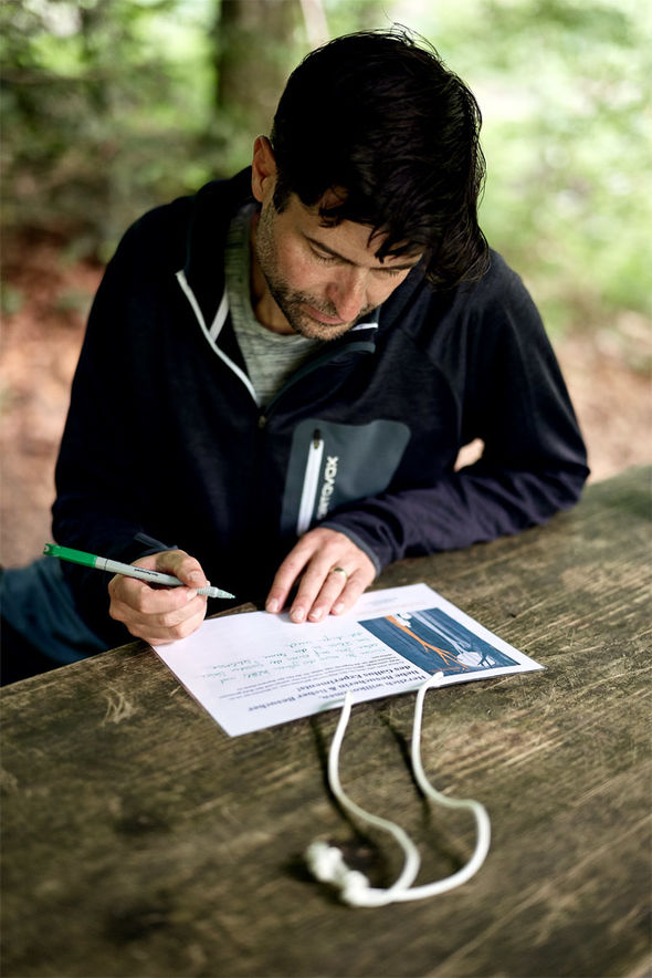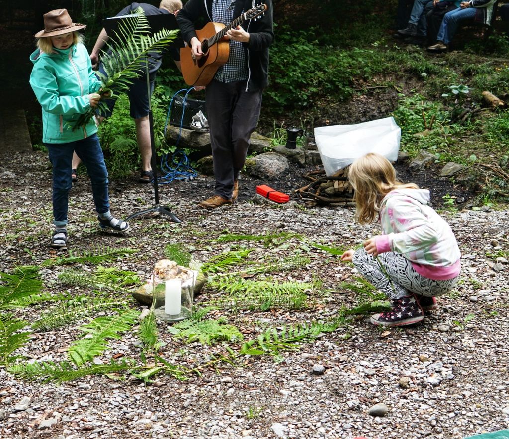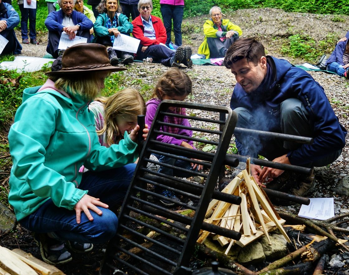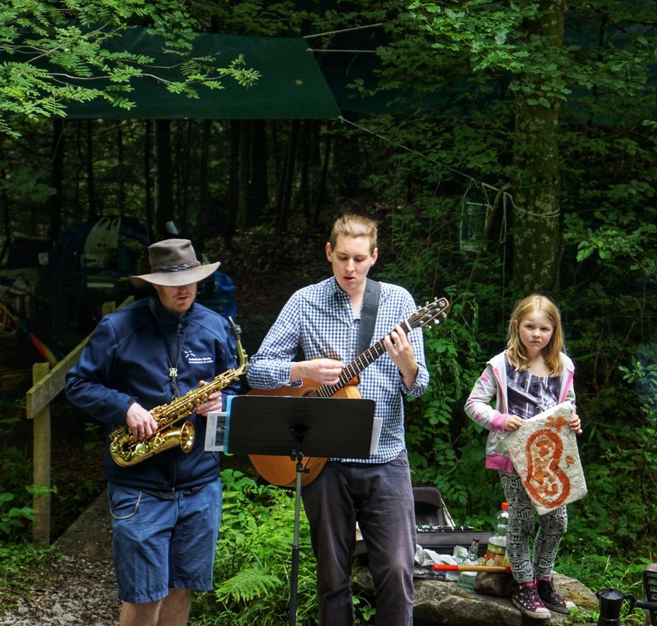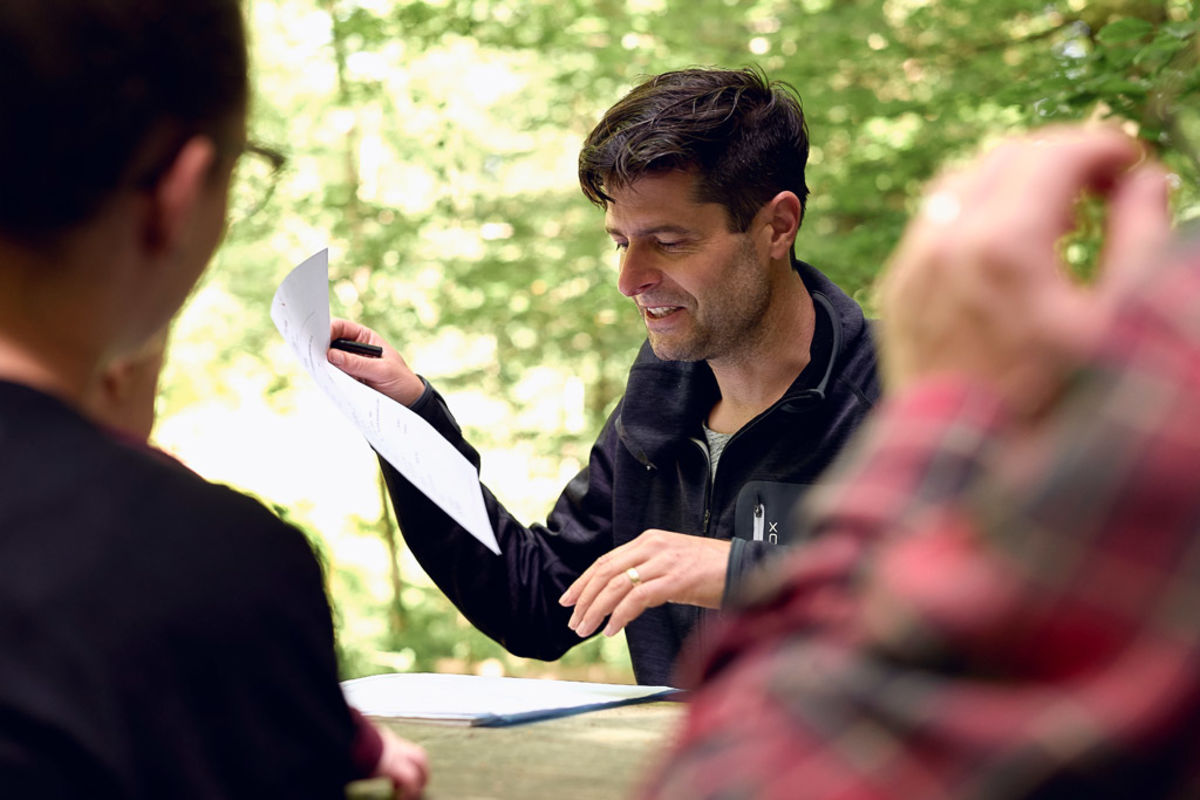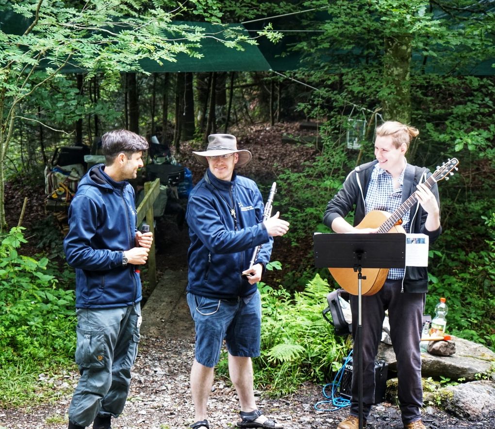 Neben der Stille und der Meditation begegnet er auch Menschen, führt ein Taufgespräch oder lädt zum Waldgottesdienst ein, wie es die Bilder zeigen.