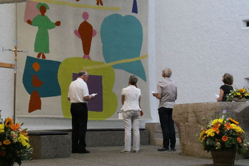 Unsere Kirche in Wort, Bild und Klang. Präsentation des neuen Kunstführers, der zum Jubiläum herausgegeben wurde. Elisabeth Mauchle, Vreni Ammann, Niklaus Akermann und Niklaus Knecht sind das Redaktionsteam des spirituellen Kirchenführers.
