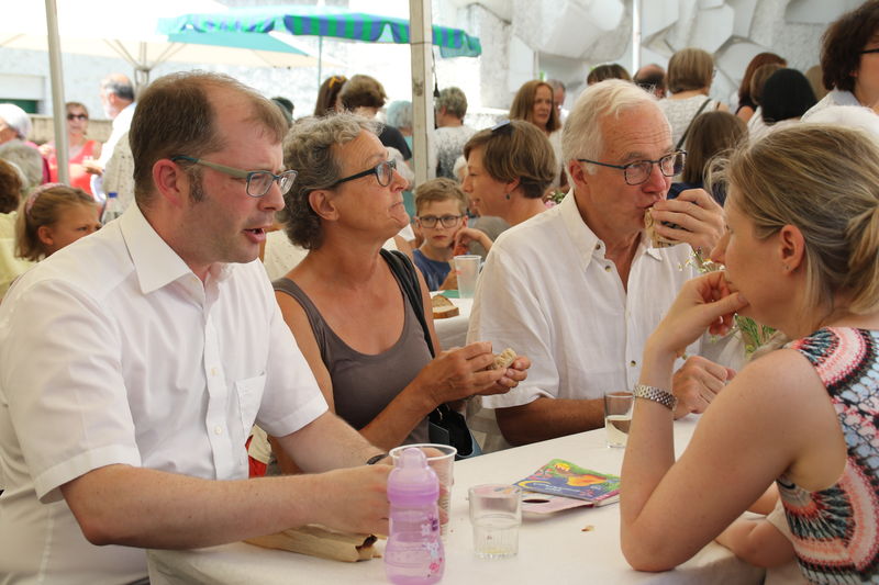 Mit Gesang und Klang wird der Festgottesdienst zum 50 jährigem Jubiläum der Kirche verschönert. Das junge Holzbläserquintett KEBAP und das Kantorenensemble führen festliche Stücke von Erwin Wölk auf. Im Anschluss Apéro mit Musik und Bratwurst vom Grill