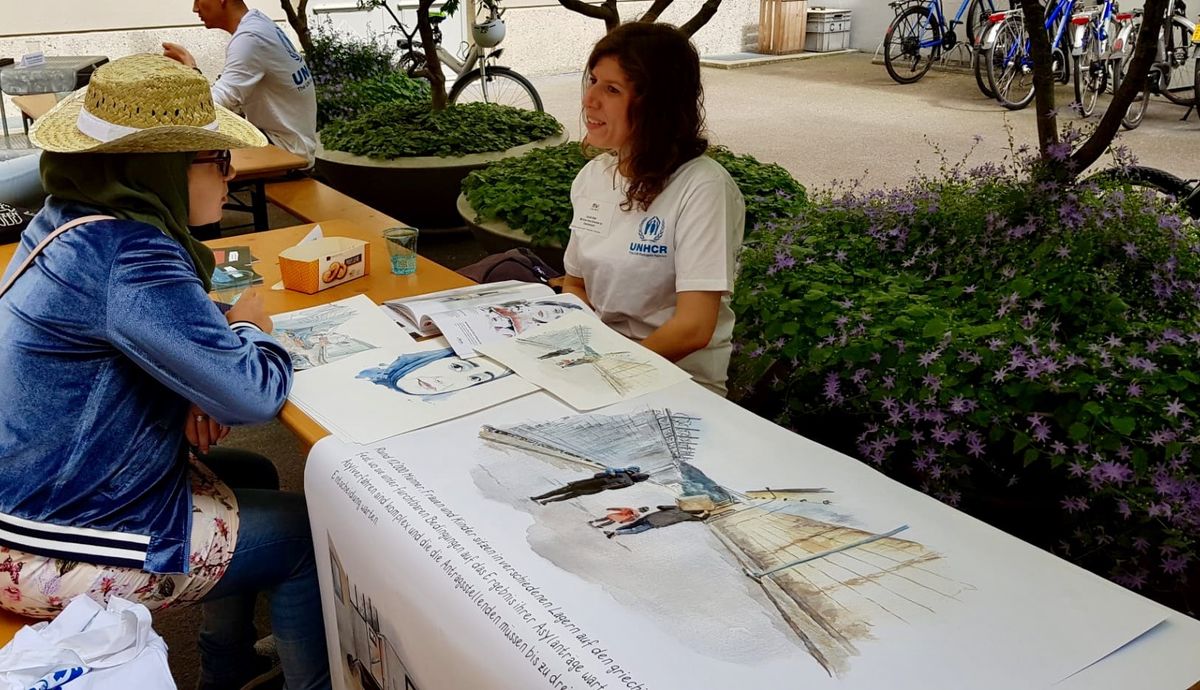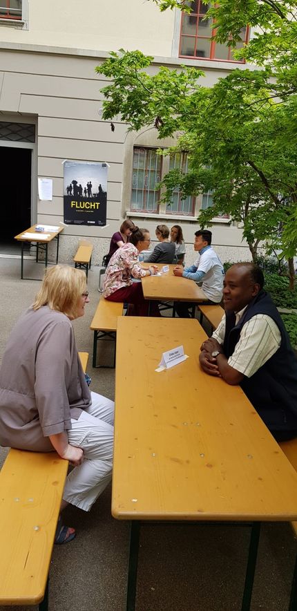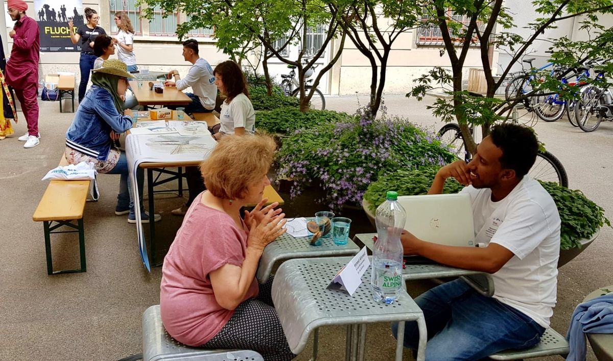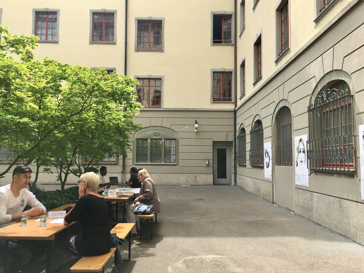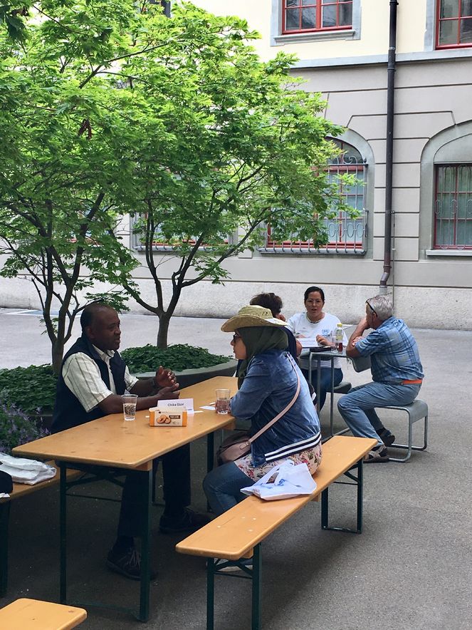 Gleichzeitig zum Infostand am Fest der Kulturen führten die UNHCR Mitarbeitenden gemeinsam mit der Flüchtlings- und Migrantenseelsorge eine Living Library im Innenhof des Amtshauses durch. In zwei Schichten fanden viele Leser*innen sich in der „lebendige Bibliothek“ ein, um Menschen mit Fluchterfahrung sowie Mitarbeitende im Flüchtlings- und Asylbereich, die sich als „menschliche Bücher“ ausleihen liessen, zu „lesen“. Selbst der Flüchtlings- und Migrantenseelsorger, Chika Uzor, beteiligte sich daran als „Buch“. Es waren intensive aufmerksame Begegnungen. Ein herzliches Dankeschön an alle, die sich als „Bücher“ daran teilgenommen haben.
