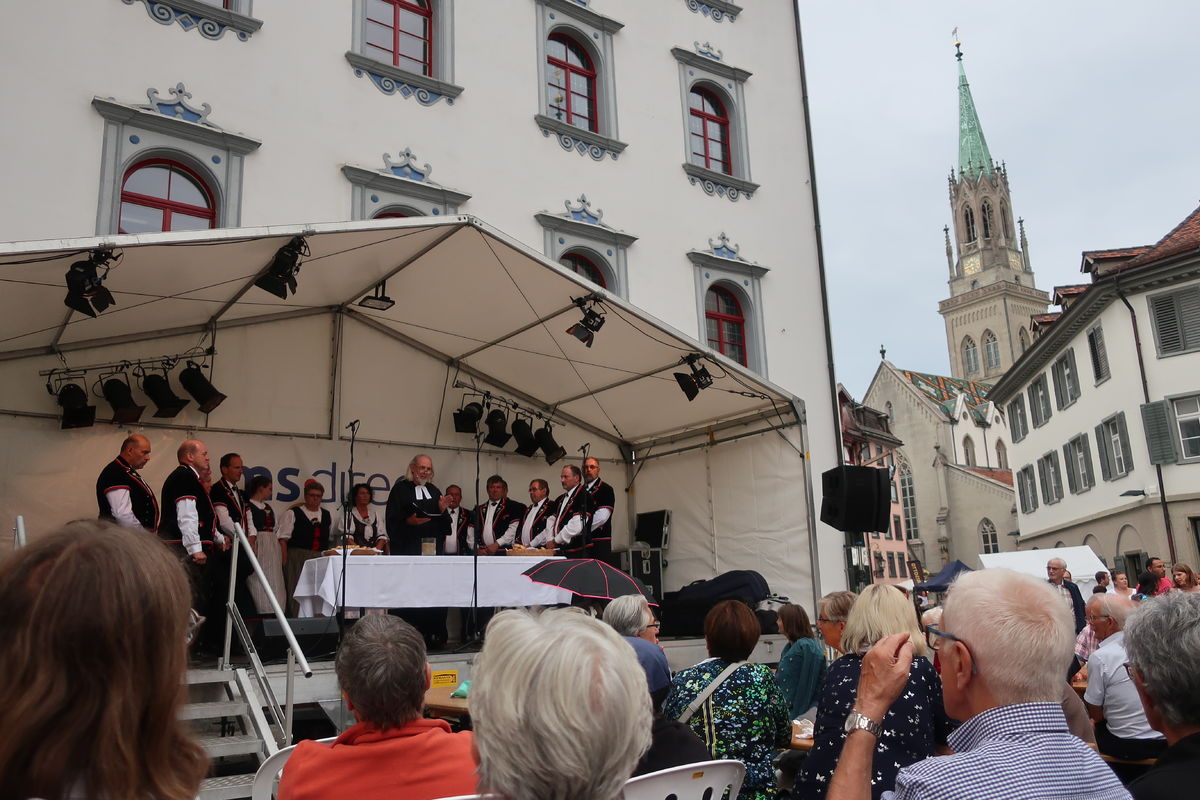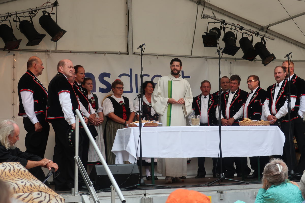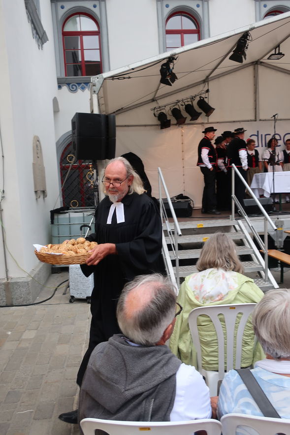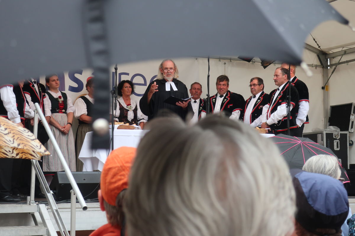 Auch beim Gottesdienst gab es grosses Interesse - natürlich auch wegen der Musik! Während die Appenzeller Naturjodelformation "dross ond dree" den Gottesdienst "einläutete", sang der Jodelclub "Klein Rigi" im Gottesdienst. Pfr. Hansreudi Felix von der Laurenzenkirche und Matthias Wenk von der Cityseelsorge der kath. Kirche im Lebensraums St. Gallen gestalteten den Gottesdienst inhaltlich: Lasst uns guter Boden sein, auf dem Gutes wachsen kann! Der Ort des Gottesdienst lag dieses Jahr mitten drin im Trubel des Festes. So blieben viele Menschen stehen und feierten den Gottesdienst mit.