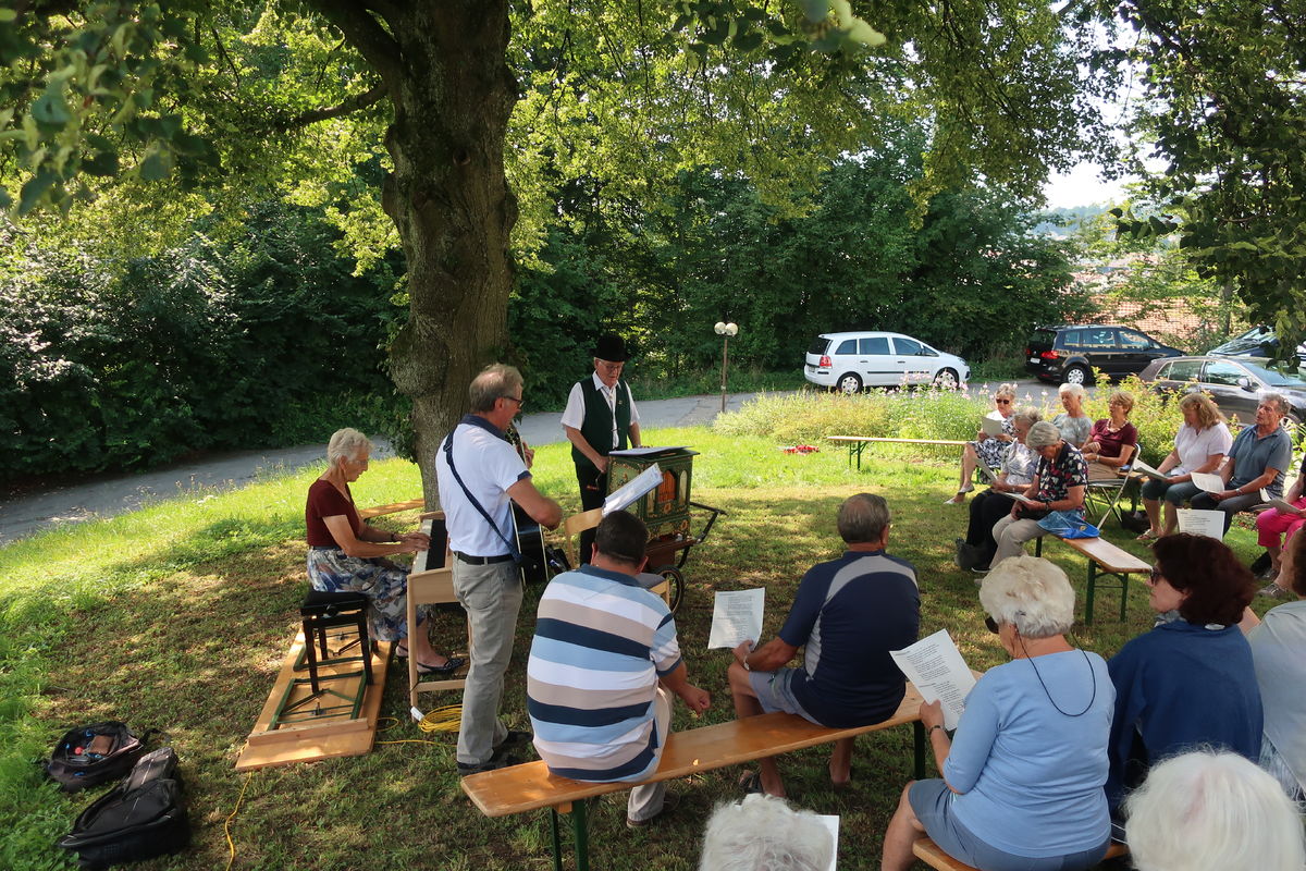 Im Rahmen des ökumenischen Senior*innenprogramms der Krichen Grossacker, St. Fiden, Neudorf, Stephanshorn und Halden trafen wir uns bei wunderbarer Sommerhitze im Schattend der grossen Linde vor dem Kirchgemeindehaus Stephanshorn. Unter der Federführung von Meinrad Leuch schwelgten wir dort in alten Volksweisen. Meinrad hat für diesen Anlass gemeinsam mit seinen beiden Musik-Kolleg*innen Susi Diethelm (Klavier) und Willi Hausammann (Gesang und Gitarre) ein buntes Programm zusammengestellt. Vorgetragene Liedern wechselten sich mit gemeinsam gesungenen ab. In seiner gewohnt humorvollen und mitreisenden Art schenkte uns Meinrad einen vergnüglichen Nachmittag. Natürlich durfte auch seine Drehorgel nicht fehlen. Mit ihr begrüsste er die ankommenden Senior*innen.