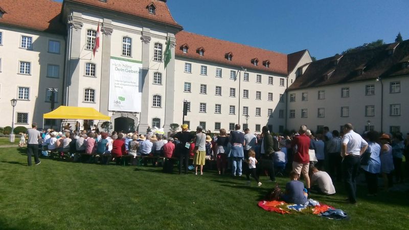 Die Friedenstaube, liebevoll geschaffen von Frauen des internationalen Frauentreffs FrauenLachen, setzt bei der Interreligiösen Feier auf dem Klosterplatz einen frischen und schwungvollen Akzent.