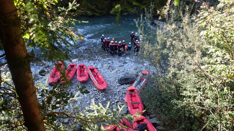 Samstagmorgen starteten acht Jungs und zwei Jugendarbeiterinnen gemeinsam in ein spannendes Wochenende. Mit Zug und Bus führte die Reise nach Lingenau im Bregenzerwald. Dort angekommen wurden die Tipis – unsere Unterkunft für die nächste Nacht - bezogen und unser Guide „Stone“ begrüsste uns. Nach der Sicherheitseinweisung ging es in die Umkleidekabinen. Dicke Neoprenanzüge, Schwimmwesten und Helme wurden für das bevorstehende Abenteuer angezogen.