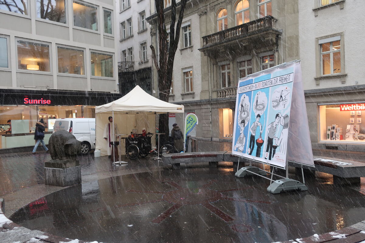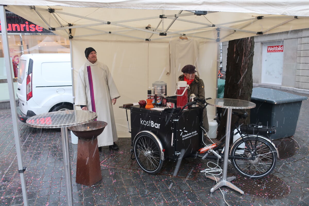 Am Aschermittwoch von 10 - 18 Uhr ist die Cityseelsorge trotz Schneegestöber auf dem Bärenplatz präsent und bringt Passantinnen und Passanten die Bedeutung des Aschermittwochs näher und spendet das Aschenkreuz. Ein Comic hilft dabei zu verstehen, dass der Aschermittwoch der Beginn der Fastenzeit ist, welche in eine weite innere Freiheit führen soll.
