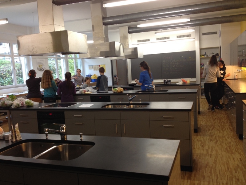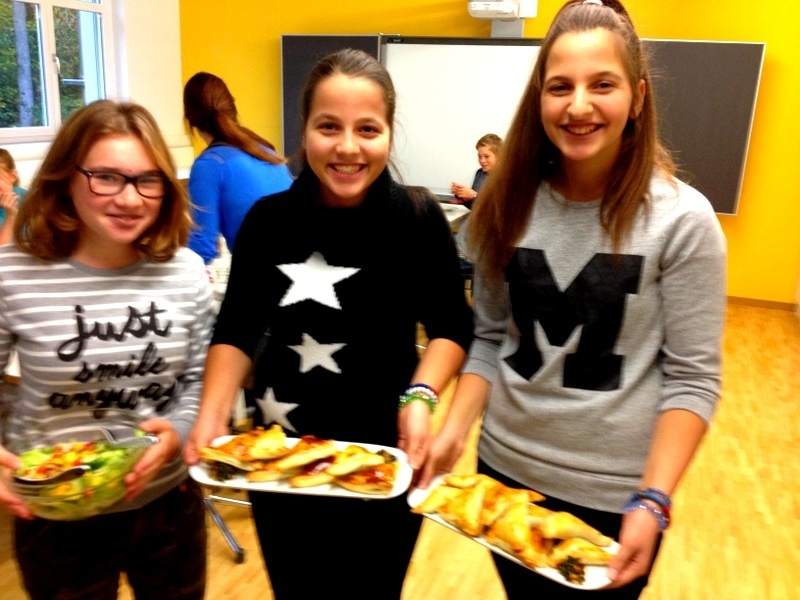 Nachdem wir also unsere Favoriten ausgewählt hatten und Gruppen bilden konnten, wer mit wem was wie kocht, ging`s ans Einkaufsliste schreiben. Voller Vorfreude sind wir dann alle zusammen zum Coop und haben uns ausgetobt…nachdem die Einkaufskörbe gefüllt waren und wir alles hatten was wir brauchten, ging es zurück zur Schulküche der Engelwies Schule. Die nächsten 2 Stunden wurde geschnippelt, geschält, gebrutzelt und gebraten was das Zeug hält…die große Schulküche war voll mit leckeren Gerüchen und eifrigen Köchinnen und Köchen. Die Jugendlichen und wir Betreuer hatten jede Menge Spaß unsere Gerichte zuzubereiten, zu spitzeln wie weit die anderen schon sind und immer wieder mal zu naschen. Nachdem wir dann alle so weit waren, dass wir essen konnten, haben wir den großen Tisch im Nebenraum schön gedeckt und haben mit knurrenden Mägen darauf gewartet, dass die Gruppe-Vorspeise uns ihr Werk präsentiert. Nachdem wir mit den leckeren Spinat-Blätterteigtaschen durchwaren und auch den Beilagen Salat verputzt hatten, ging es mit der Hauptspeise weiter, die aus marokkanischen Hackbällchen mit Ofenkartoffeln und Joghurt-Dip bestand, was auch wirklich sehr sehr lecker war. Die Veggies haben Tortellini mit einer leckeren Tomatensoße verdrückt…zu guter Letzt gab es dann als Dessert noch Zimt-Crêpes mit Vanilleeis und Orangensorbet.