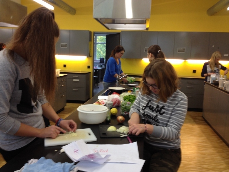 Am Samstagnachmittag kochten wir (9 Jugendliche und 4 Betreuer) mit Feuereifer um die Wette, bei „Cook around the World“. Bevor wir loslegen konnten hieß es jedoch verschiedene Rezepte aus aller Welt auszuwählen und abzustimmen, was es als Vorspeise, Hauptgericht und Nachtisch geben sollte…nicht zu vergessen die Veggies unter uns, die sich ihren eigenen fleischlosen Hauptgang aussuchen duften.