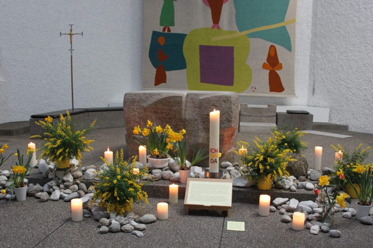 Damit der Osterbaum in der Kirche trotz der ausserordentlichen Situation blühen kann, haben SchülerInnen der Mittelstufe Schmetterlinge ausgemalt und sie in der Kirche am Osterbaum aufgehangen.