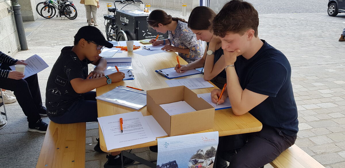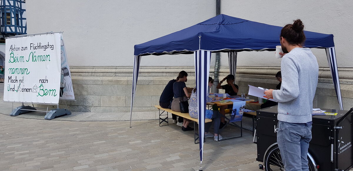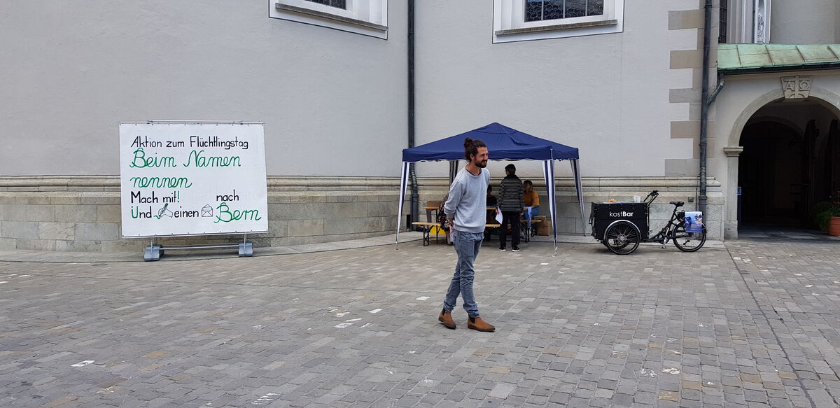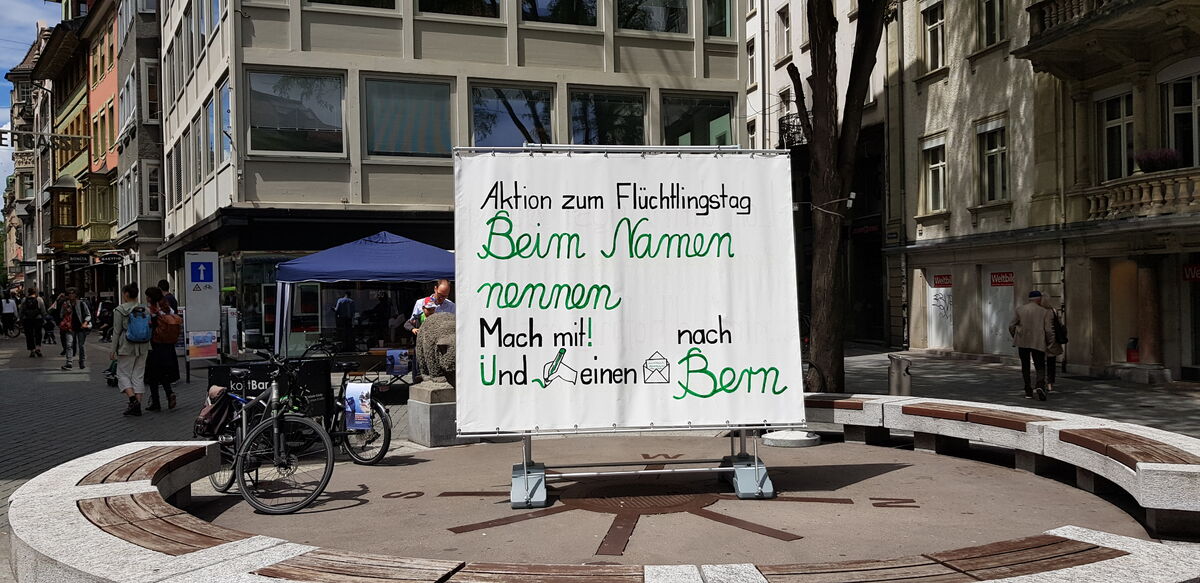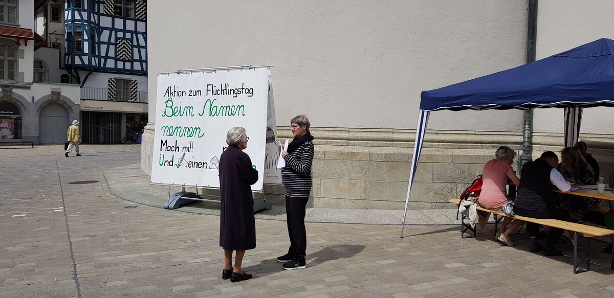Zum Weltflüchtlingstag, 20. Juni führte die Flüchtlings- und Migrantenseelsorge an Wochenende 20./21.6. eine Standaktion „Beim Namen nennen“ in der Stadt St. Gallen durch. Passanten und Freiwilligen schrieben Briefe an den Bundesrat und das eidgenössische Parlament für die neu 40‘555 nach Europa flüchtenden Babys, Kinder, Frauen und Männer.