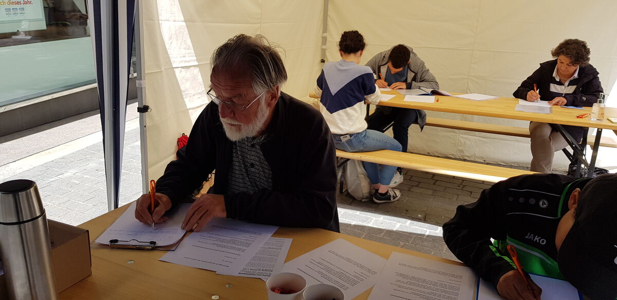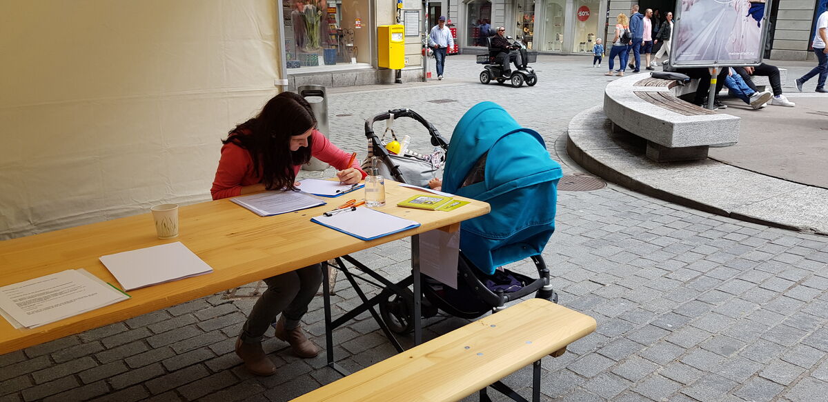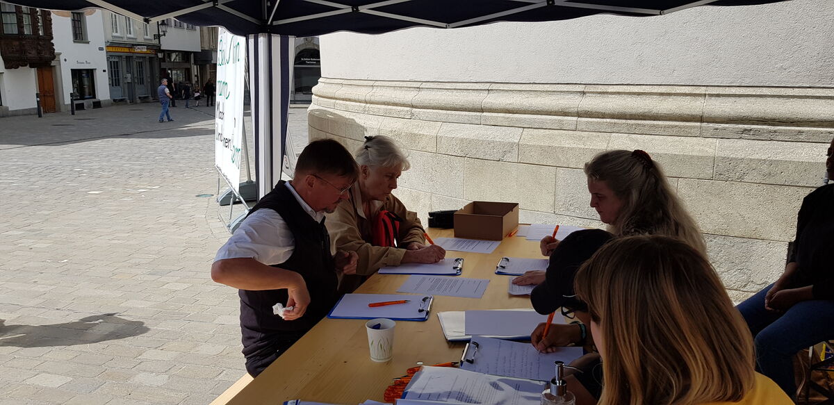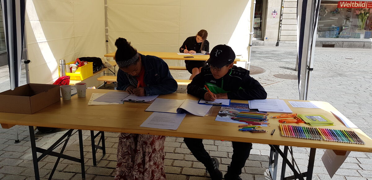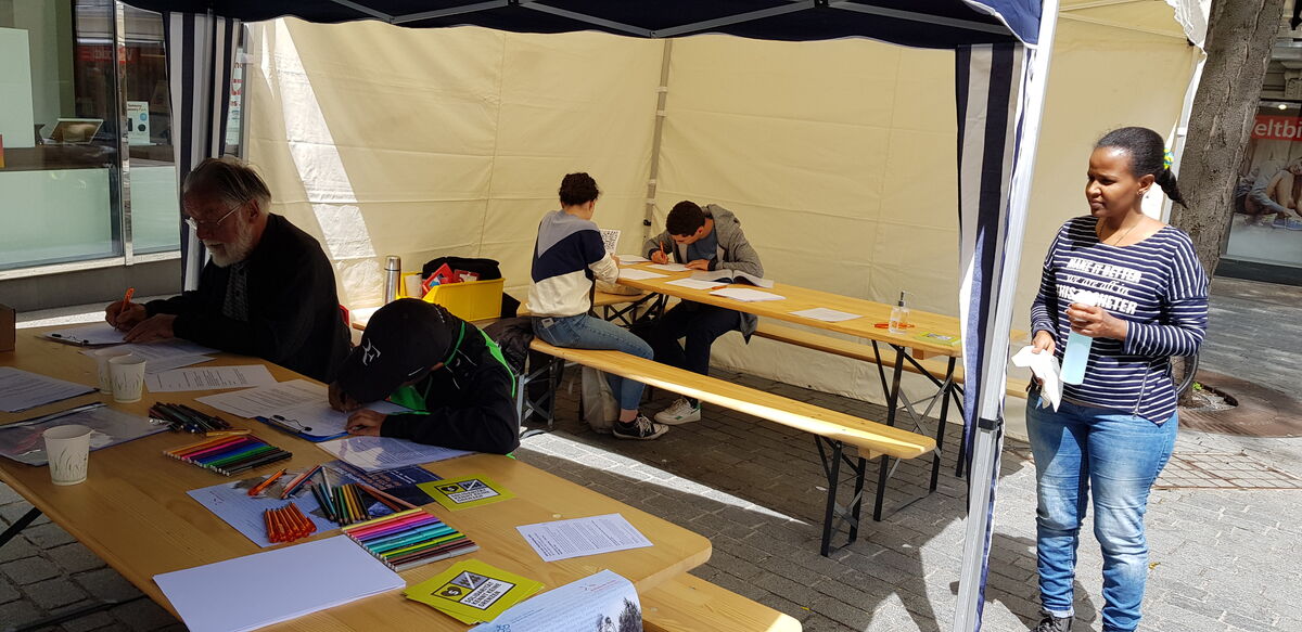 Zum Weltflüchtlingstag, 20. Juni führte die Flüchtlings- und Migrantenseelsorge an Wochenende 20./21.6. eine Standaktion „Beim Namen nennen“ in der Stadt St. Gallen durch. Passanten und Freiwilligen schrieben Briefe an den Bundesrat und das eidgenössische Parlament für die neu 40‘555 nach Europa flüchtenden Babys, Kinder, Frauen und Männer.