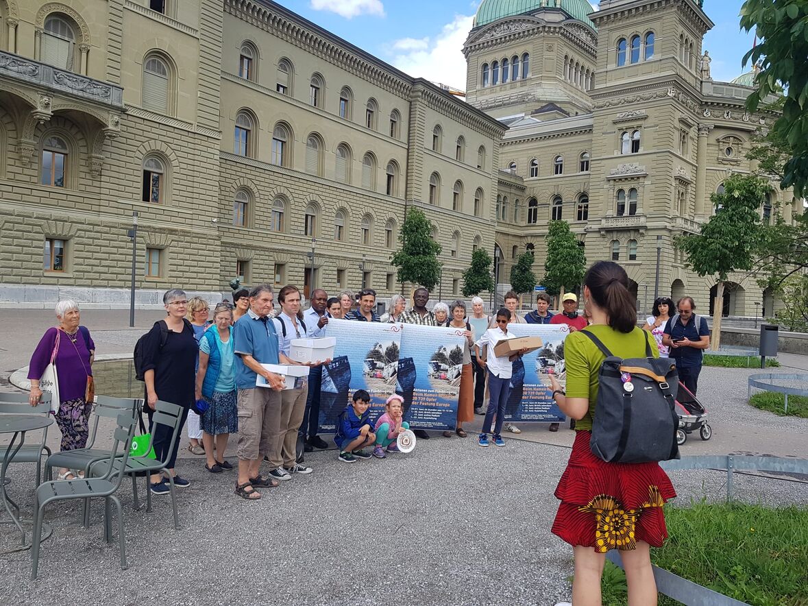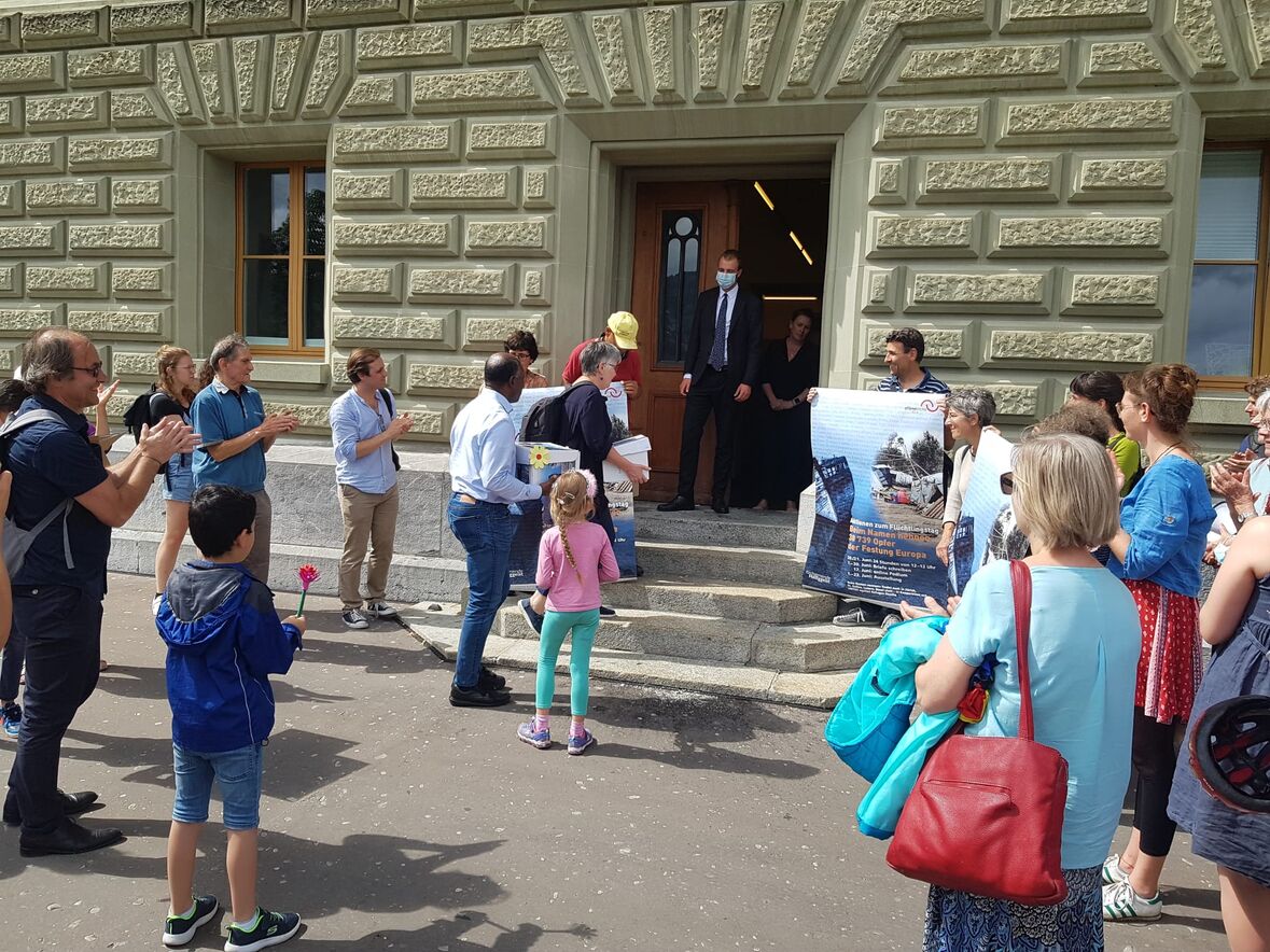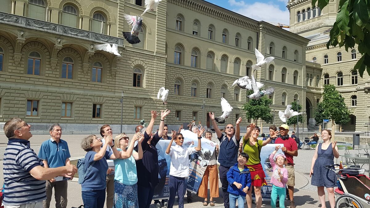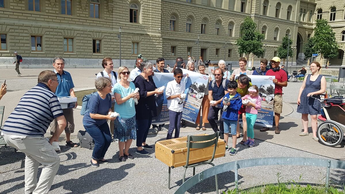 Mit Freude über die grosse Teilnahme der Schweizer Bevölkerung an der Aktion Beim Namen nennen zum Flüchtlingstag 2020 trafen sich die Organisatoren aus den Kirchen in den Städten Bern, Basel, Luzern, St. Gallen und Zürich in der Offenen Kirche Bern am 2. Juli zusammen. Dann reichten sie die über 2‘400 Briefe an den Bundesrat im Bundeshaus ein. Davor schickten sie Friedenstauben mit ihrer Friedensbotschaft los.