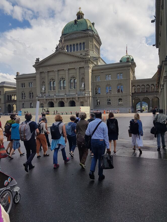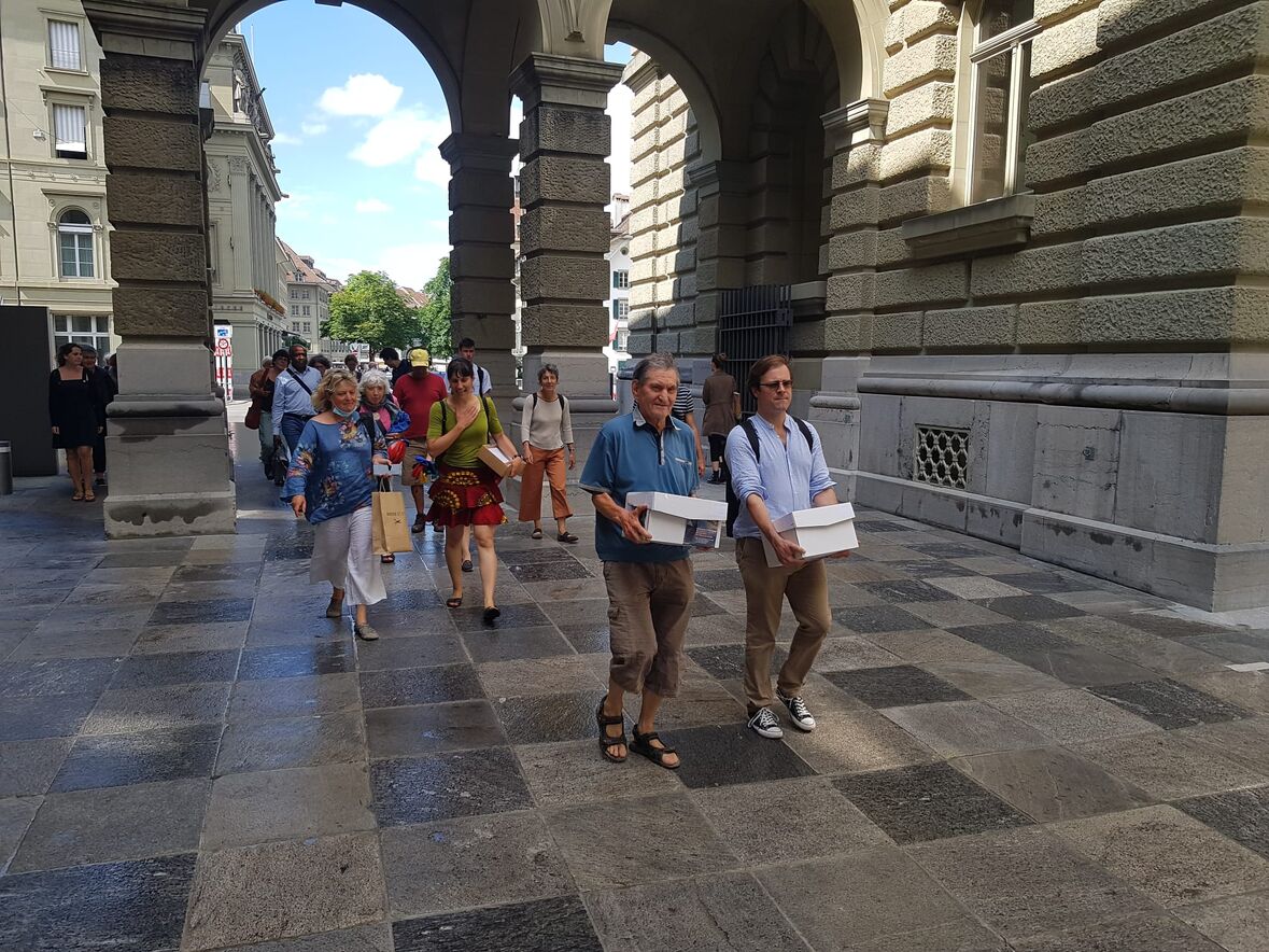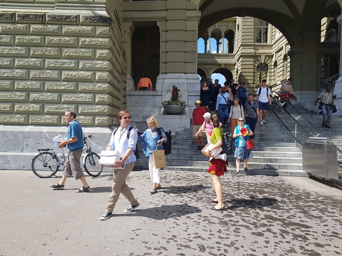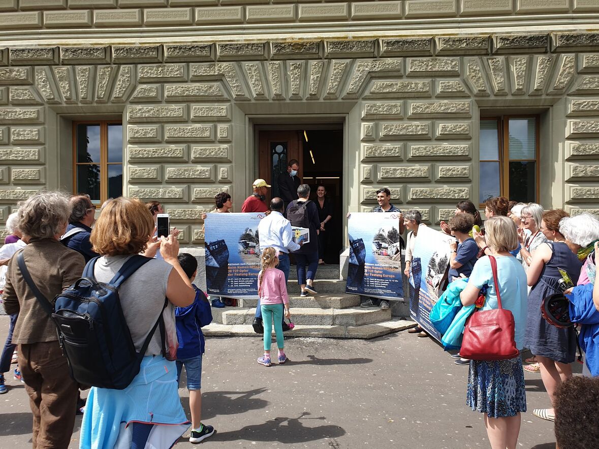 Mit Freude über die grosse Teilnahme der Schweizer Bevölkerung an der Aktion Beim Namen nennen zum Flüchtlingstag 2020 trafen sich die Organisatoren aus den Kirchen in den Städten Bern, Basel, Luzern, St. Gallen und Zürich in der Offenen Kirche Bern am 2. Juli zusammen. Dann reichten sie die über 2‘400 Briefe an den Bundesrat im Bundeshaus ein. Davor schickten sie Friedenstauben mit ihrer Friedensbotschaft los.