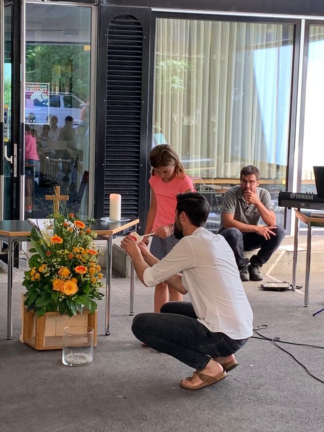 Auch dieses Jahr durften wir wieder auf dem Pausenplatz des Primarschulhauses Halden unseren traditionellen Familiengottesdienst zum Schulbeginn feiern. Eltern, Kinder, Lehrpersonen und andere Interessierte aus den Quartieren Neudorf, Stephanshorn, St. Fiden, Grossacker und Halden haben sich dabei ins Thema "Segen" vertieft und konnten sich gegenseitig für das Neue, das dem beginnenden Schuljar auf einige zukommt segnen.