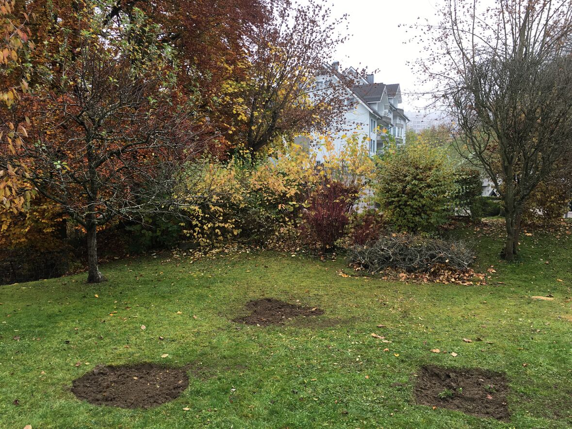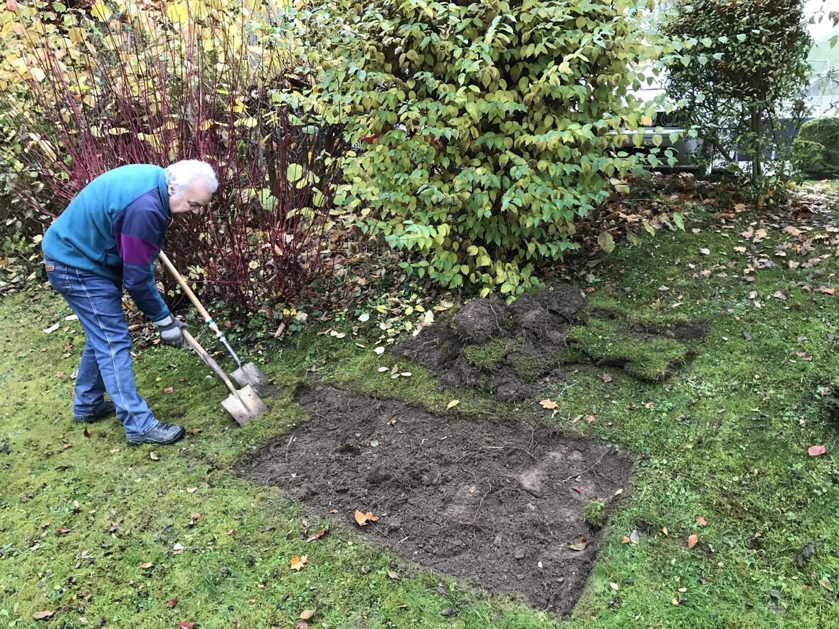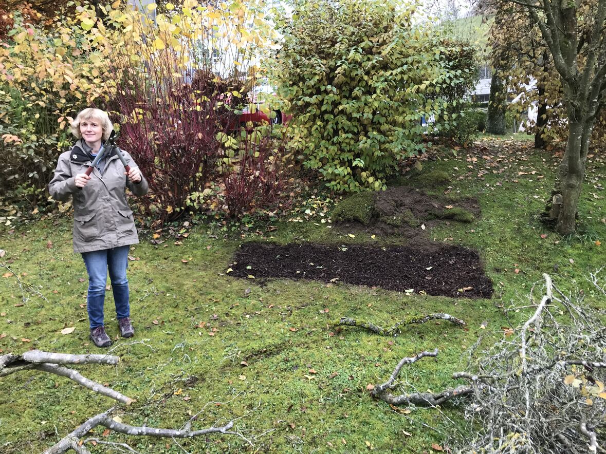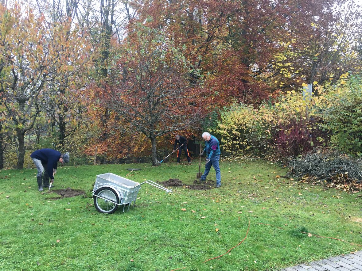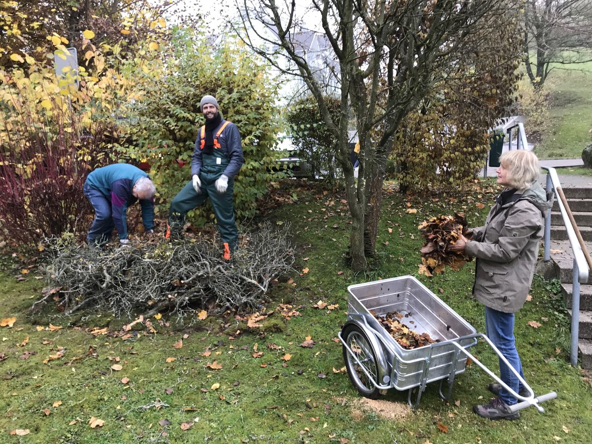 Die Gruppe "nachHALDig" plant nun auch die eine naturnahe Umgestaltung bestimmter Bereiche der Umgebung. Geplant sind nebem einem Asthaufen für Igel und anderes Getier, eine Trockensteinmauer, ein Hochstaudenbeet sowie einen Teil der Wiese nur einmal im Jahr zu mähen. Am Freitag, 6. November, wurde nun ein Asthaufen gebaut, der Igeln und anderen Kleintieren und Insekten eine Heimat zum Überwittern und Verstecken bieten soll. Äste und Baummaterial lieferte ein Baum, der am Morgen desselben Tages auf dem Platz vor der Kirche ersetzt werden musste.