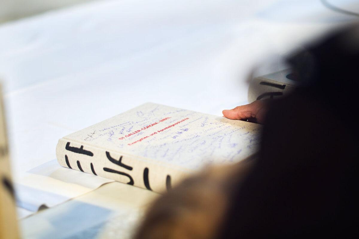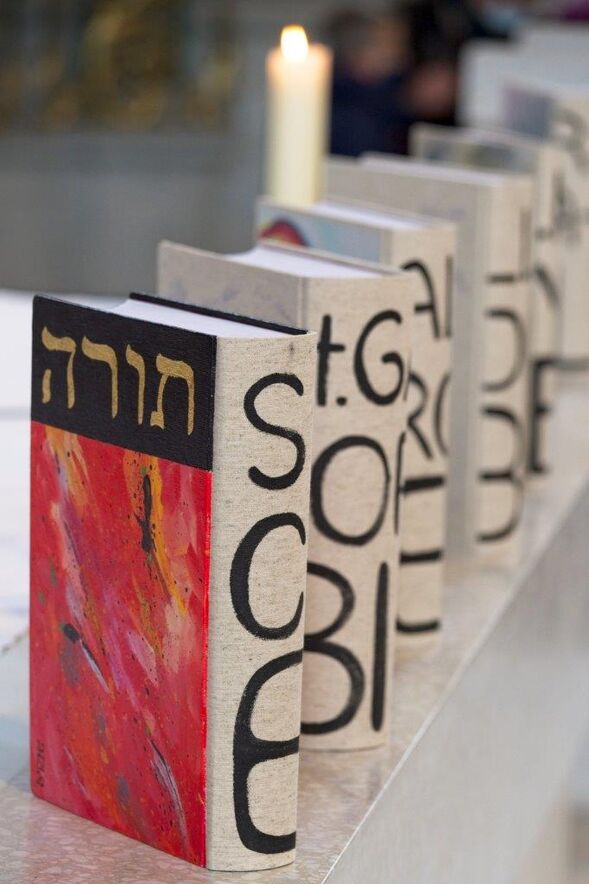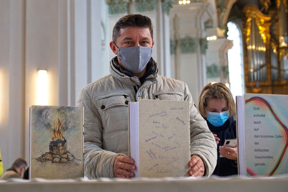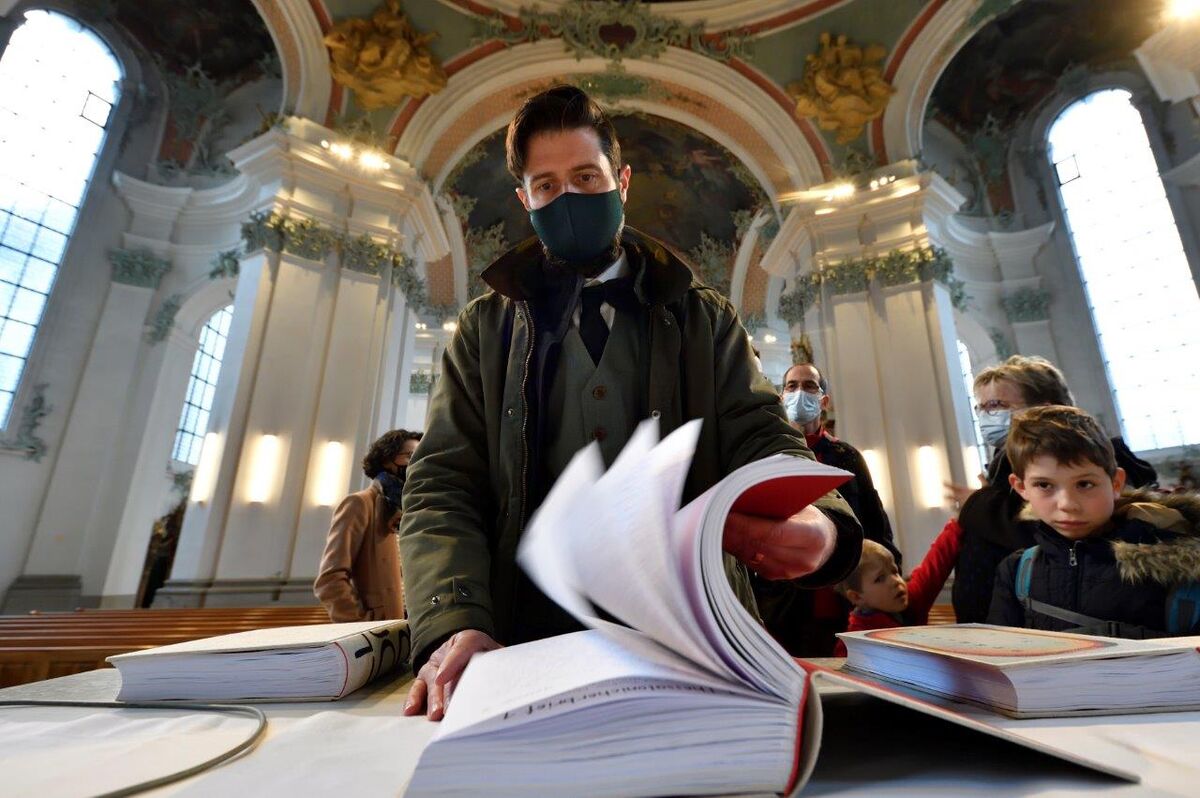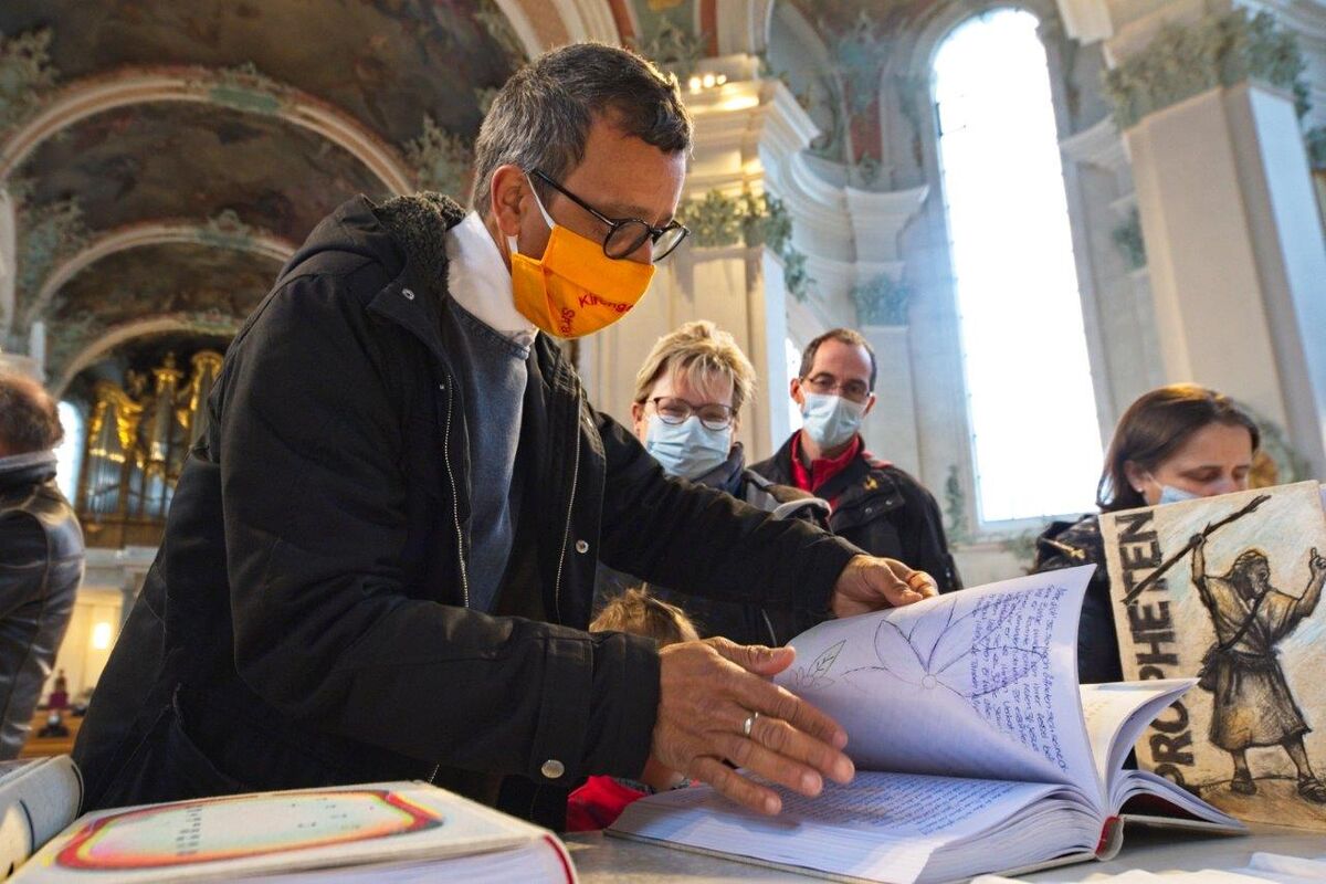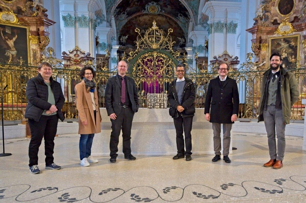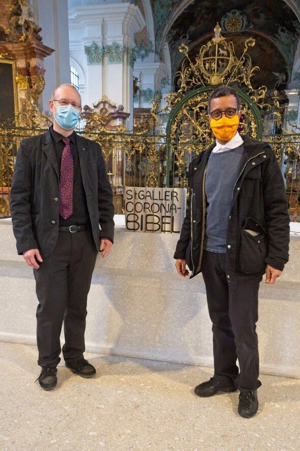 Am Jahrestag des ersten Lockdowns in der Schweiz, dem 14. März 2021, wurde die St.Galler-Coronabibel in der Kathedrale St.Gallen dem Stiftsbibliothekar Cornel Dora und somit der Stiftsbibliothek übergeben. Dieser Feier gingen drei dezentrale Feiern in St.Maria Neudorf, St.Laurenzen und evang.-ref. Bruggen voraus. Auf www.coronabibel.ch findet sich die ganze Corona-Bibel zum Durchblättern und viele Informationen zur Entstehung.