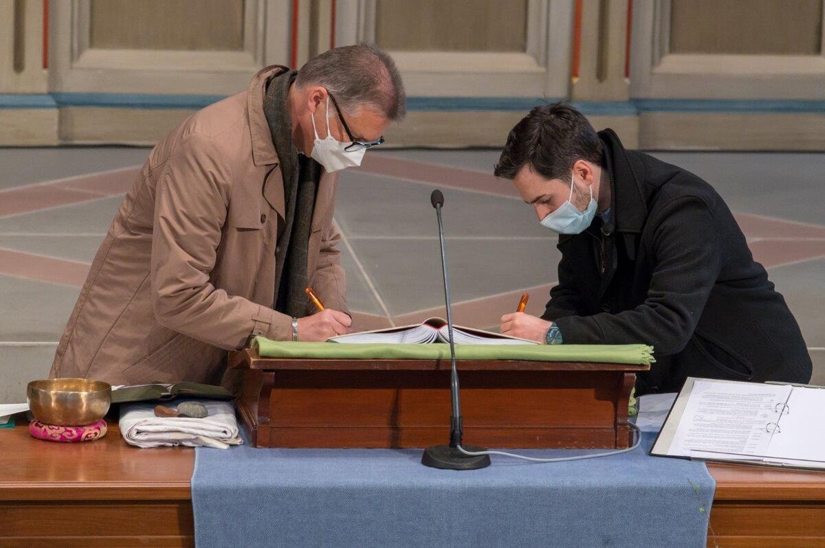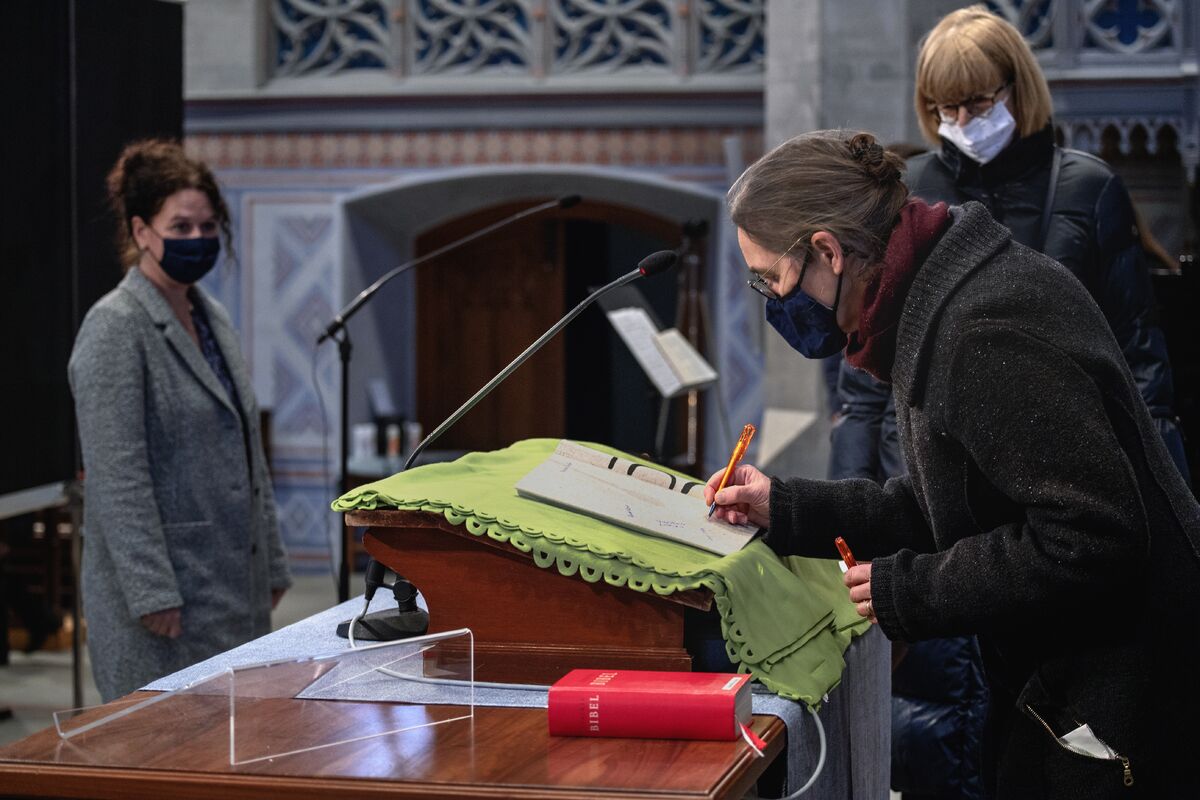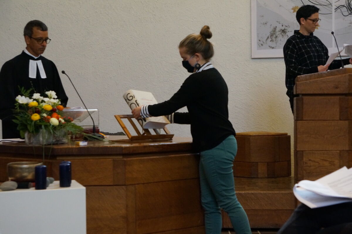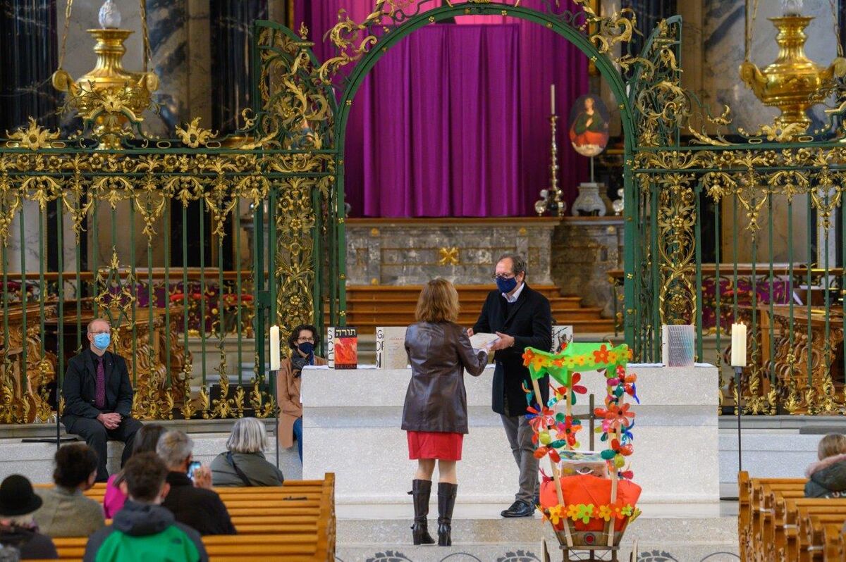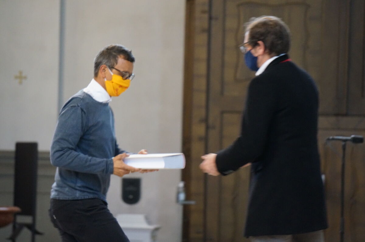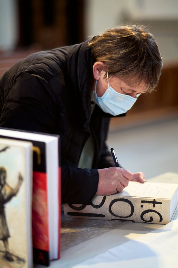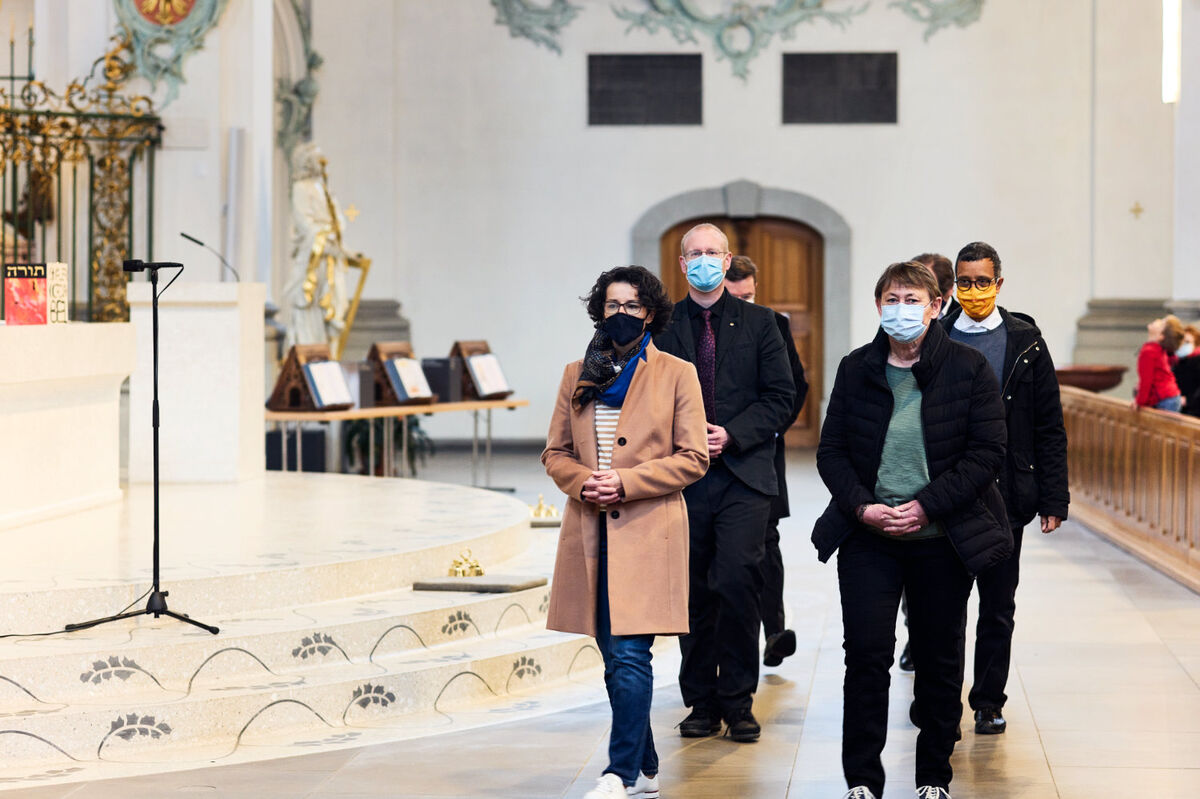 Am Jahrestag des ersten Lockdowns in der Schweiz, dem 14. März 2021, wurde die St.Galler-Coronabibel in der Kathedrale St.Gallen dem Stiftsbibliothekar Cornel Dora und somit der Stiftsbibliothek übergeben. Dieser Feier gingen drei dezentrale Feiern in St.Maria Neudorf, St.Laurenzen und evang.-ref. Bruggen voraus. Auf www.coronabibel.ch findet sich die ganze Corona-Bibel zum Durchblättern und viele Informationen zur Entstehung.