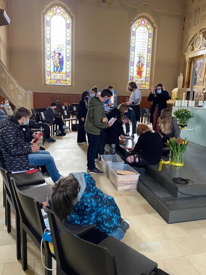 Jugendliche gestalteten für Jugendliche eine vielfältige Osternacht. Nach einer Kennenlern-Spielrunde war stand eine Besinnung auf dem Programm. In einem Bibliodrama konnten die Teilnehmenden das Thema Verrat in den Alltag übersetzen. Schülerinnen aus dem Notkerschulhaus umrahmten die Feier mit musikalischen Beiträgen. NAch einer Fackelwanderung zum Gedicht "Osterspuren" wurde das Osterfeuer entzündet. Spiele und Osterwitze rundeten den Abend ab. Zum Schluss wurden die Gottesdienstbesuchenden der Oternachstfeier in der Neudorfkirche mit einem süssen Ostergruss überrascht und beschenkt.