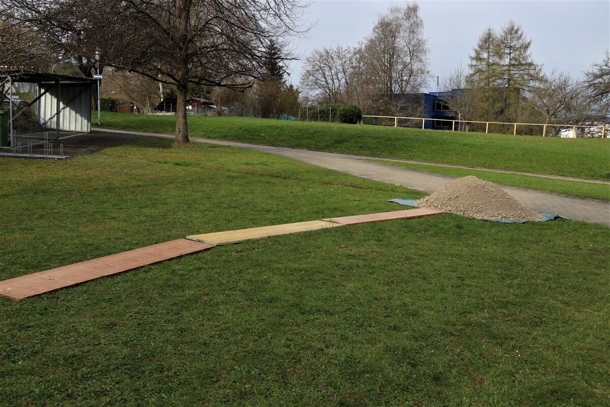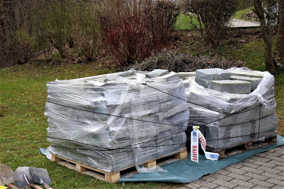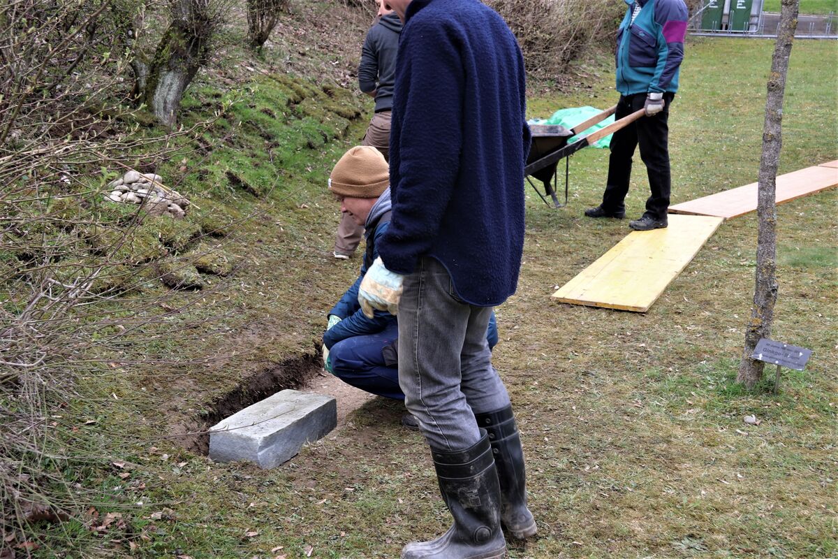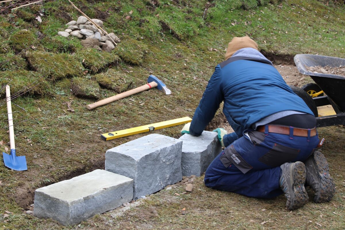 Bau einer Trockenmauer auf der Wiese vor der Haldenkirche « zurück