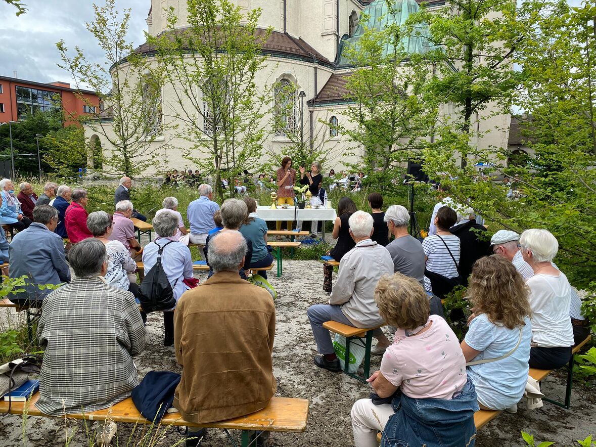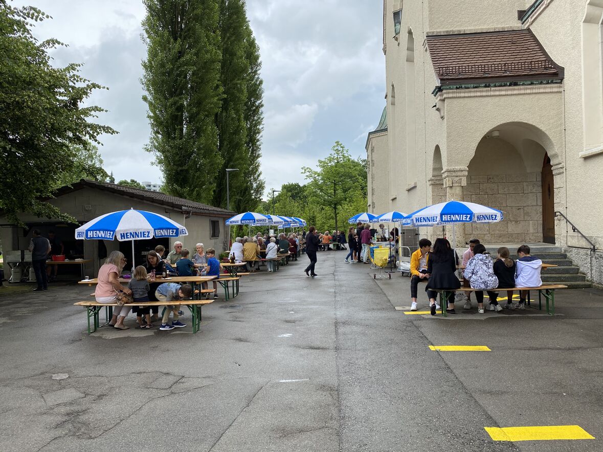 Zuerst der Gottesdienst zum Schöpfungspsalm 104 im Naturmuseums-Park, dann Bratwurst und Käse vom Grill und ein Dessert vom umfangreichen Kuchenbuffet - die zahlreichen Besucherinnen und Besucher des Pfarreifäschts im Neudorf genossen es sichtlich, sich mal wieder zu einem Fest zu treffen. Der Freude konnte auch ein kurzer Regenguss nichts anhaben: Man stellte sich unter, trocknete Tische und Bänke und das Fest konnte weitergehen.