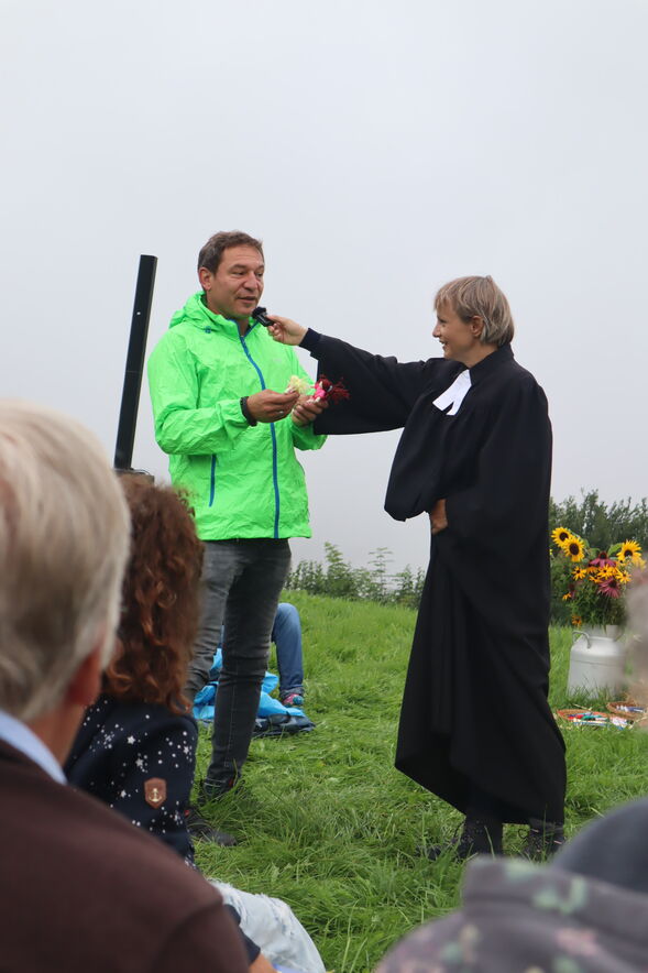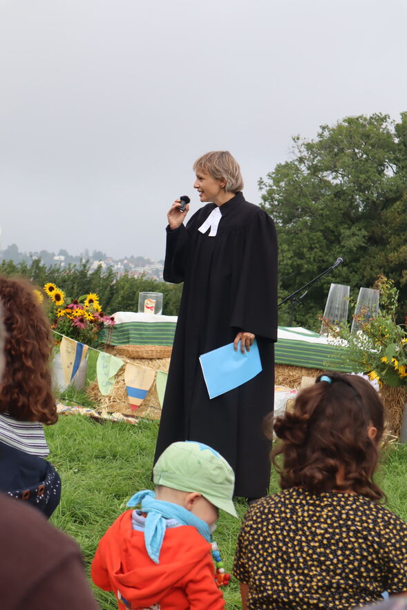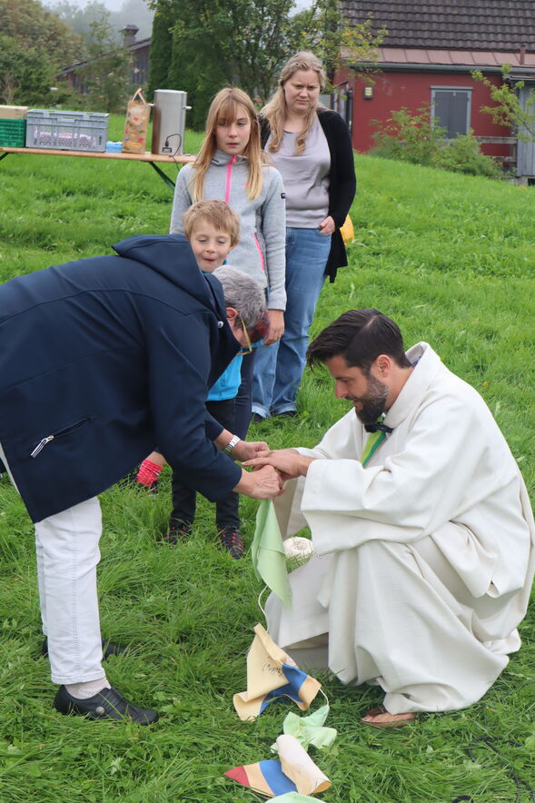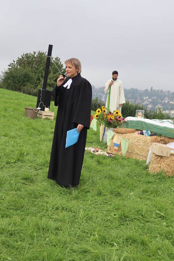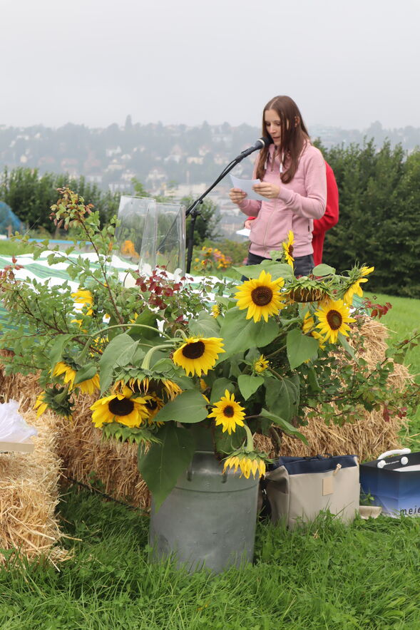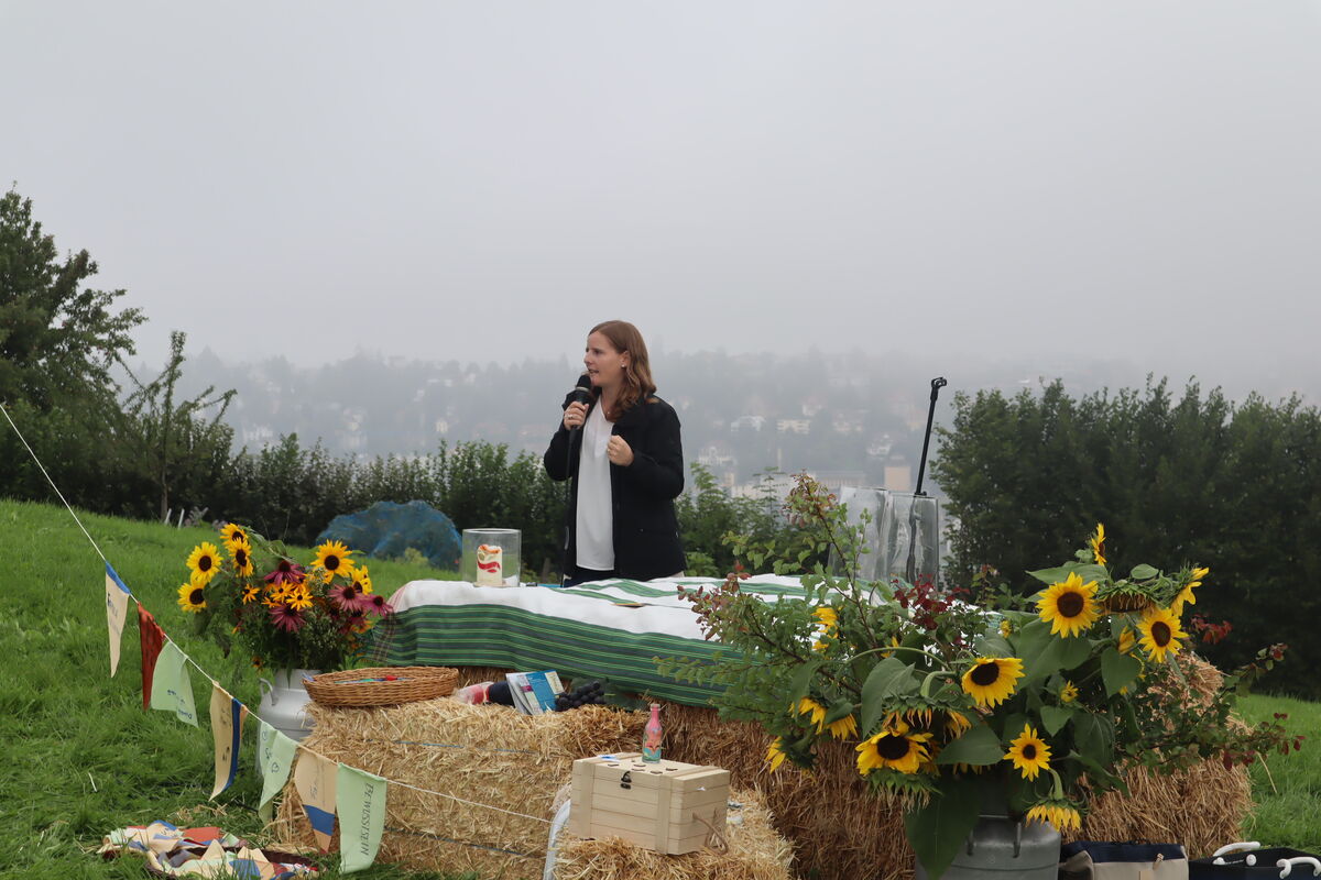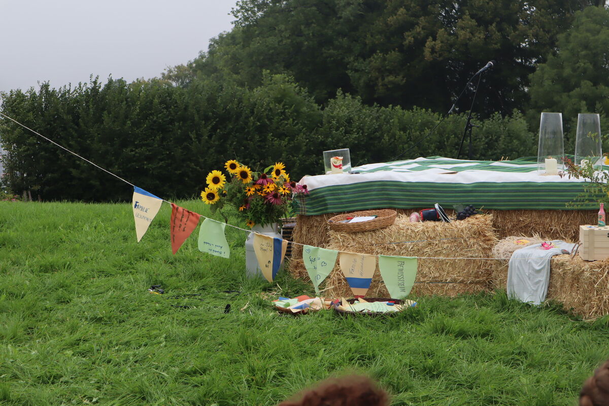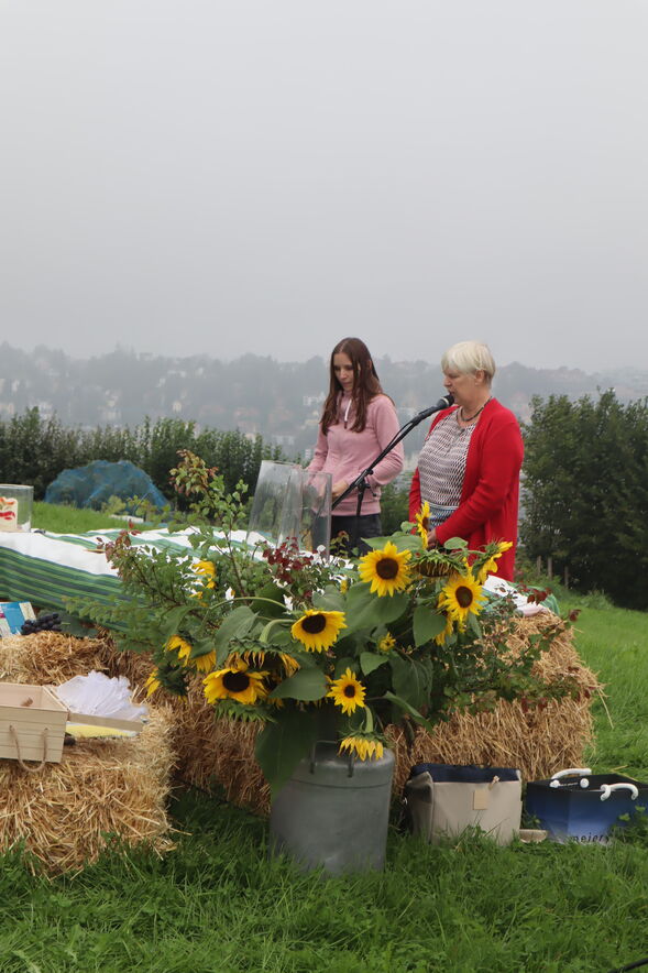 Auch dieses Jahr haben wir Gemeinden im Südosten St. Gallens wieder miteinander Erntedank auf einem unserer Bauernhöfe gefeiert. Nachdem schon die letzten Jahr zuvor viele Menschen mit grosser Begeisterung an diesem Openair-Gottesdienst teilgenommen haben, haben wir dieses Jahr wieder einmal den Scheitlinsbüchel als Location ausgesucht. Dort hat die Familie Gantenbein für uns die Tore ihres Hofs geöffnet und uns so ermöglicht, dafür sensibel zu werden, wie sehr wir dafür dankbar sein können, dass die Natur uns mit Grundnahrungsmitteln versorgt. Der Gottesdienst hat darauf aufmerksam gemacht, dass viele Menschen dazu beitragen, dass wir jeden Tag so eine reiche Auswahl an Essen vorfinden und satt werden können. Und er hat deutlich gemacht, dass es wichtig, gute Nahrungsmittel zu verwenden und die Arbeit einer fairen und regionalen Landwirtschaft zu unterstützen. Und natürlich haben wir auch gedankt. Danken öffnet für Spiritualität. Das Erntedankfest auf dem Bauernhof wurde auch dank der Musik von Elias Menzi (Hackbrett) und Alexander Sennhauer (Klavier) zu einem spirituellen Erlebnis für Jung und Alt! Gemeinsam haben alle Teilnehmenden einen Dankbarkeitswimpel gestaltet, der an der Haldenkirche aufgehängt wurde.