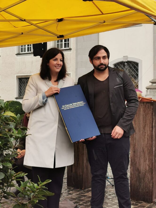 Eröffnet wurde die Feier, die in dieser Form einmalig in der Schweiz ist, durch ein Grusswort von Stadträtin Sonja Lüthi (GLP). Sie erinnerte an den ersten Buss- und Bettag, der 1639 in St. Gallen nach mehreren Seuchenepidemien während des Dreissigjährigen Krieges durchgeführt wurde. Es folgte eine kurze Ansprache von Regierungsrätin Laura Bucher (SP), die auf die St. Galler Erklärung einging. Dieses Dokument wurde vor 15 Jahren gemeinsam entwickelt; es ist ein eindrückliches Manifest, das sich einerseits gegen jegliche Vereinnahmung, extreme Auslegung oder gewalttätige Umsetzung von Religion ausspricht und andererseits die gemeinsamen Werte der Religionen betont, die das Fundament einer friedlichen Gesellschaft bilden. Auch in diesem Jahr wurde die St.Galler Erklärung von einer neuen Religionsgemeinschaft unterzeichnet – durch den Präsidenten des Alevitischen Kulturzentrums Ostschweiz, Hürsen Dogan. Er zitierte den mystischen Dichter Hacı Bektaş-ı Veli, dessen Lyrik eine der spirituellen Grundlagen des alevitischen Glaubens darstellt.