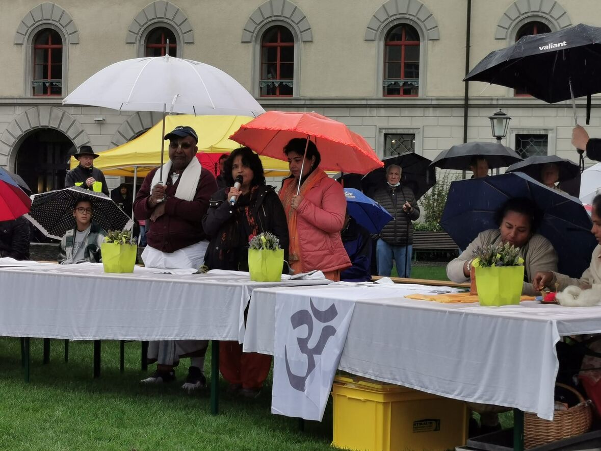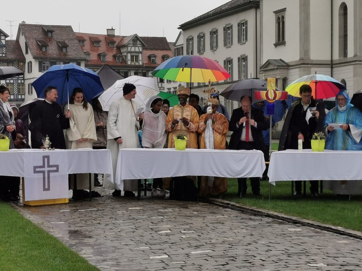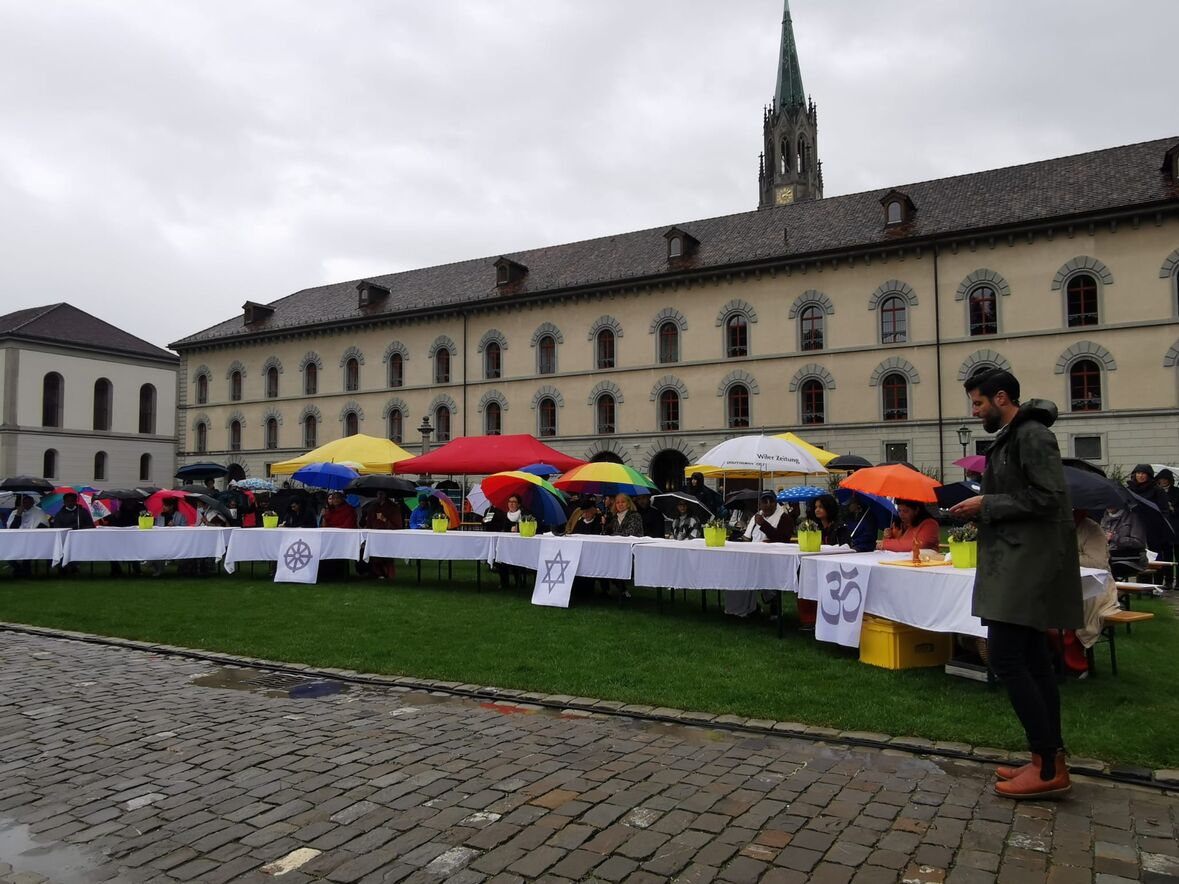 Menschen aus 20 verschiedenen Religionsgemeinschaften aus St. Gallen und Umgebung hatten sich trotz stark anhaltendem Regen und spürbarem Temperatursturz nicht abhalten lassen, die interreligiöse Feier auf dem Klosterplatz zu feiern. Der Bettag wird in St. Gallen gemeinsam von Kanton und Stadt St. Gallen, den Landeskirchen sowie vielen anderen Religionsgemeinschaften gestaltet.