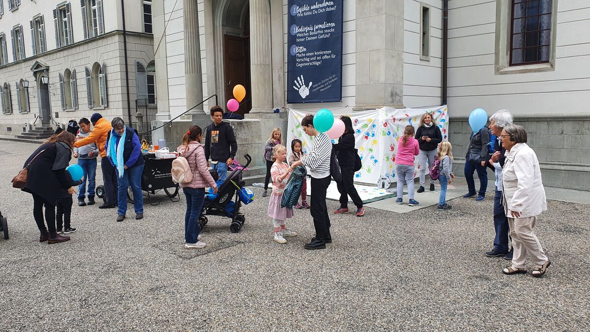 «Mit unserer öffentlichen Aktion auf dem Klosterplatz St.Gallen laden wir die Menschen dazu ein, den eigenen Umgang mit anderen Menschen zu reflektieren und ihnen respektvoll zu begegnen. Mit vielen farbigen Handabdrücken setzen wir gemeinsam ein Zeichen für ein respektvolles und friedliches Miteinander.» erklärt Cityseelsorger Matthias Wenk.