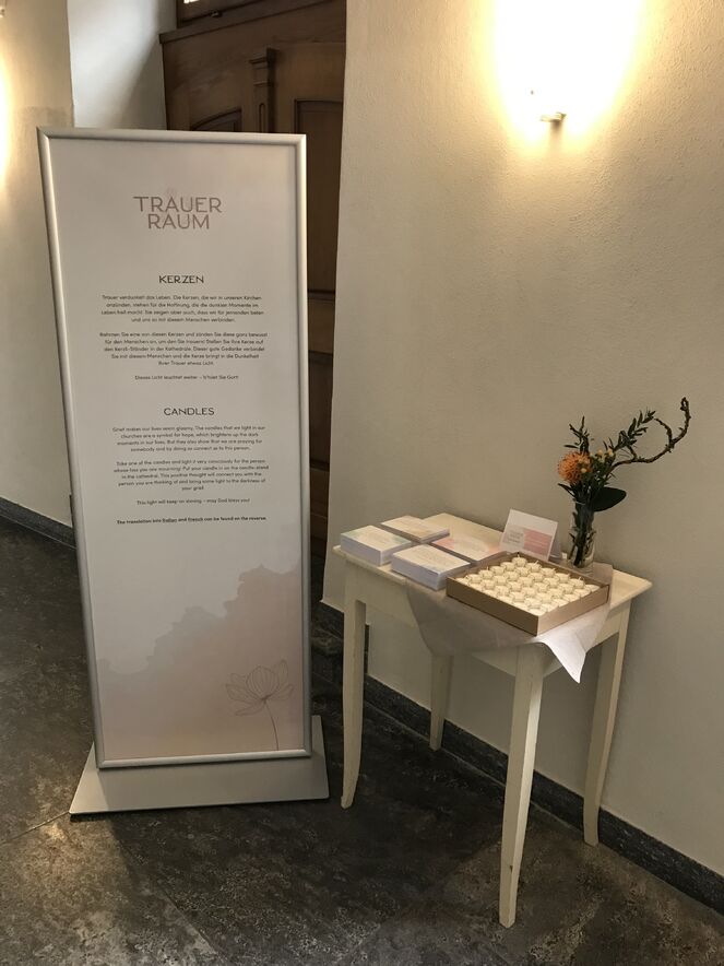 Seit Samstag, 30.Oktober, ist der TrauerRaum im Kreuzgang der Kathedrale geöffnet. Wir trauern, wenn Beziehungen zerbrechen, Lebensträume unerfüllt bleiben oder wenn ein geliebter Mensch stirbt. Trauer ist die schmerzhafte, aber heilsame Reaktion auf einen schwerwiegenden Verlust. Oft schlucken wir unseren Kummer und unsere Tränen hinunter.