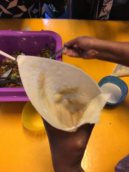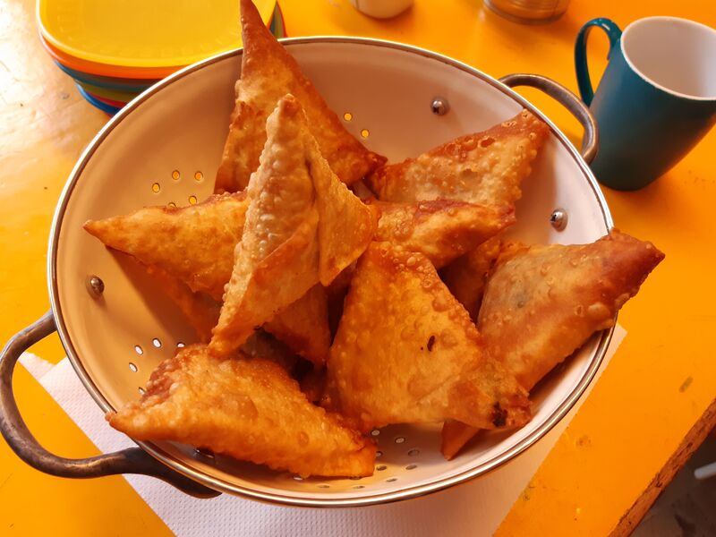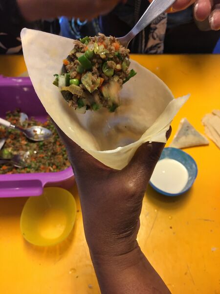 Eine Somalierin knetete den selbsgemachten Teil in kleine Bälle und in weiteren Schritten wallte sie mit einem speziellen Wallholz kunstvoll die Teigbälle in hauchdünne Teigblätter. Sie zeigte uns, wie man die dünnen Blätter zusammenrollt, sodass es wie eine "Eistüte" aussah. Dann wurde die "Tüte" mit dem Hackfleisch, dem Gemüse gefüllt und kurz fritiert. Die Sambusa schmeckten wunderbar!
