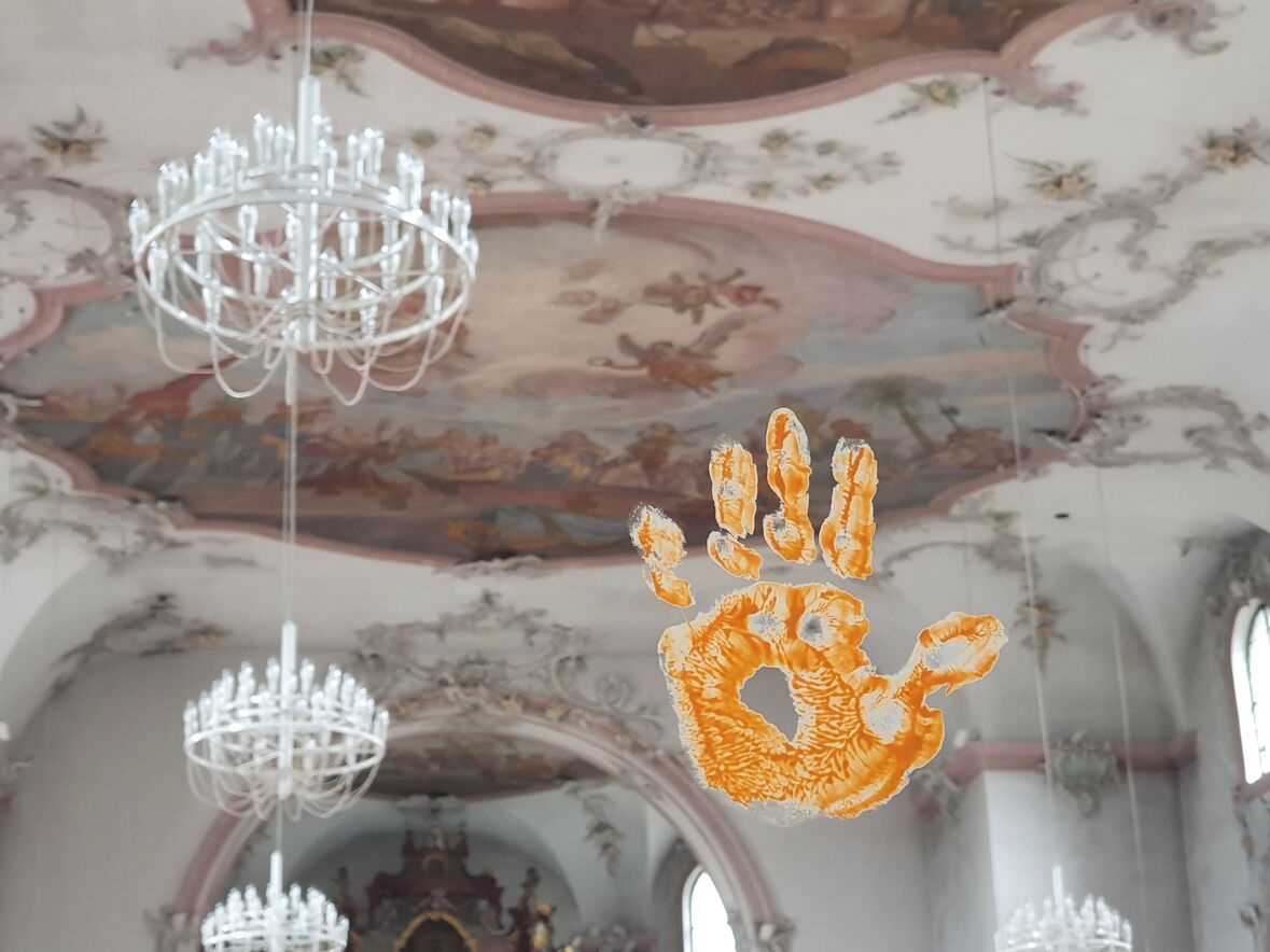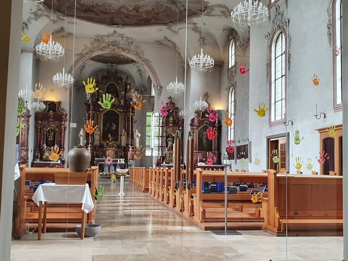 Die Glaswand zwischen Kirchenraum und Begegnungsraum wartet noch auf den letzten Schliff. Bis dahin dürfen uns die bunten Handabdrücke der Kinder der ersten Klasse im Grossacker ein Lächeln hervorzaubern. Vielen Dank, liebe Kids!