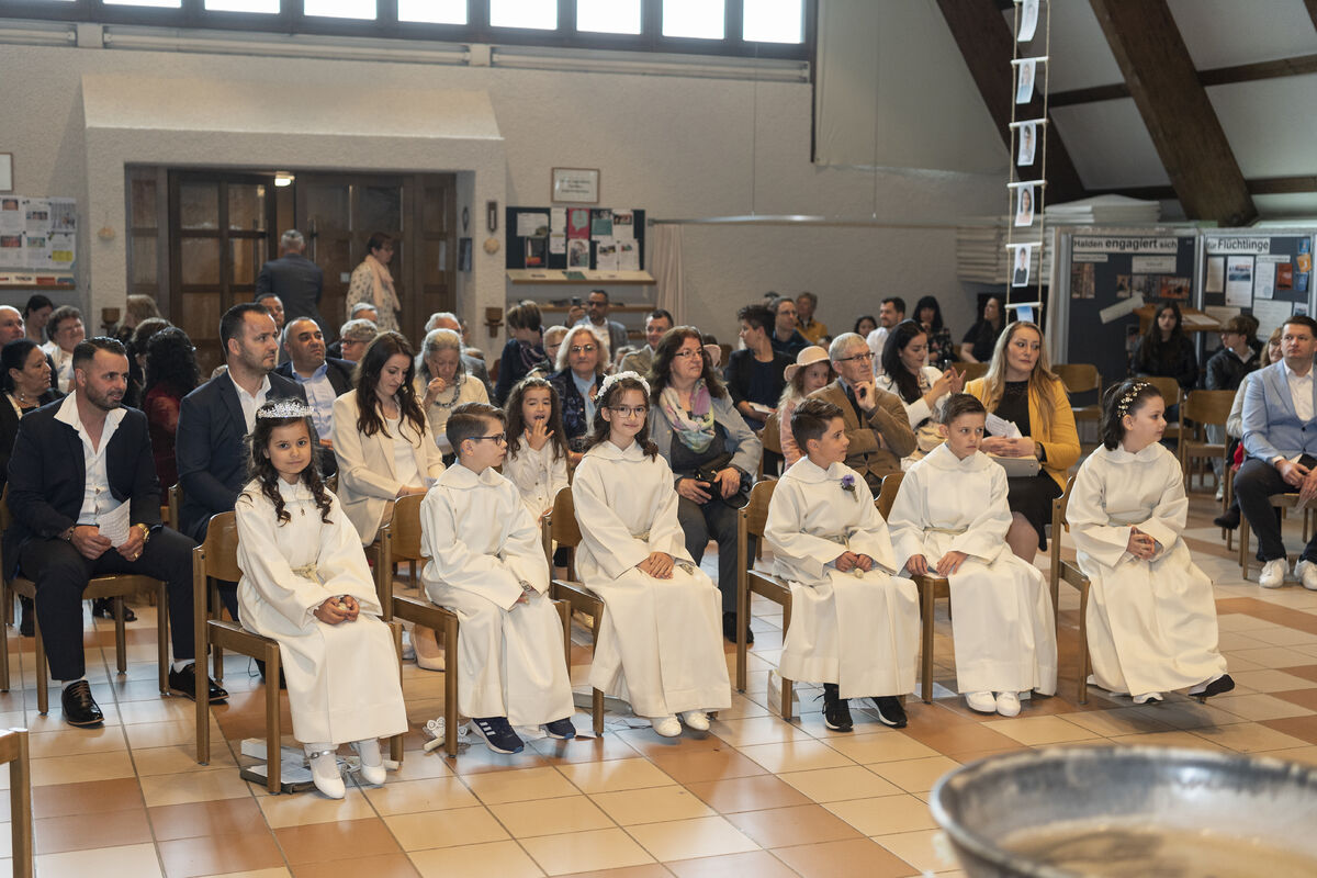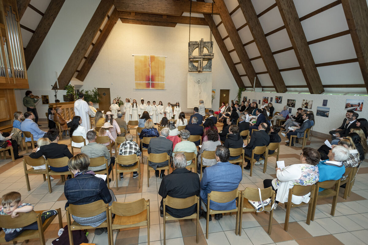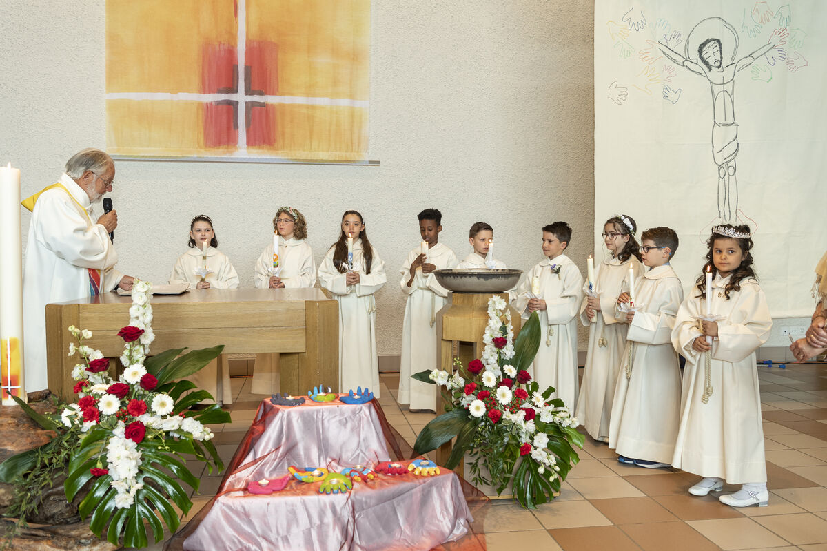 An diesem Sonntag durften 9 Kinder aus unserem Quartier zum ersten Mal die Kommunion empfangen. Es war ein bunter Gottesdienst. Die Erstkommunionkinder begrüssten ihre Gäste in sieben verschiedenen Sprachen. So unterschiedlich Menschen auch sind: unser Glaube bringt sie alle an einem Tisch zusammen - denn es verbinden sich Himmel und Erde. Das durften die Kinder und ihre Familien in diesem Gottesdienst spüren!