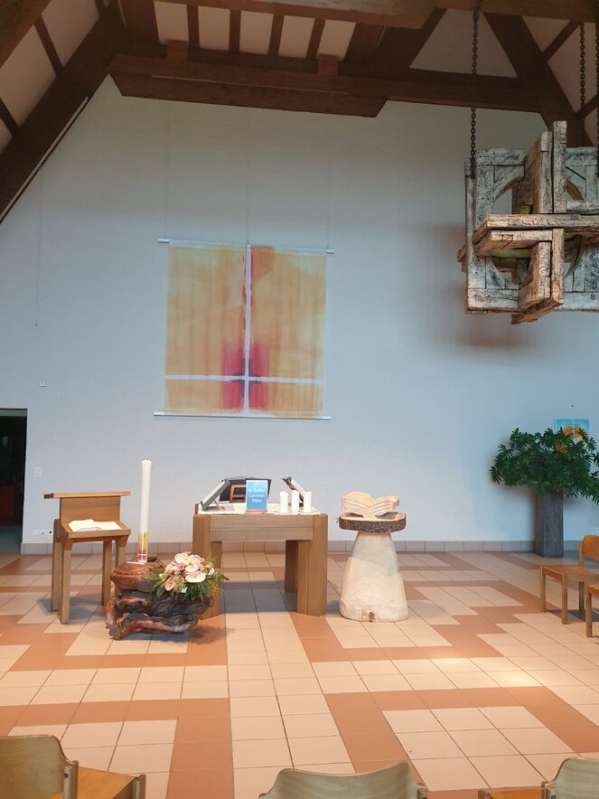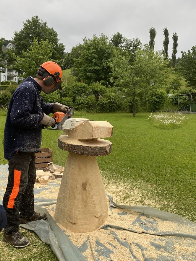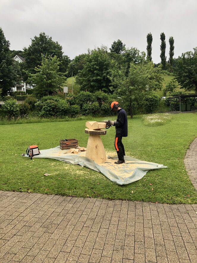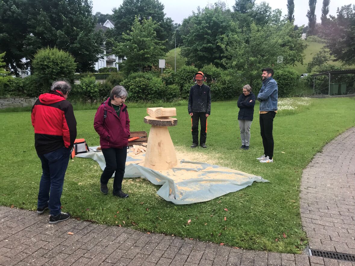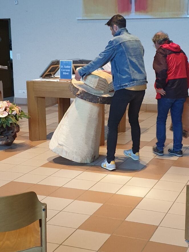 Pfrn. Andrea Weinhold hat gemeinsam mit Paul Pfenninger am Abend des 31. Mai einen spa(h)nnenden Auftaktanlass organisiert: aus einem Baumstumpf sägte Paul Pfenninger mit einer Kettensäge eine ausgeschlagene Bibel. Das so entstandene Kunstwerk steht nun in der Kirche und verweist auf die drei Bände der Corona-Bibel, die auf dem Abendmahlstisch den Juni über ausgestellt sind.