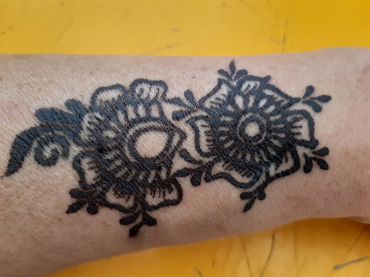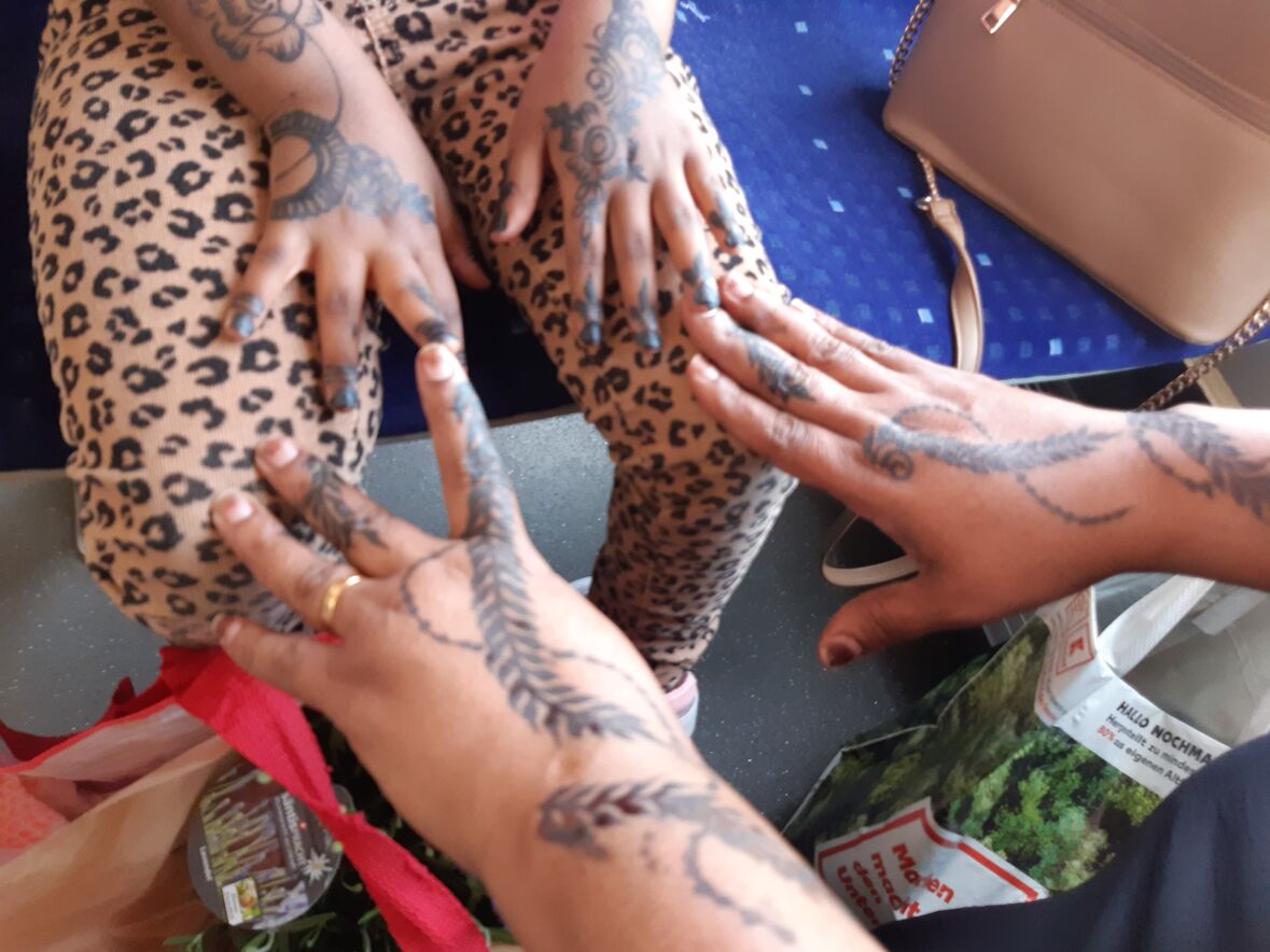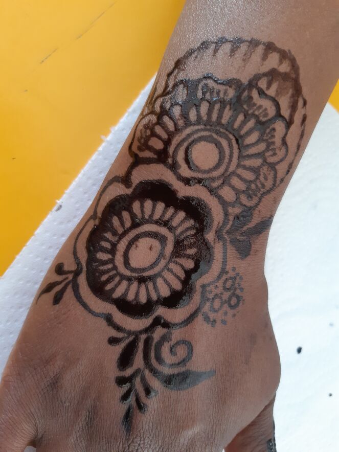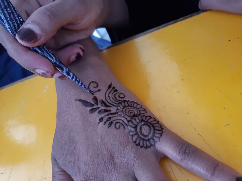 Mit flinker und ruhiger Hand führt die zierliche Frau die schwarze Farbe in feinen Strichen über die Haut. Im Handumdrehen zieren filigrane Blumenmuster und Ornamente die ausgestreckten Hände der zahlreichen interessierten Frauen.