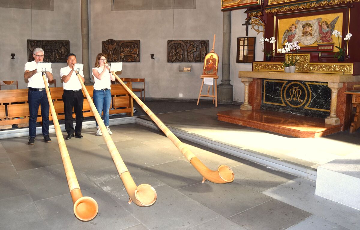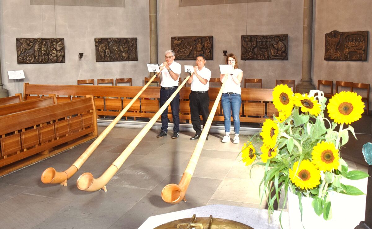 Die Gaiserwalder Alphornbläser begleiteten den Gottesdienst mit Alphornklängen. Dabei kam das Gottesdienstpublikum im Genuss von selbstkomponierten Musikstücken.