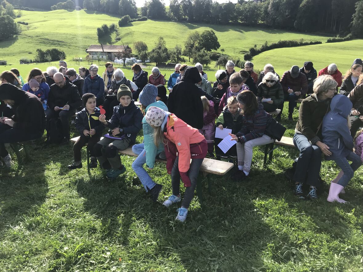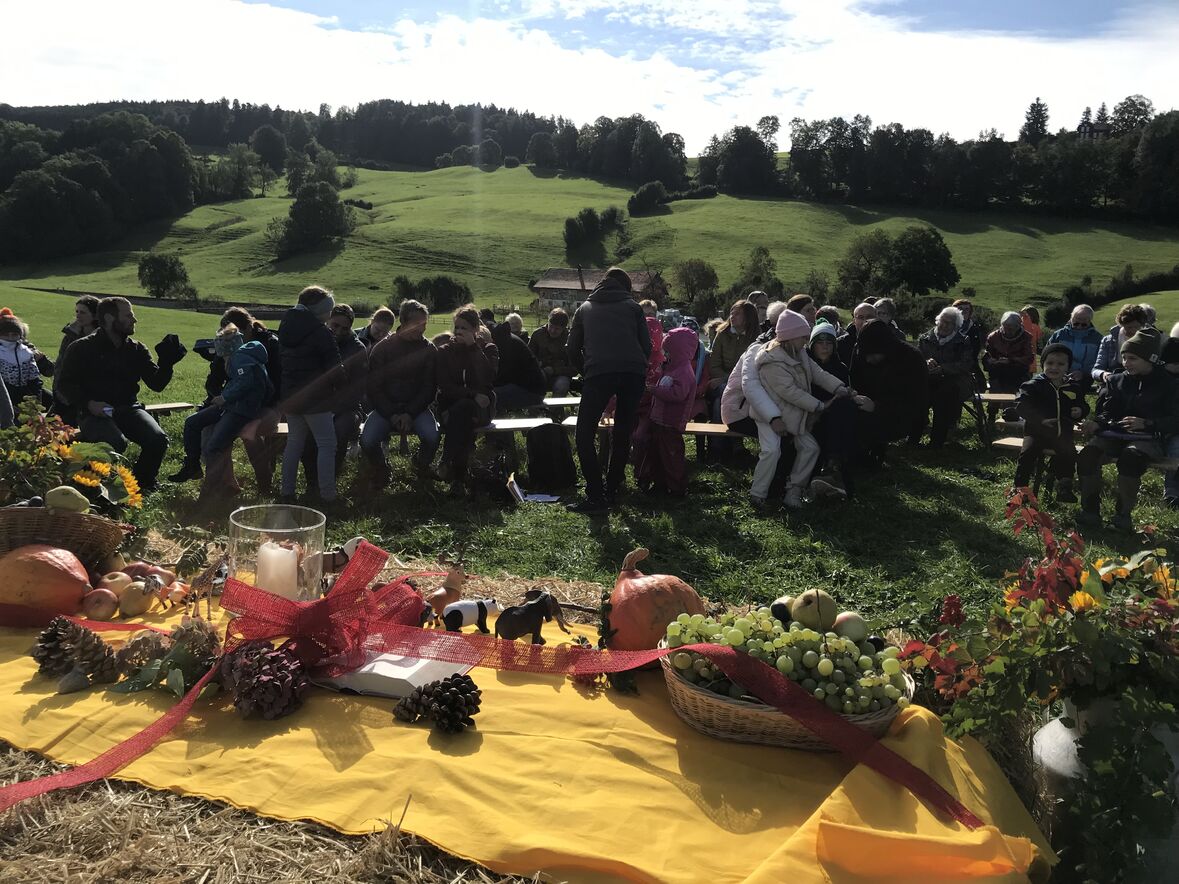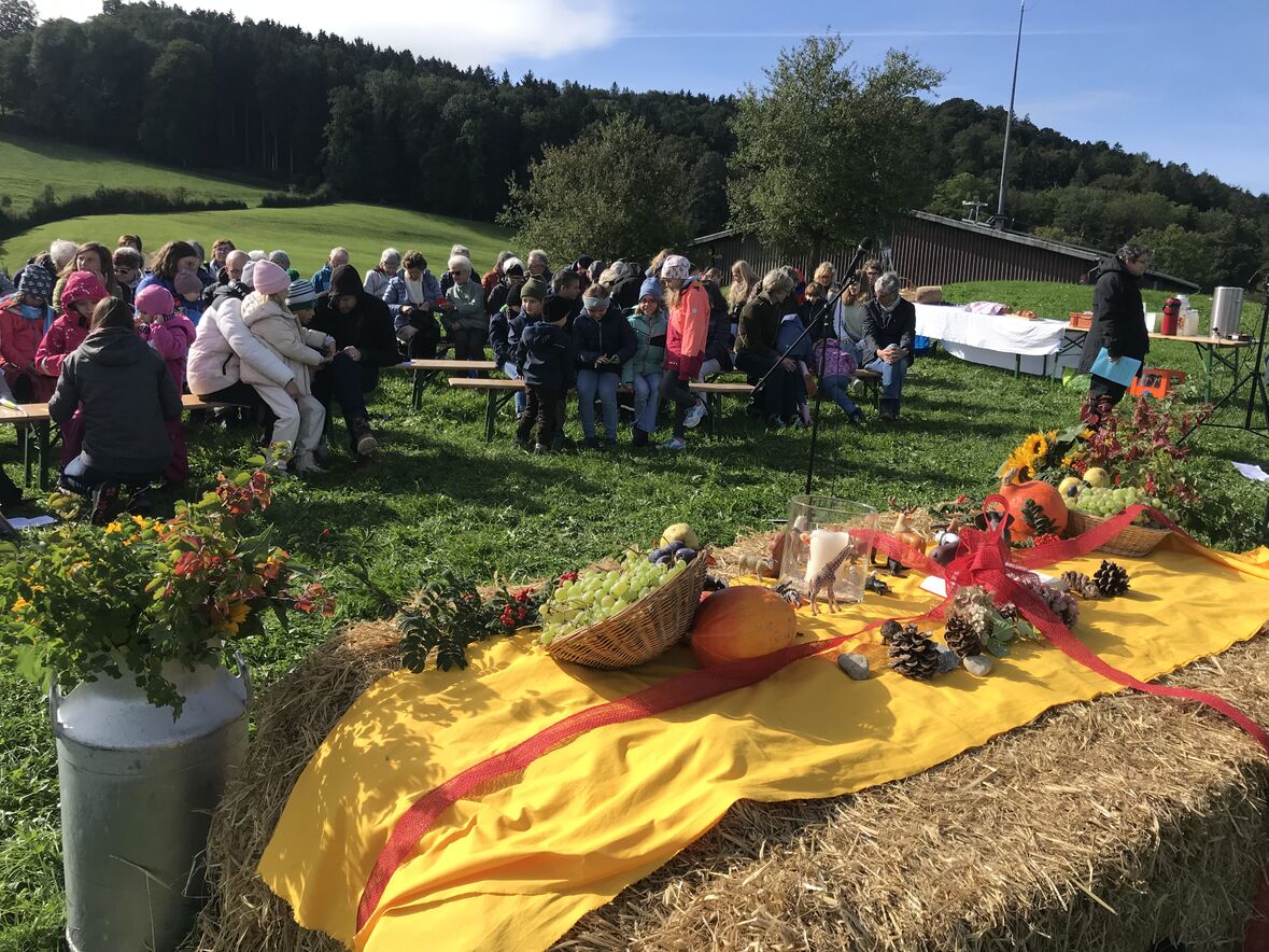 Als Erntedankfest feierten wir einen Familiengottesdienst bei der Familie Gantenbein auf ihrem Bauernhof im Scheitlinsbüchel. Trotz des eher kühlen, jedoch sonnigen Wetters kamen viele Familien mit ihren Kindern und Erwachsene aus den Quartieren im Südosten zu diesem lebendigen und fröhlichen Gottesdienst.