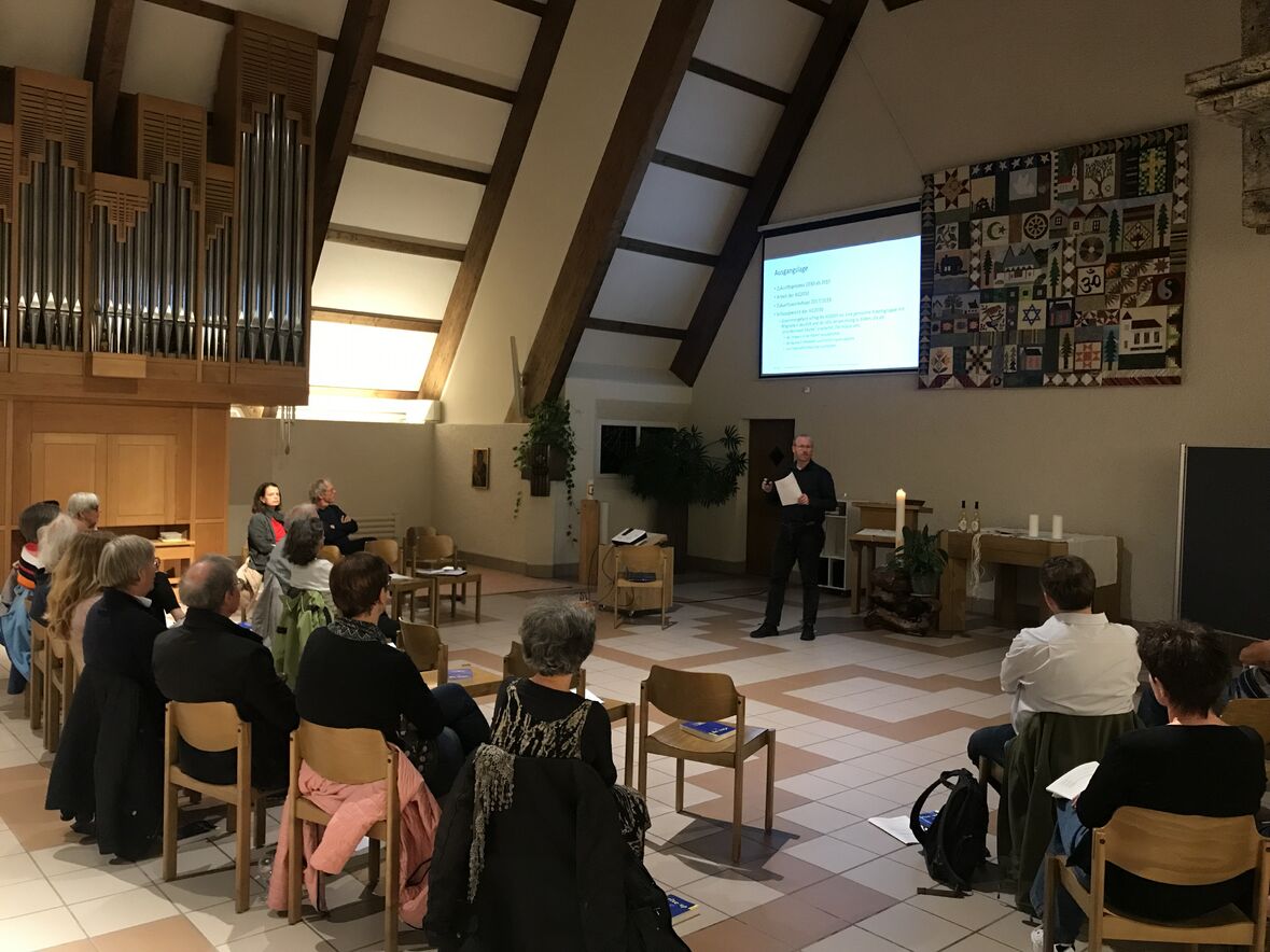 Der Vernehmlassungsprozess "Räume und Infrastruktur" der katholischen Kirchgemeinde St. Gallen hat uns dazu motiviert, auch in der Halden über die Zukunft unserer kirchlicher Räume nachzudenken - oder besser gesagt ispiriert darüber zu diskutieren, welche Räume eine Haldenkirche der Zukunft benötigt. Peter Graf, der Präsident der KIVO Tablat, und Roman Rieger, der Leiter der Pastoralen Arbeitsstelle der Kath. Kirche im Lebensraum St. Gallen haben dazu zunächst die je konfessionellen Rahmenbedingungen und Überlegungen zur Raumfrage erläutert.