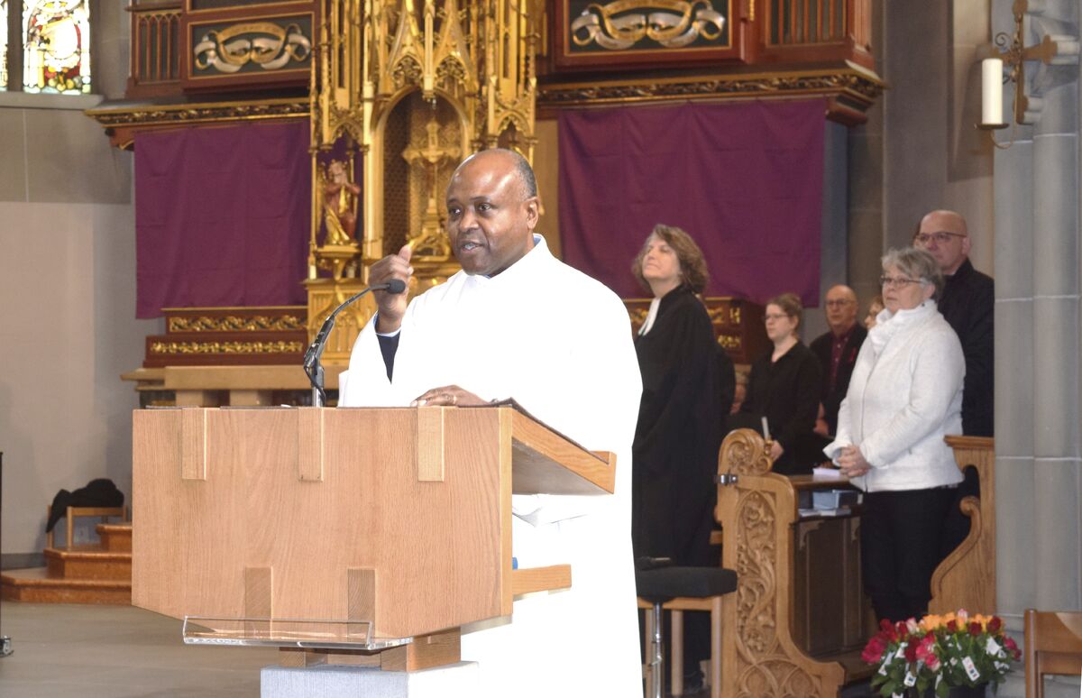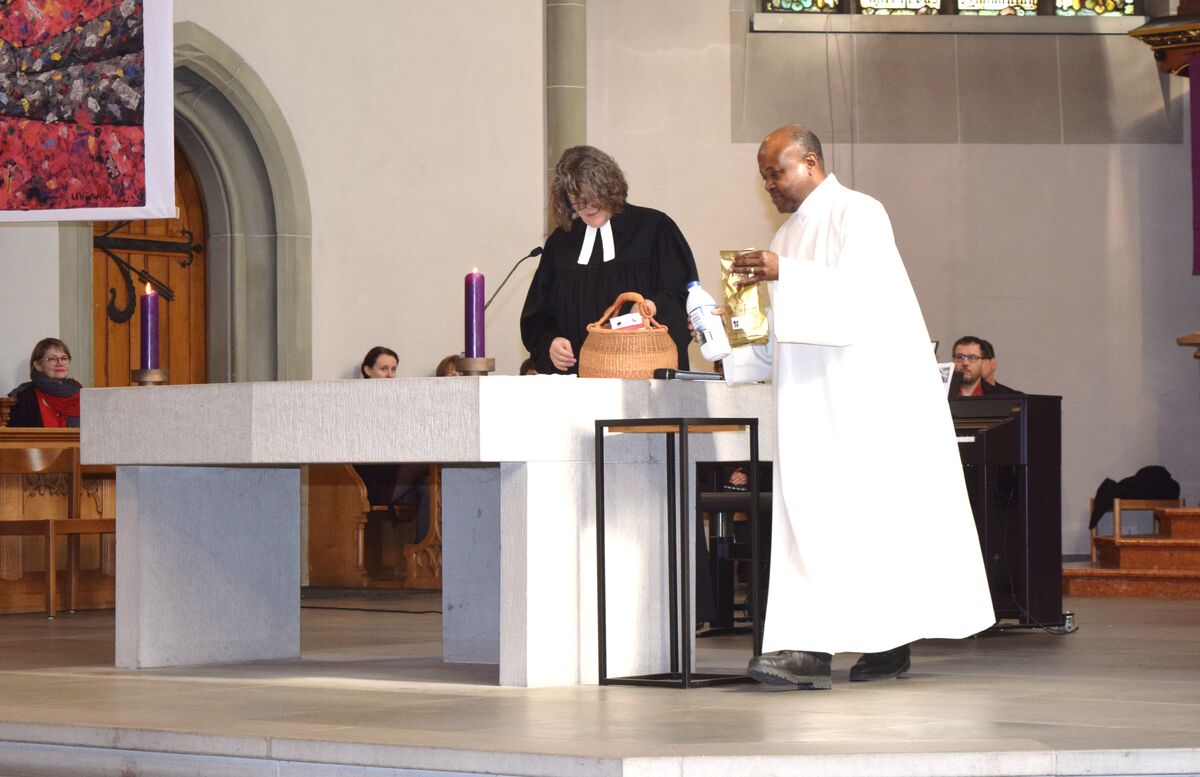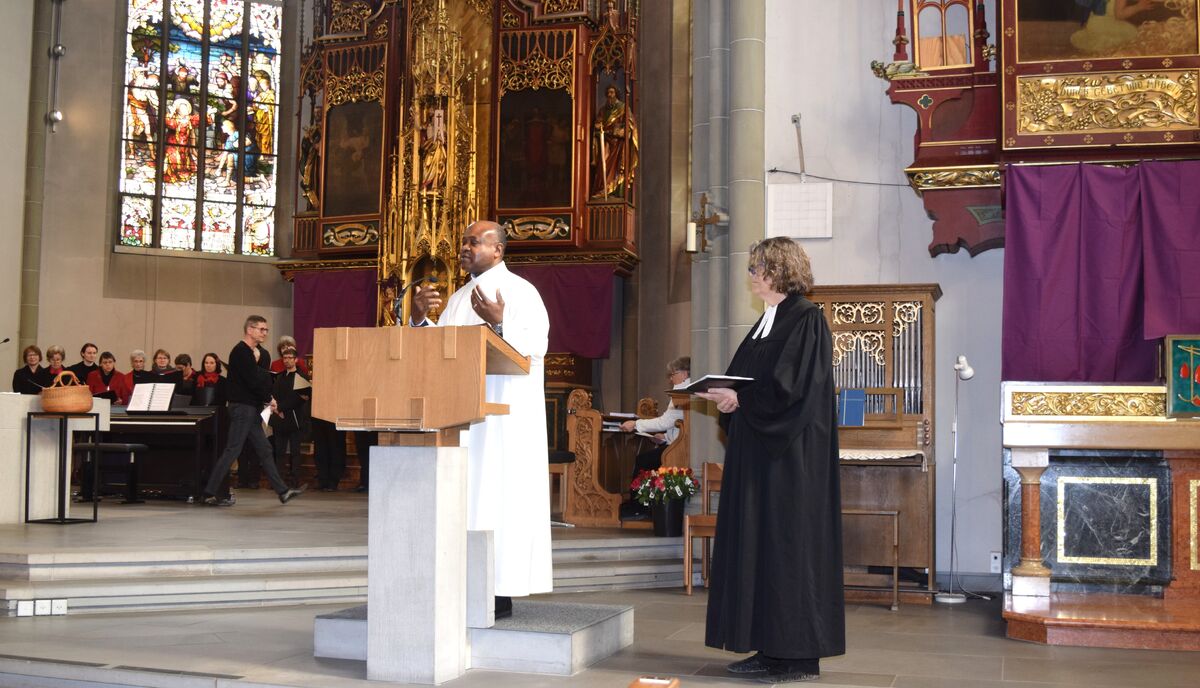 Chika Uzor und Pfarrerin Regula Hermann gestalteten den Ökumenischen Gottesdienst in der Kirche St. Otmar. Pfarrerin Hermann bezog dabei die Gottesdienstteilnehmerinnen und -teilnehmer ein zum Thema Brot. Wieviele Personengruppen und Berufe sind notwendig, bis wir das Brot auf unserem Tisch haben. Dabei konnten die Gottesdienstteilnehmer Vorschläge machen. Chika Uzor erläuterte noch eingehender die Nord- Südproblematik zum Thema "Ernährungssicherheit".