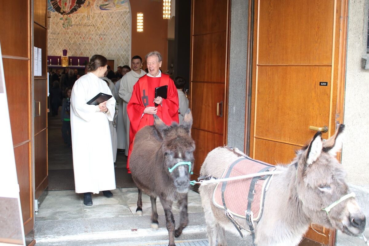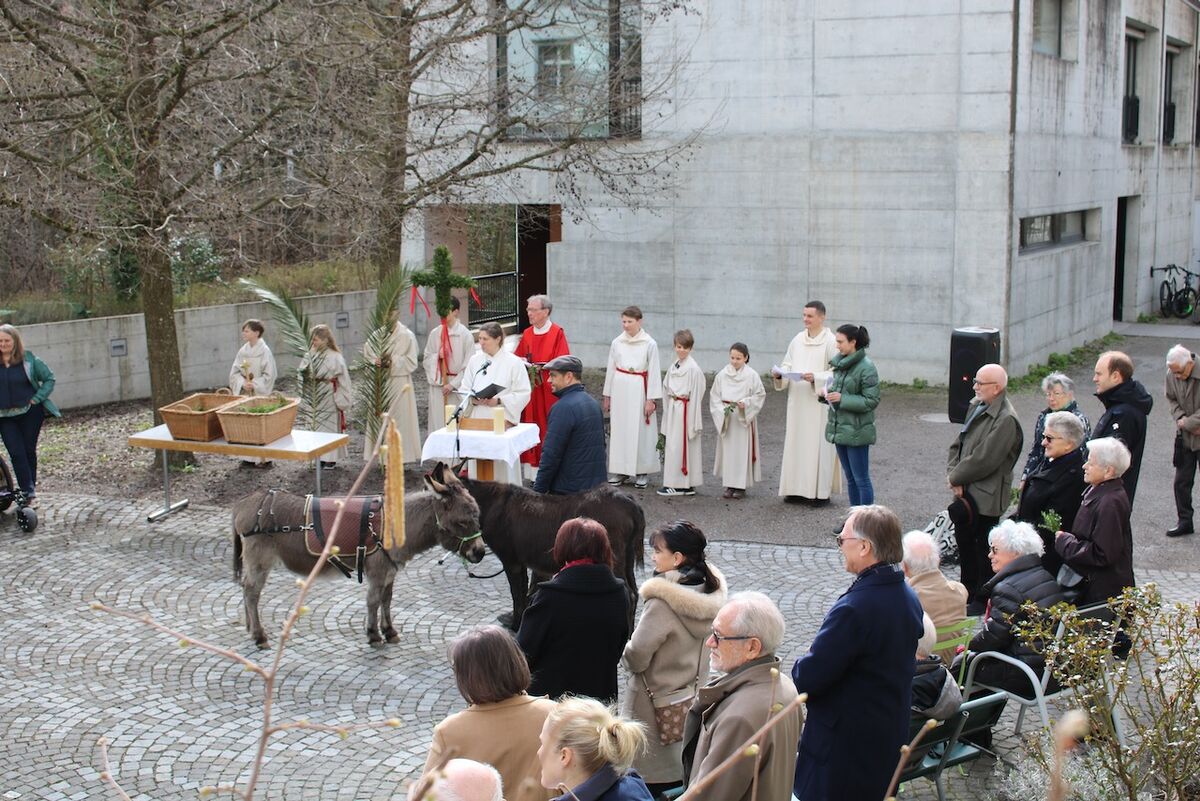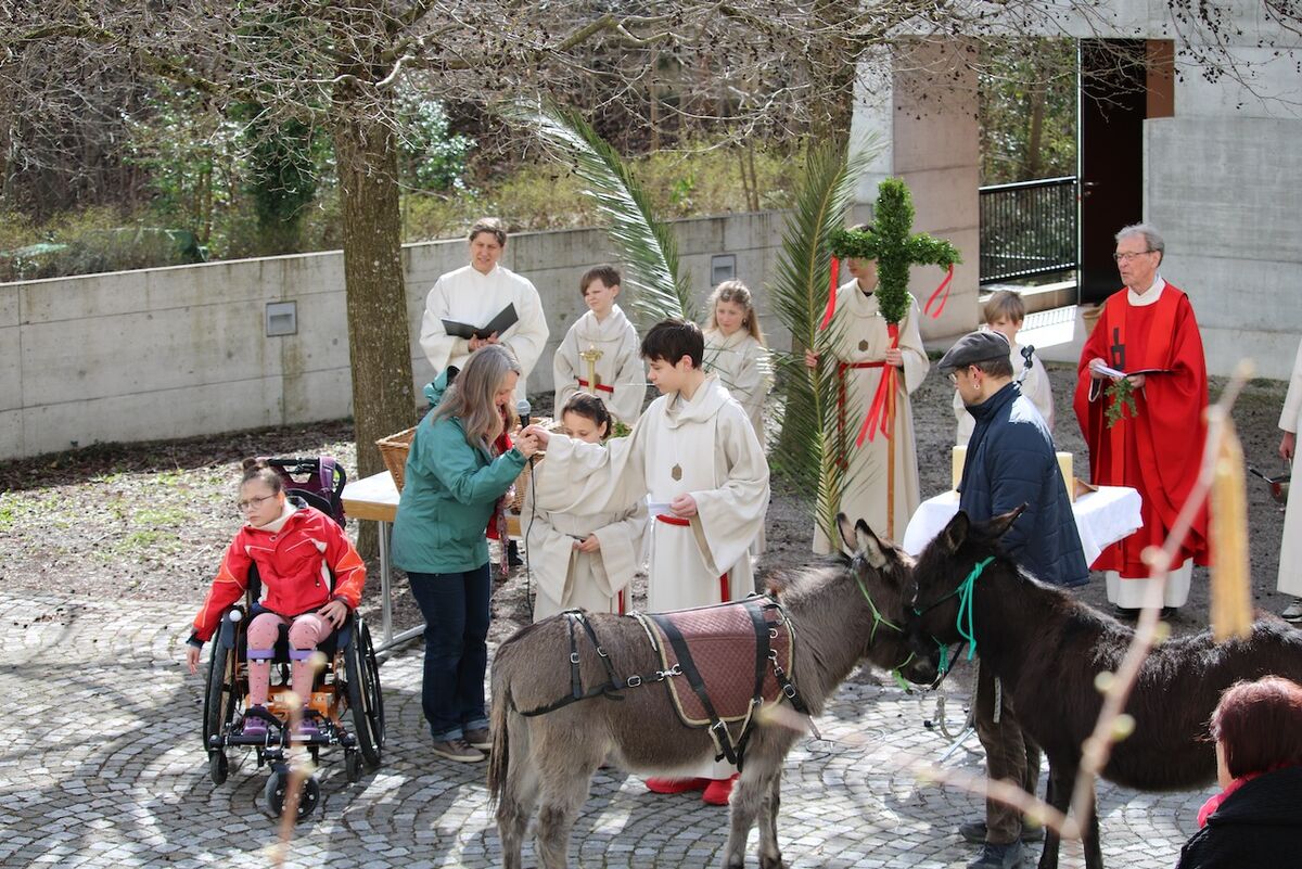Mit selber gebundenen Palmkreuzen und den Eseln der Familie Brändle-Benz von der Beckenhalden zogen wir in die Kirche St.Georgen ein und feierten die Ankunft von Jesus in Jerusalem.